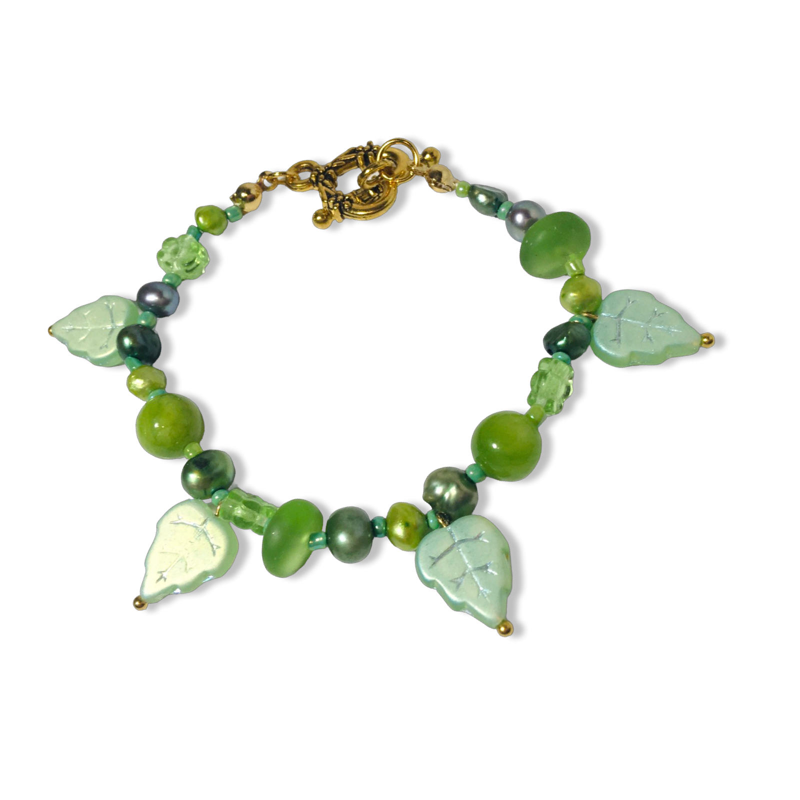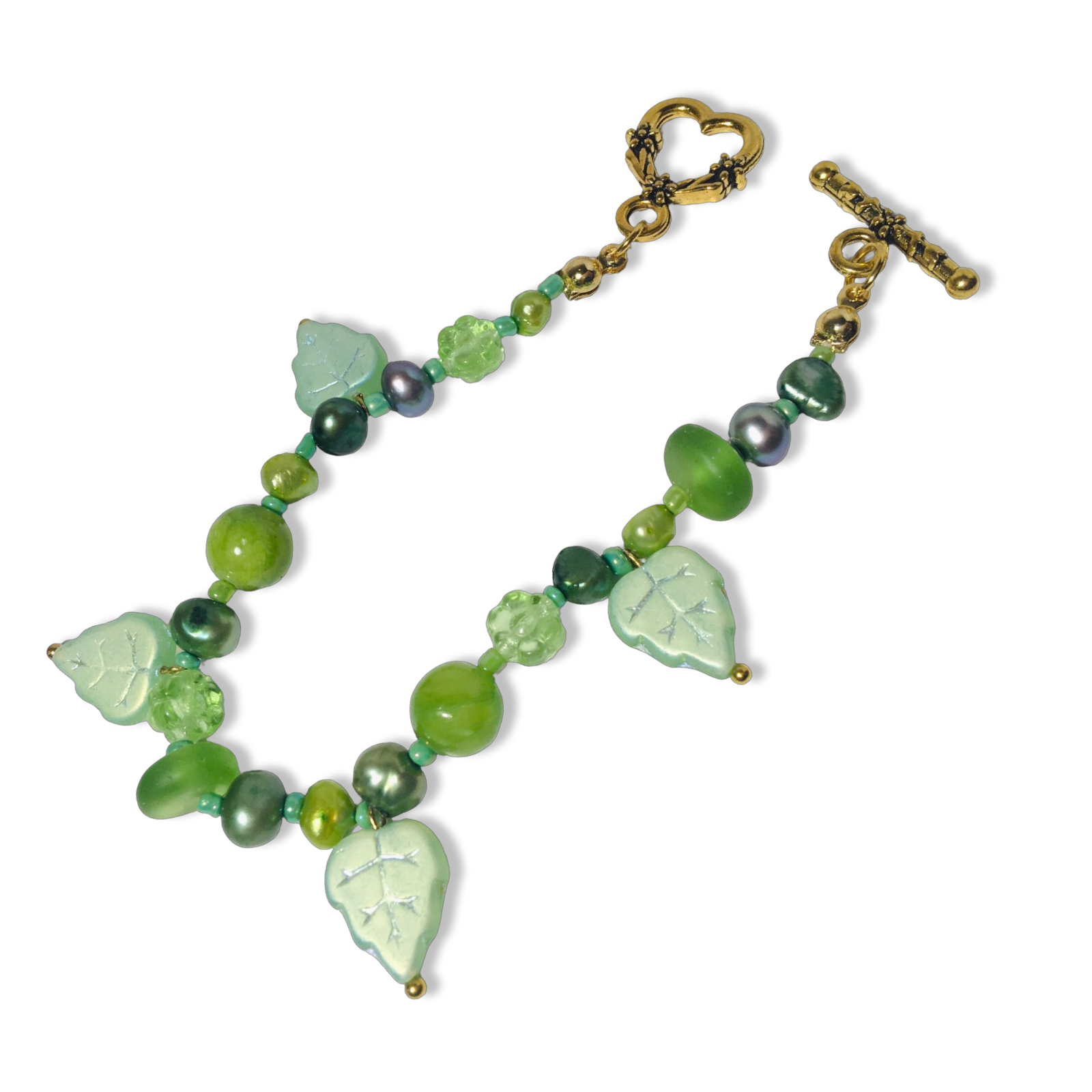 Materials: Quartz, dyed freshwater pearls in grass green and emerald, Czech glass leaves and flowers, glass seed beads, and green sea glass.