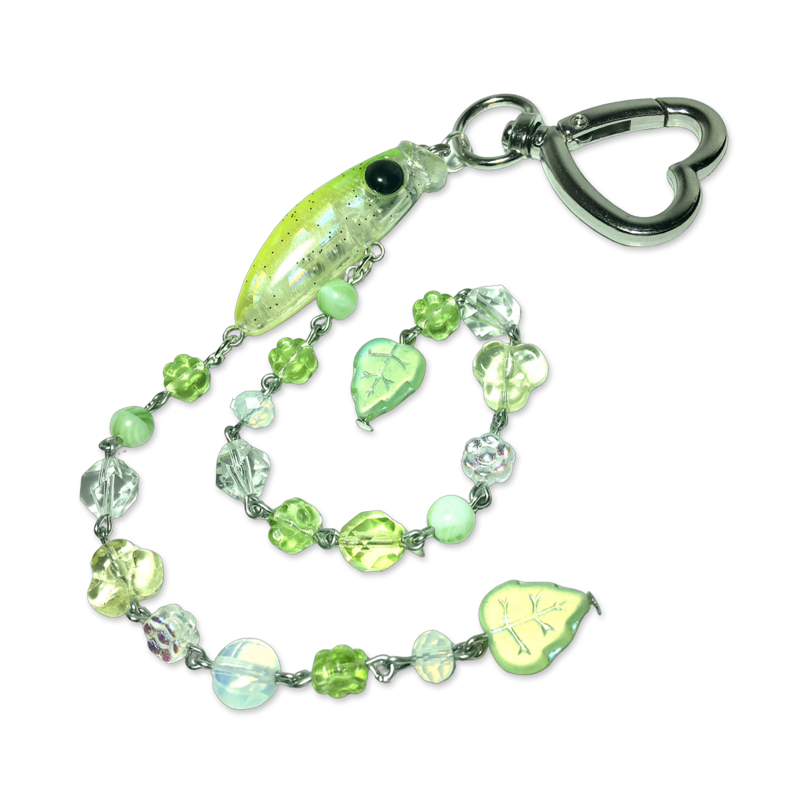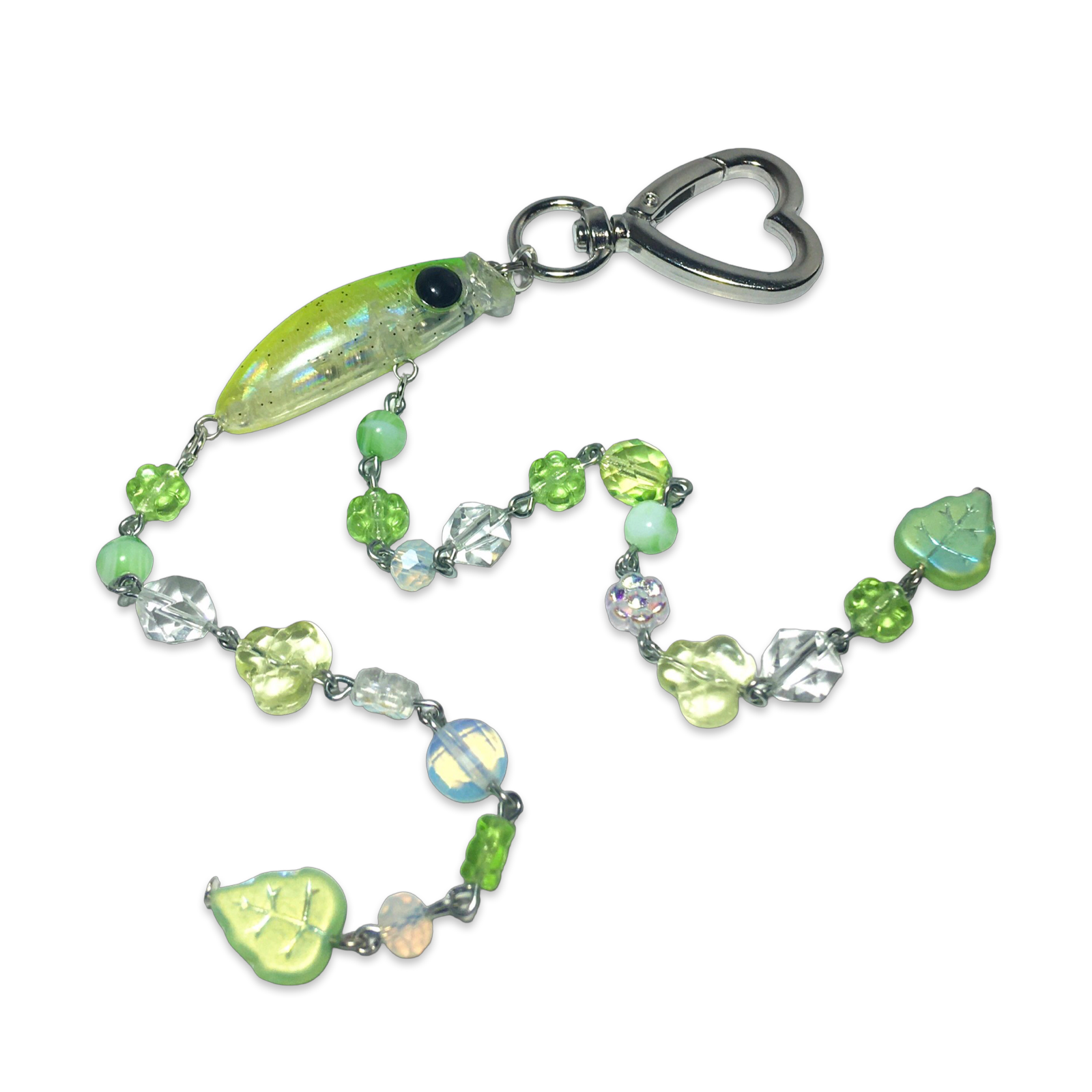 Materials: A translucent guppy fishing lure, a heart-carabiner clasp, clear quartz, Czech and opalite glass, and steel wire.