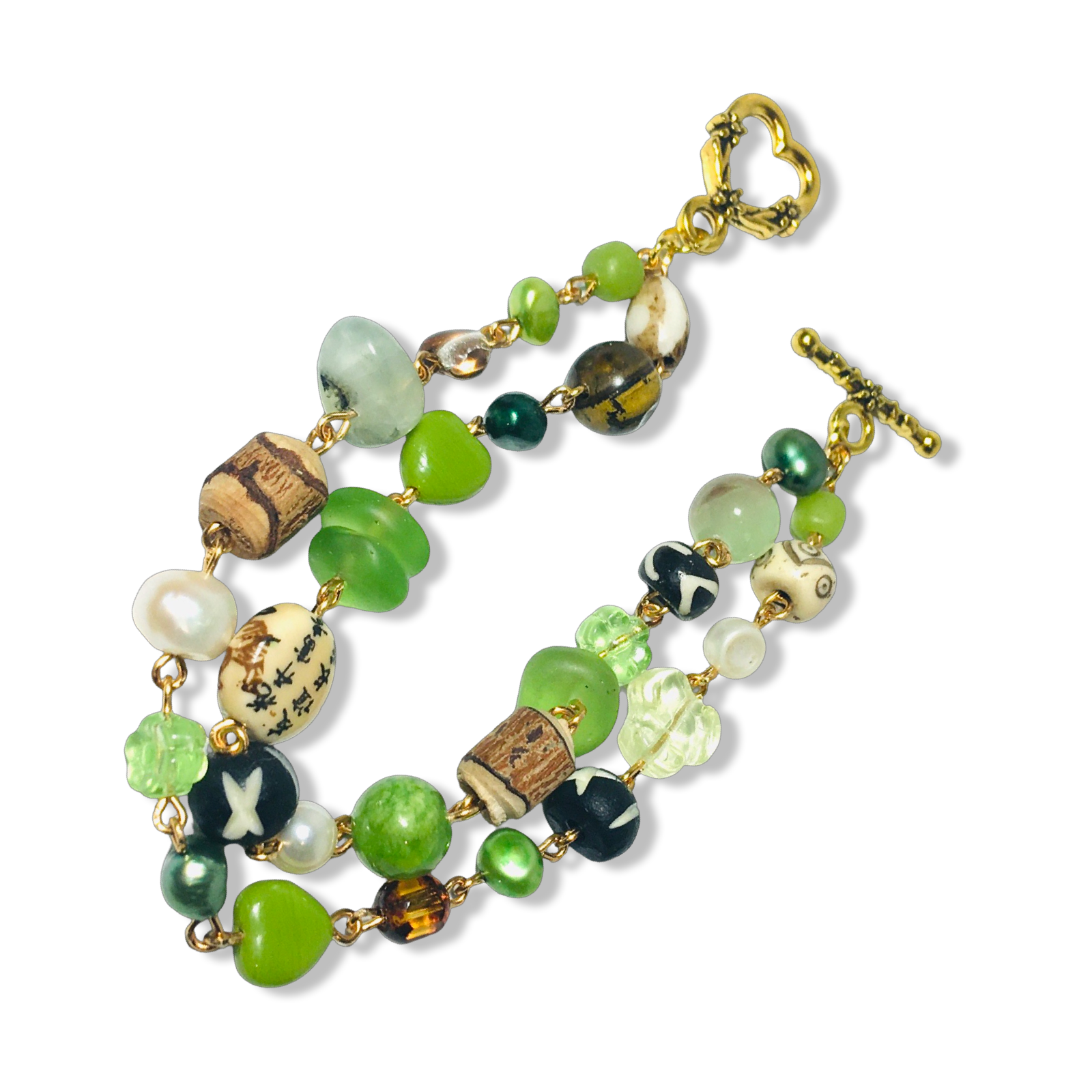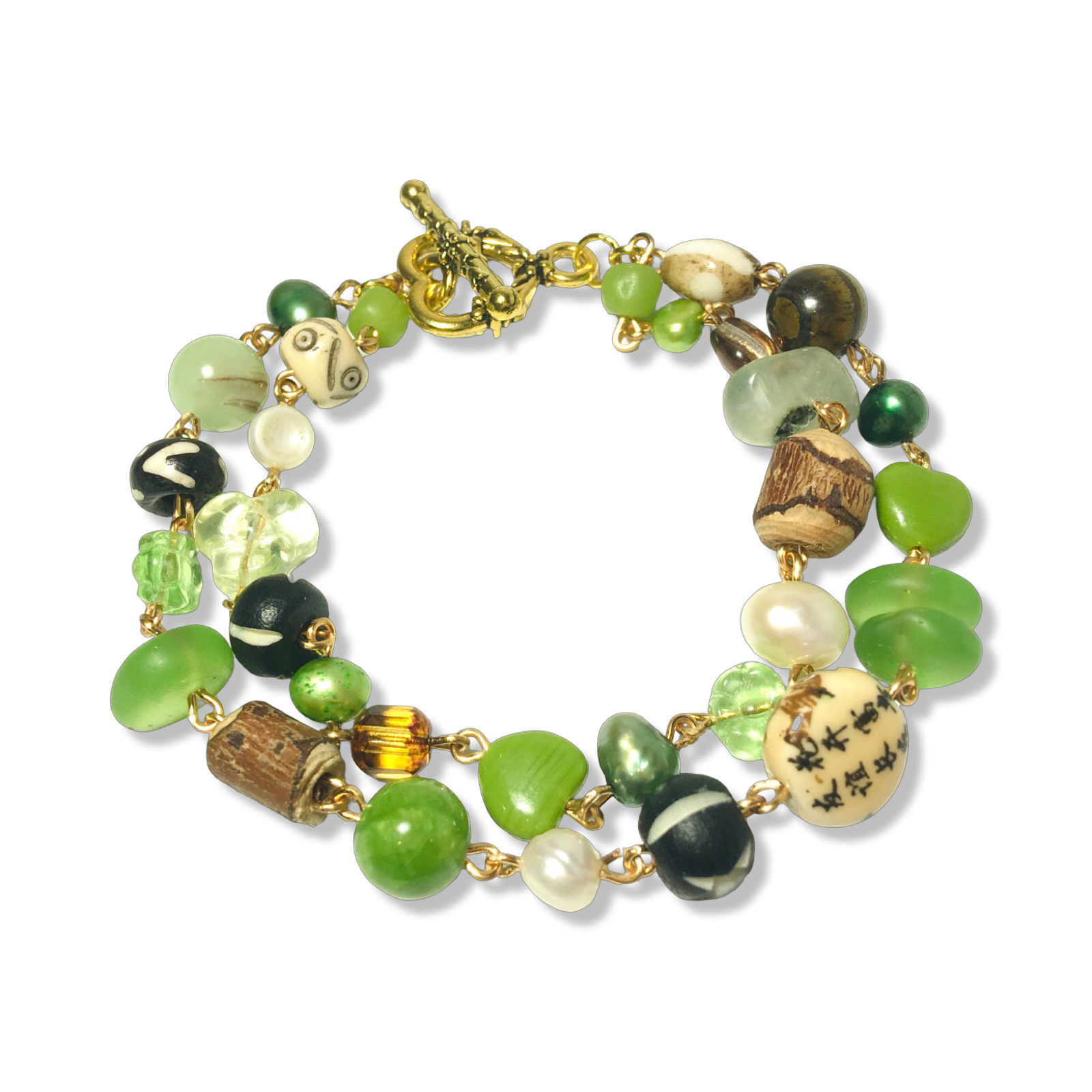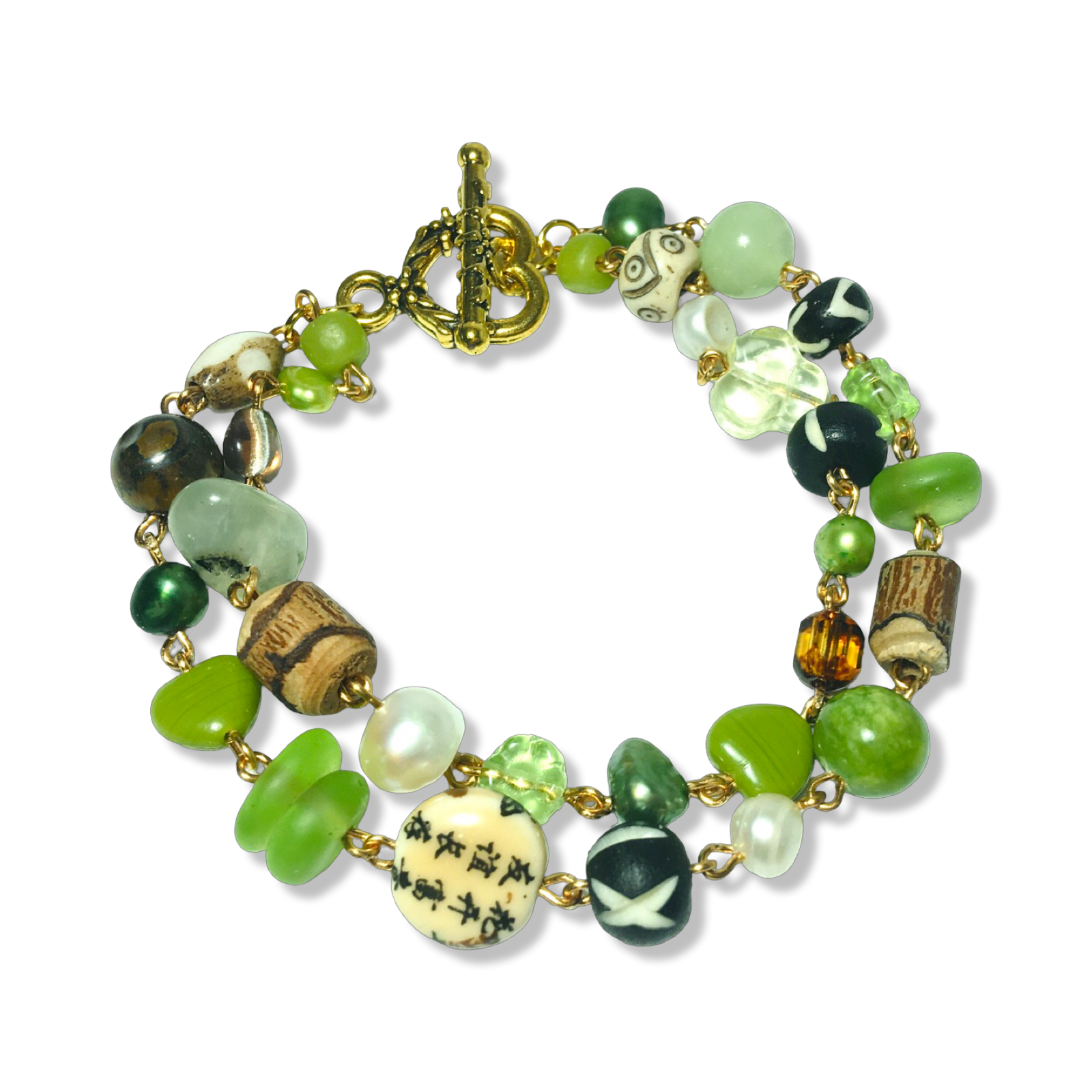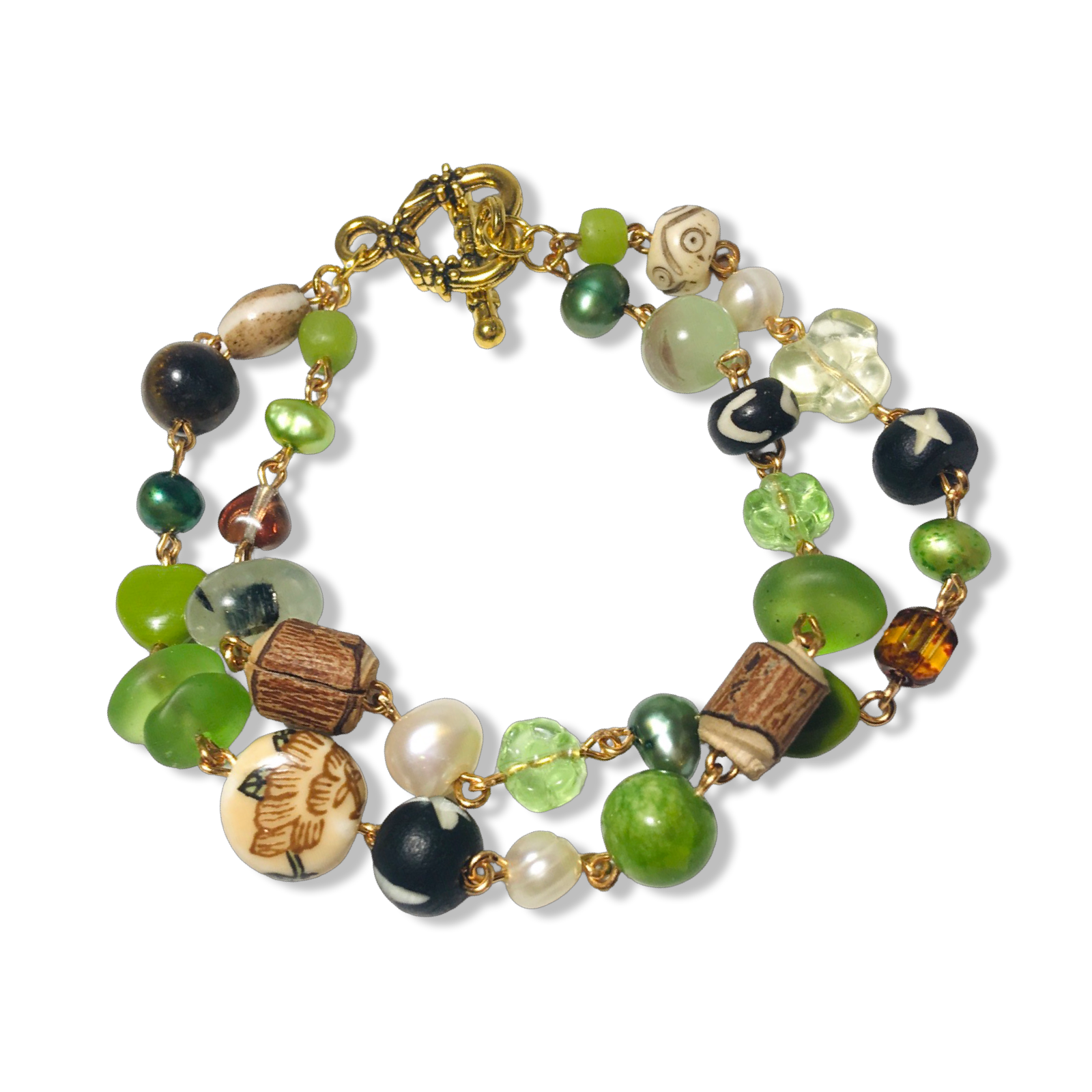 Materials: Sea glass, batik bones, wood, freshwater pearls in ivory, emerald, and grass green, prehnite, tigerseye, quartz, Czech glass beads, dyed quartz, a ceramic calligraphy tile round, and brass wire.
