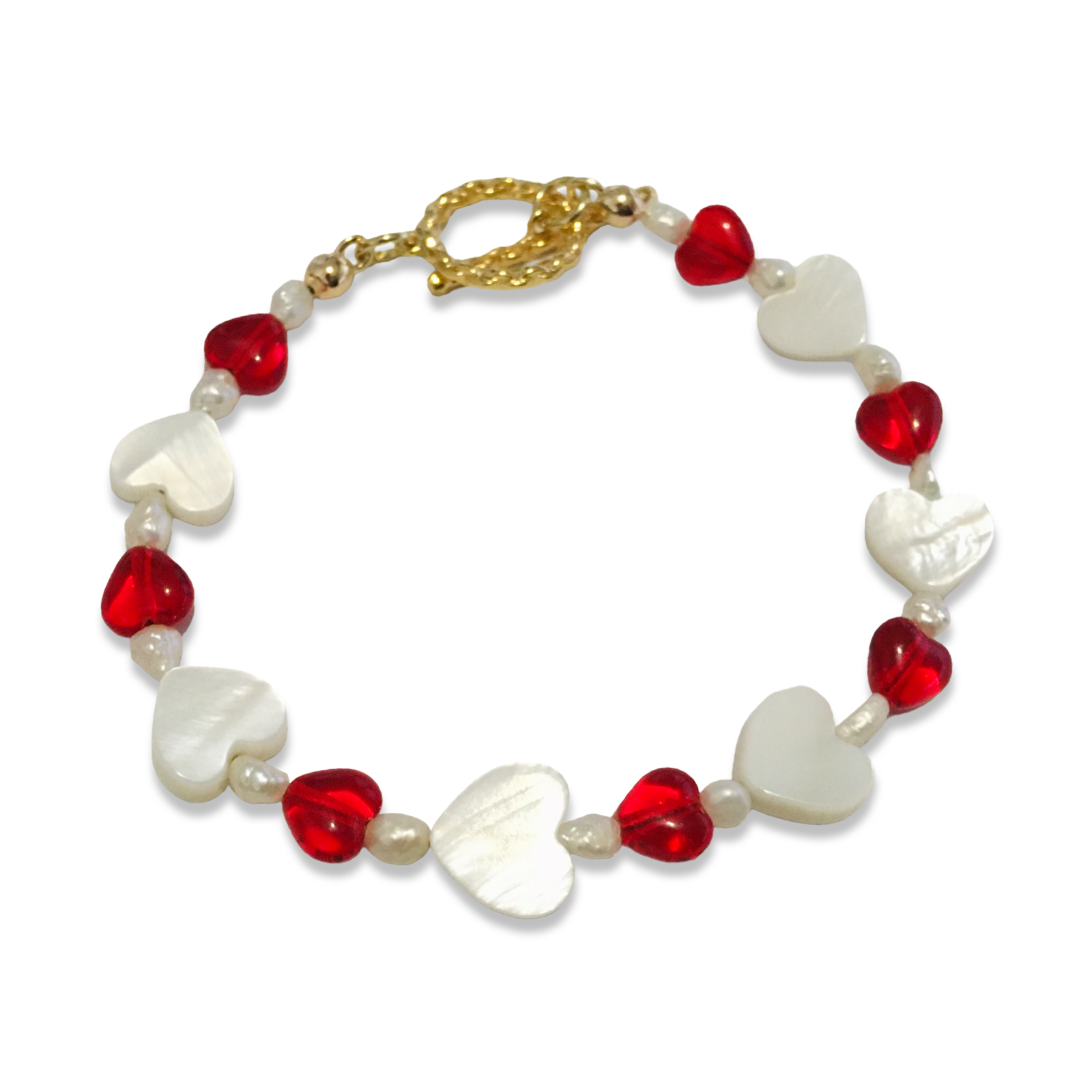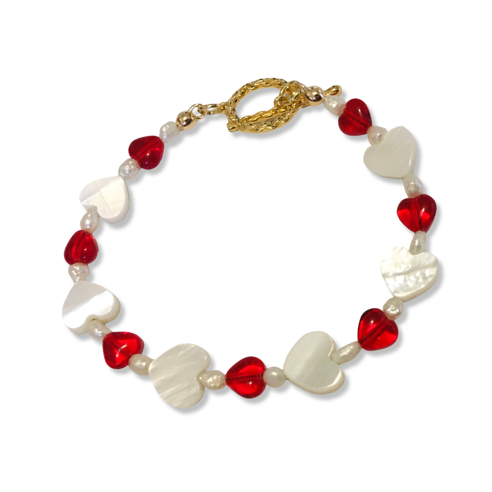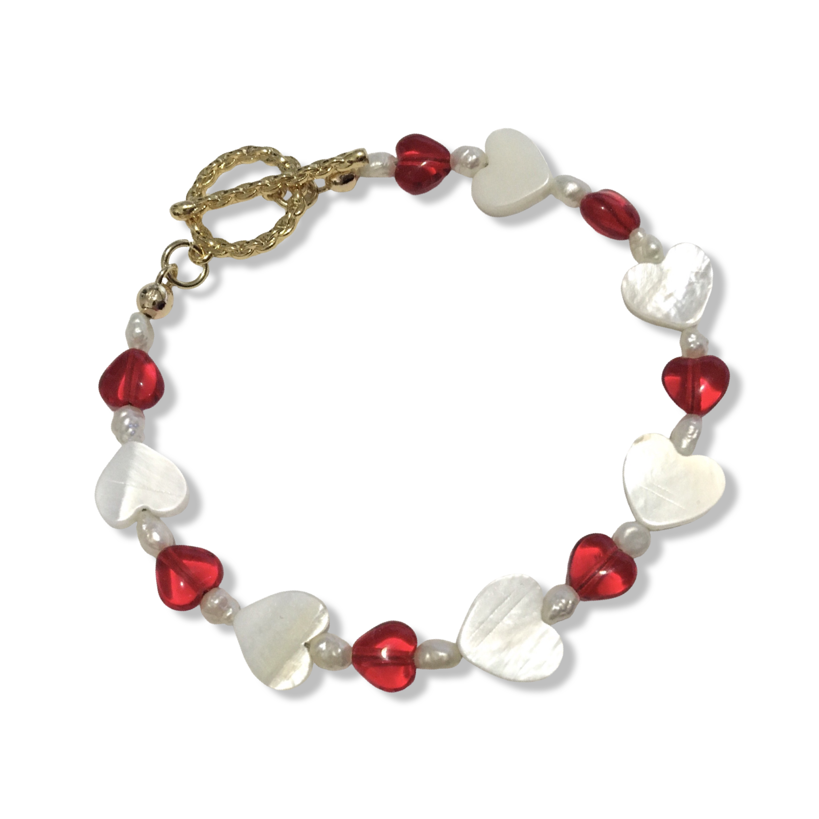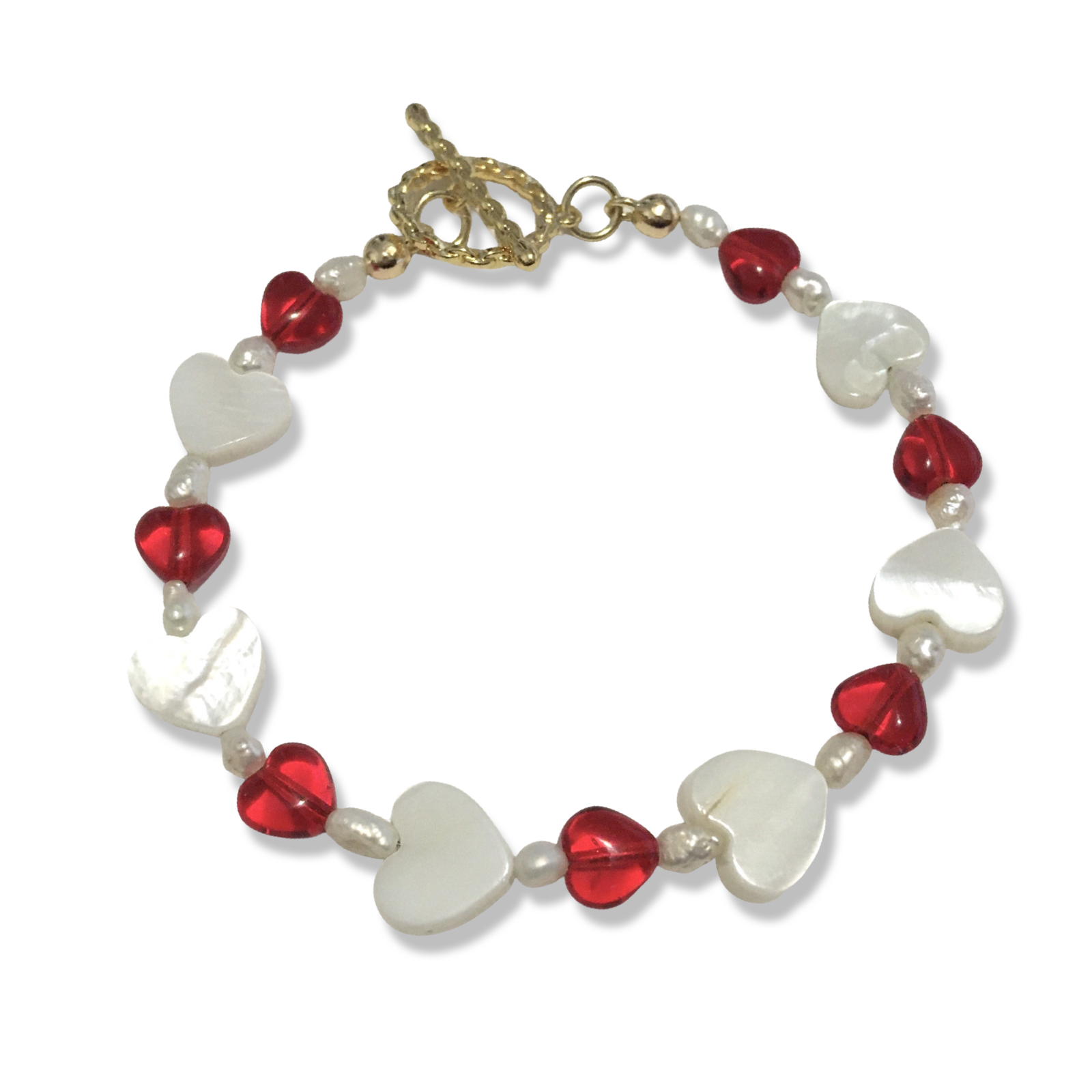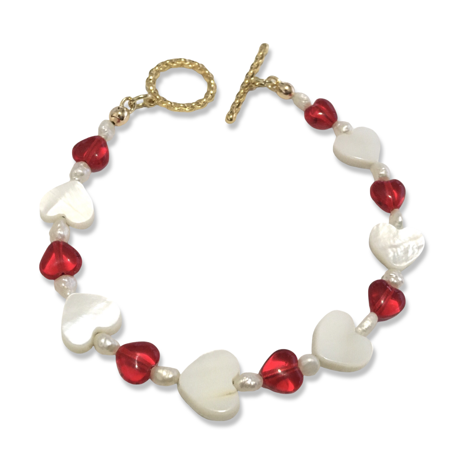 A handmade bracelet featuring a string of Czech glass and shell hearts