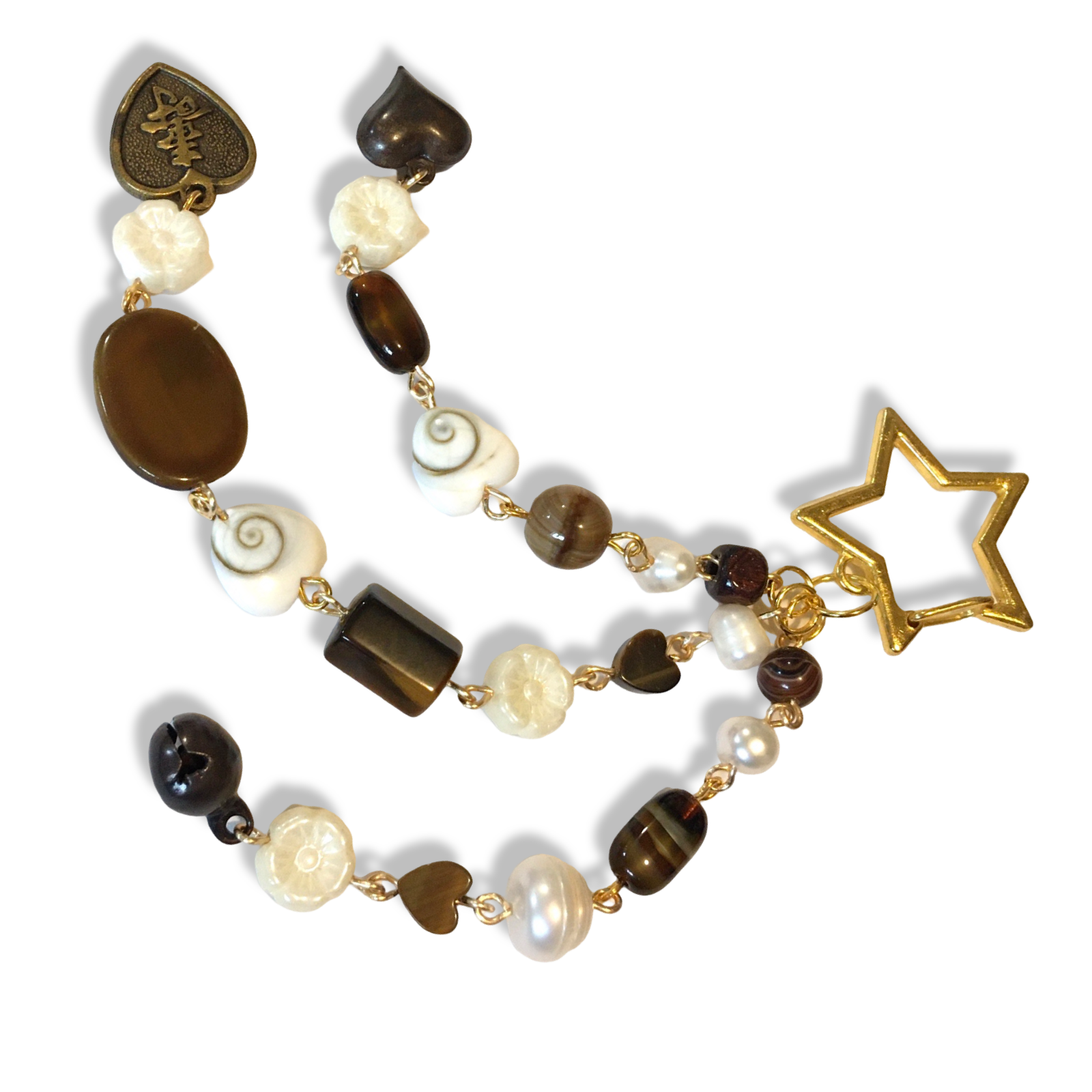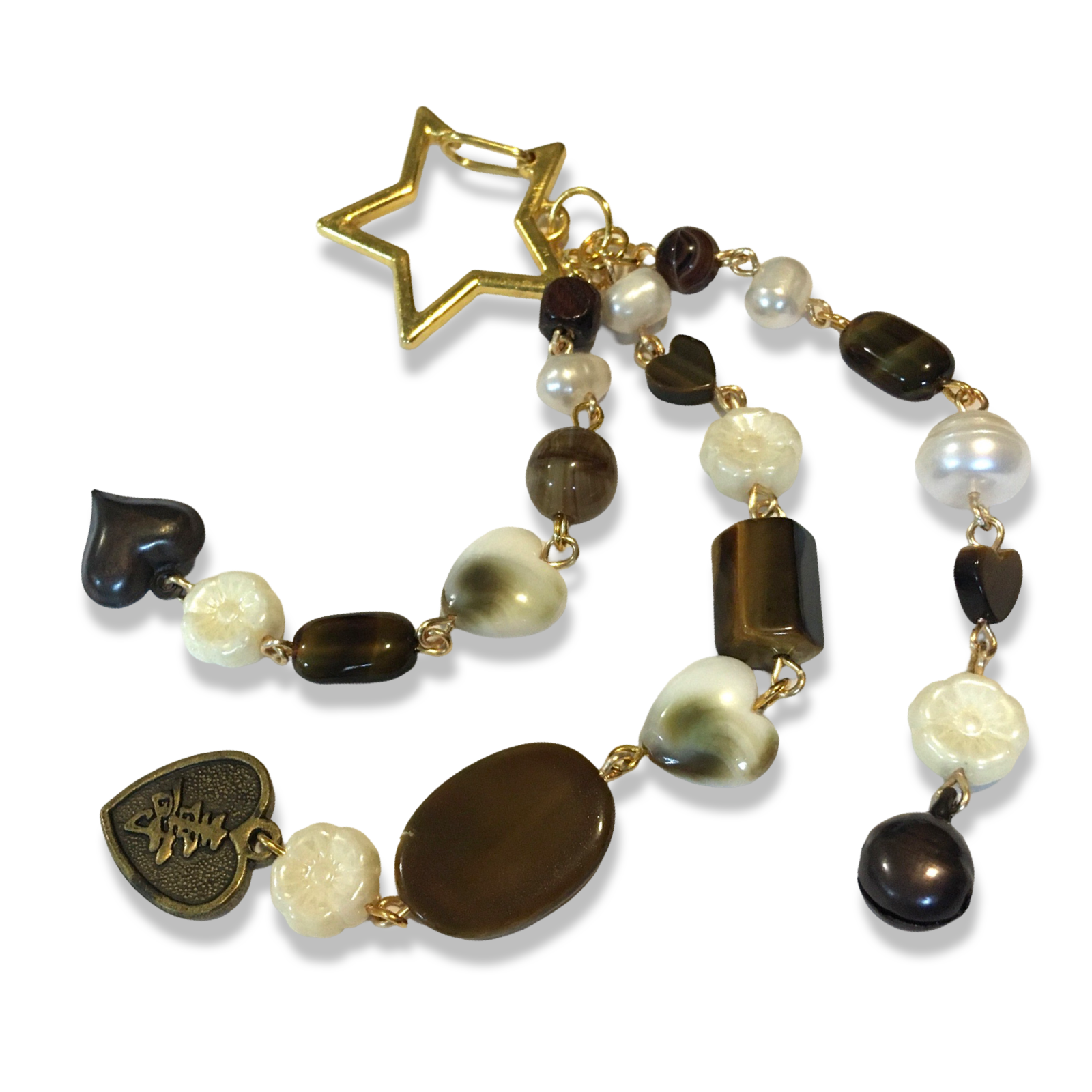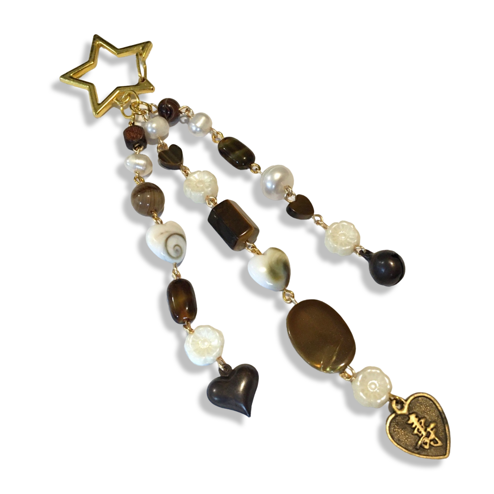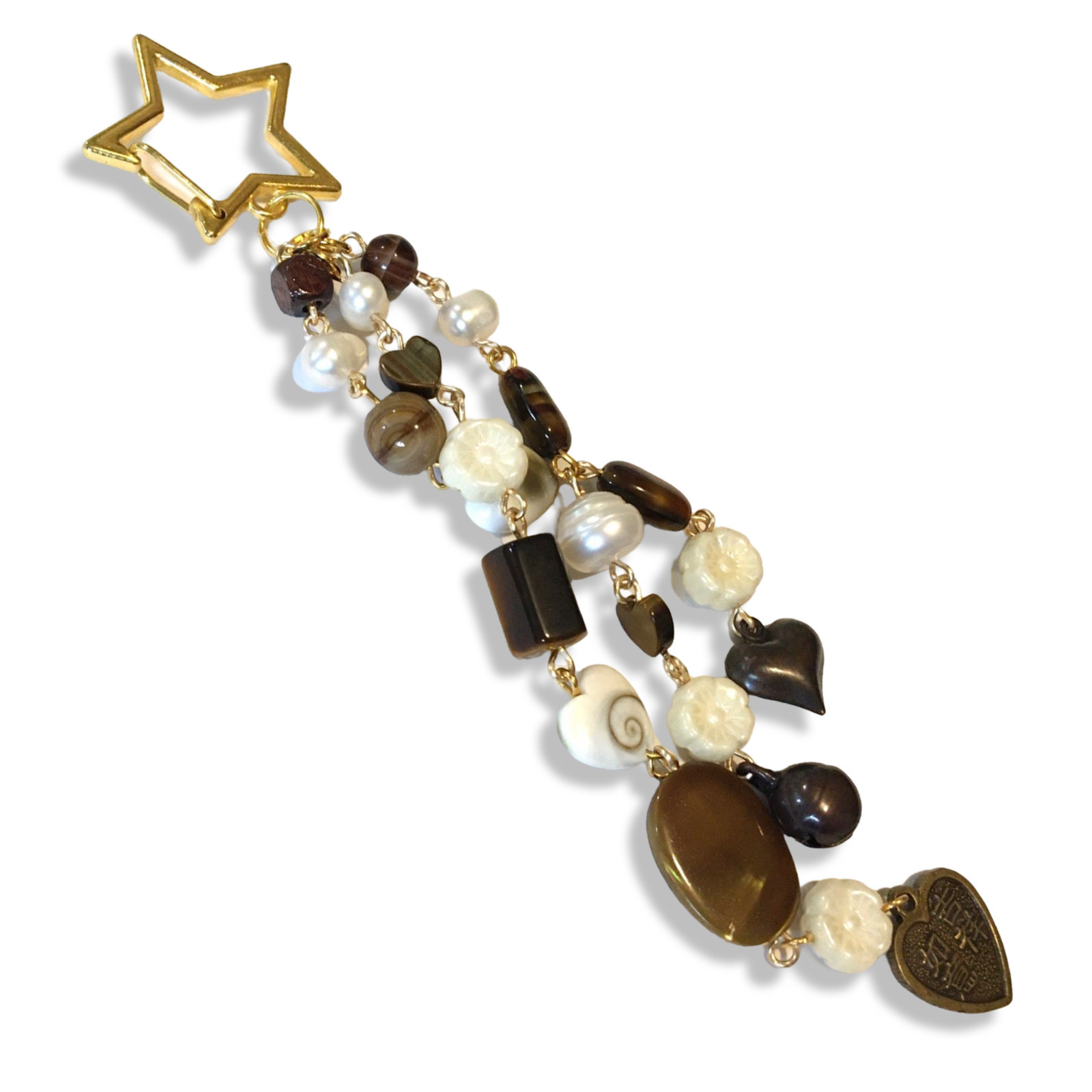 A star-carabiner keychain in a sweet ivory and chocolate palette! It features Shiva shell hearts, Czech glass flowers, freshwater pearls, assorted glass and stone beads, and salvaged vintage charms and bells.