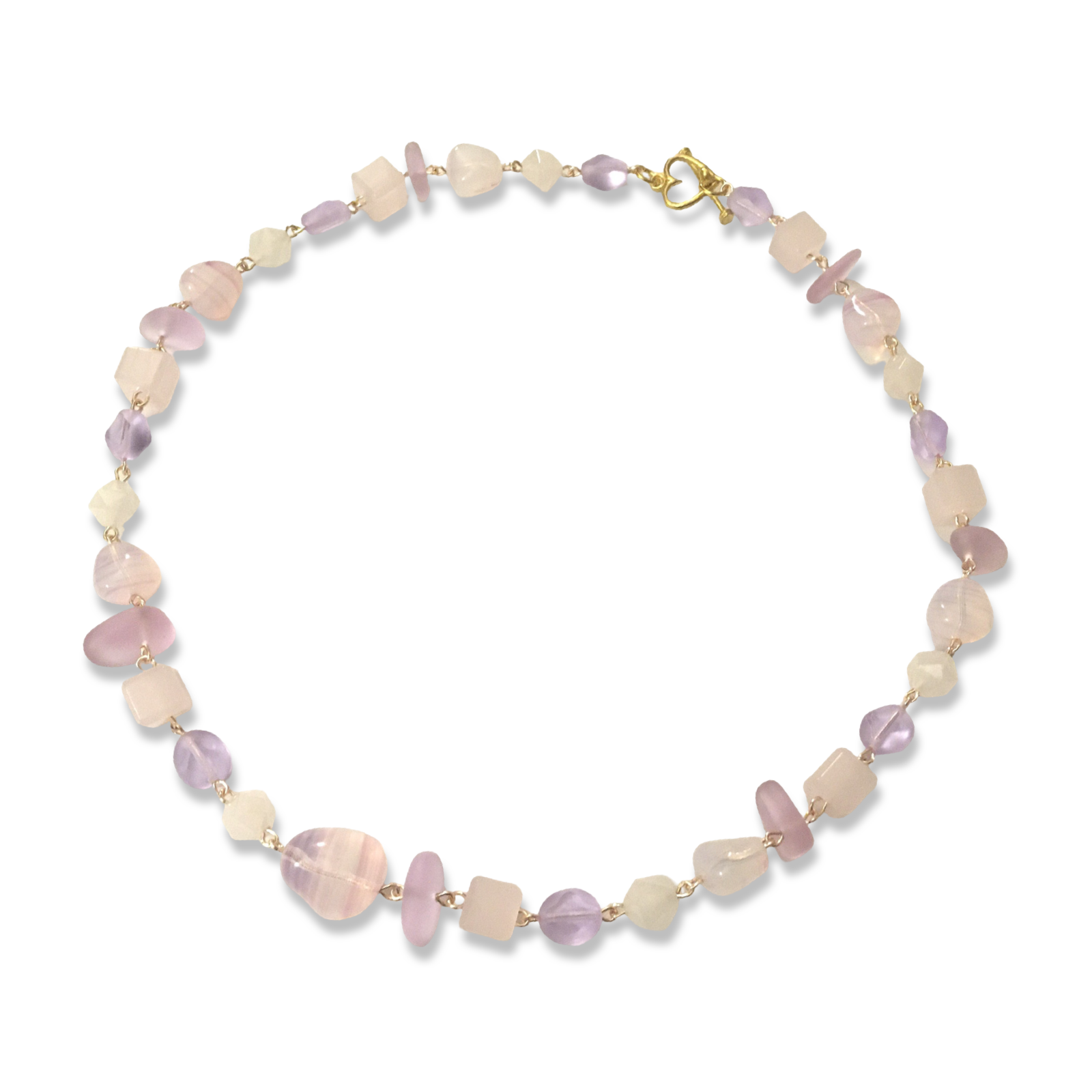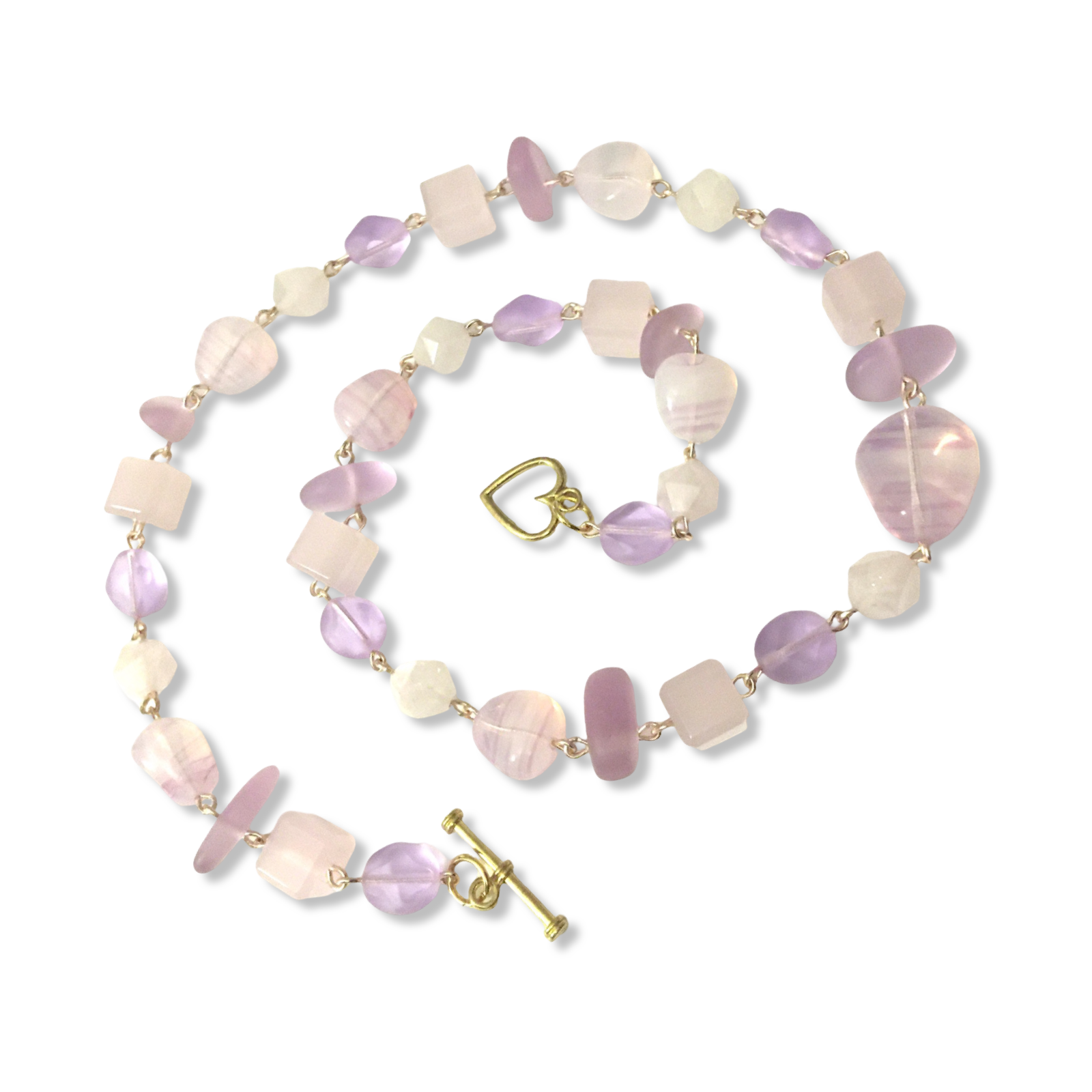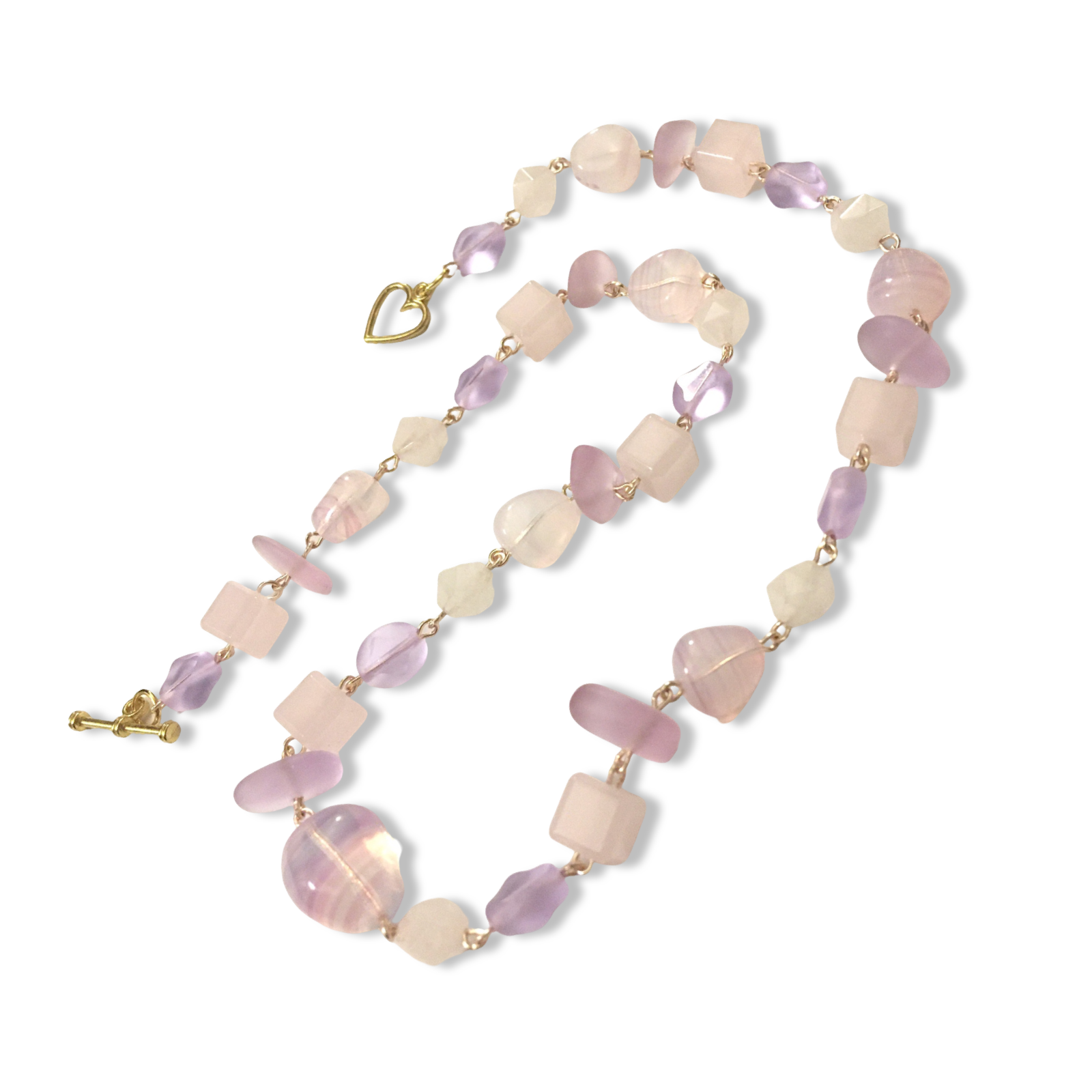 Materials: Rose quartz, pale mauve sea glass, pink milk glass cubes, Czech glass beads, and gold-plated wire.