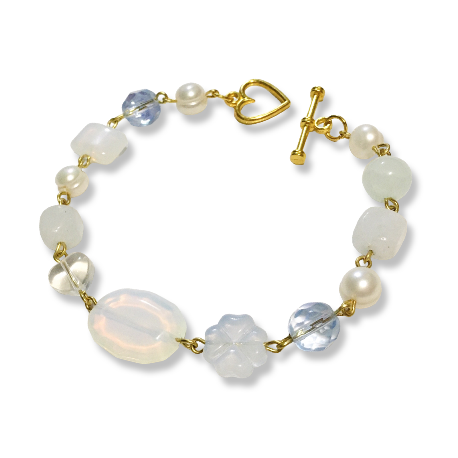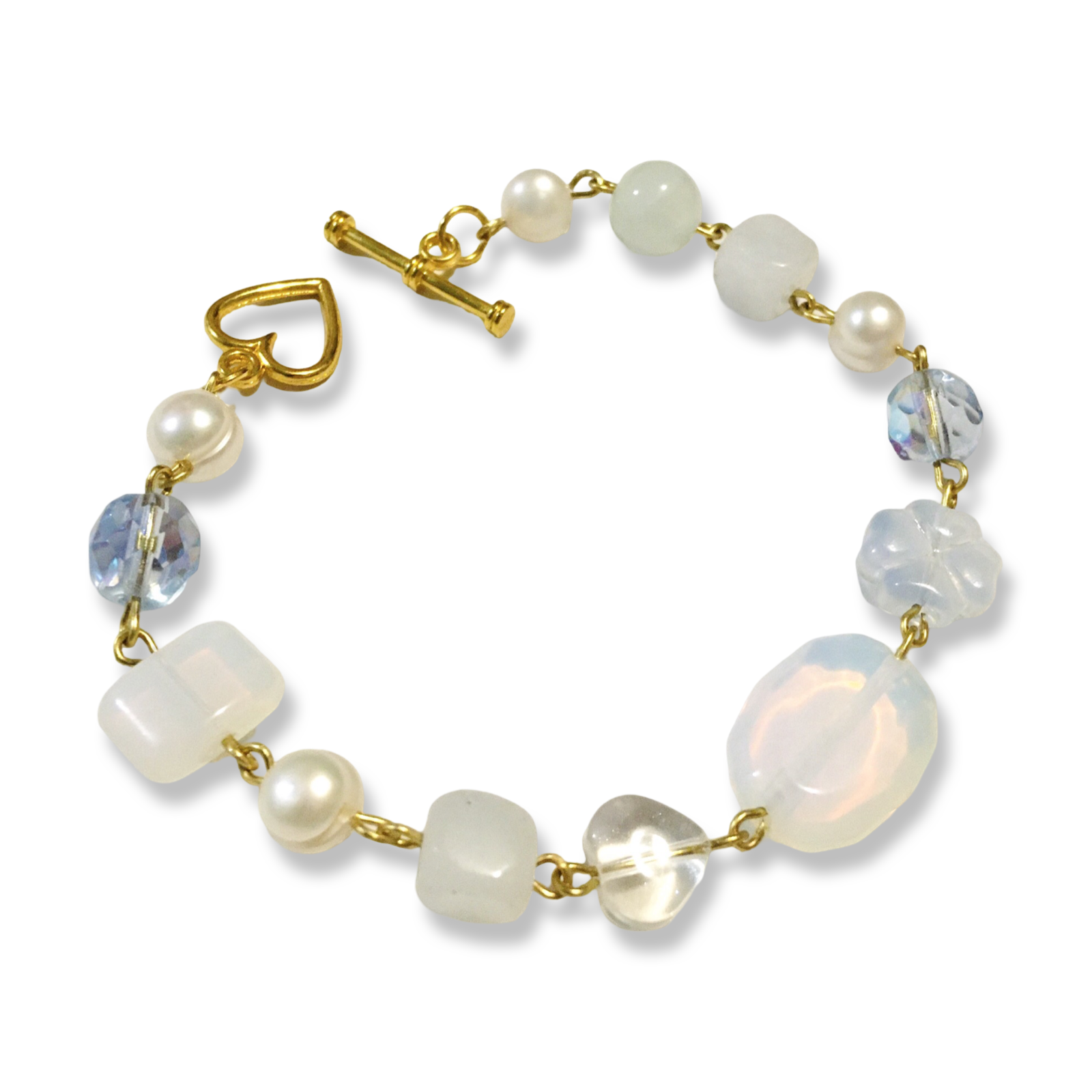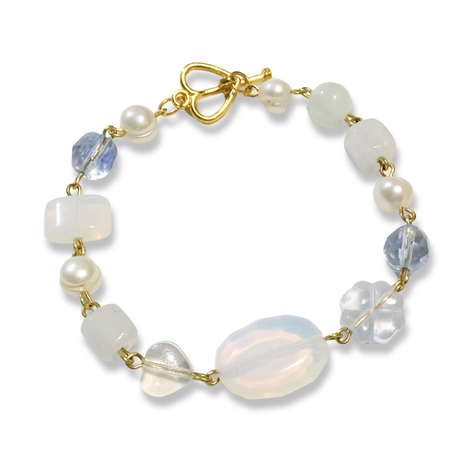 A handmade bracelet in the colors of a cloudy sky. It features white freshwater pearls, and an assortment of Czech glass and stone beads.