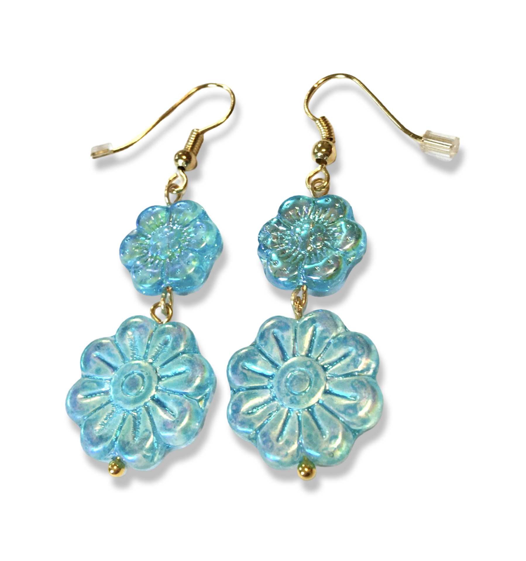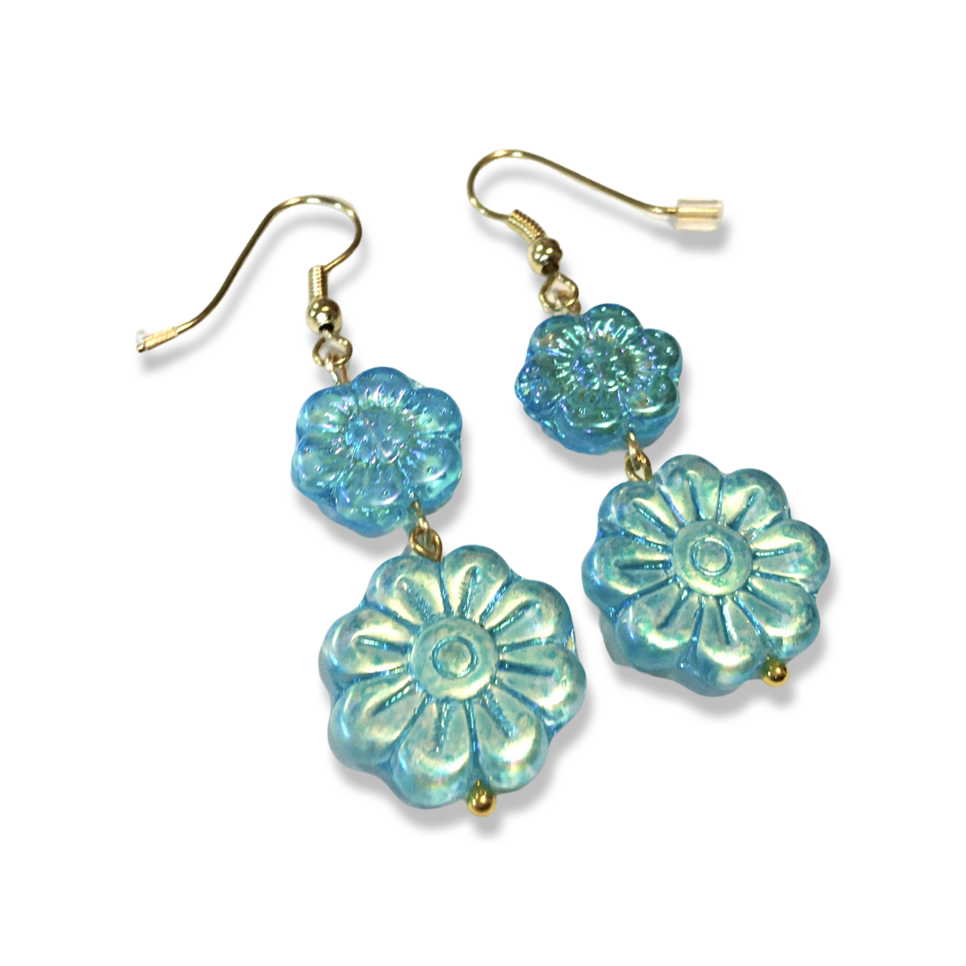 A pair of simple earrings featuring iridescent Czech glass flowers in a bright sea blue.