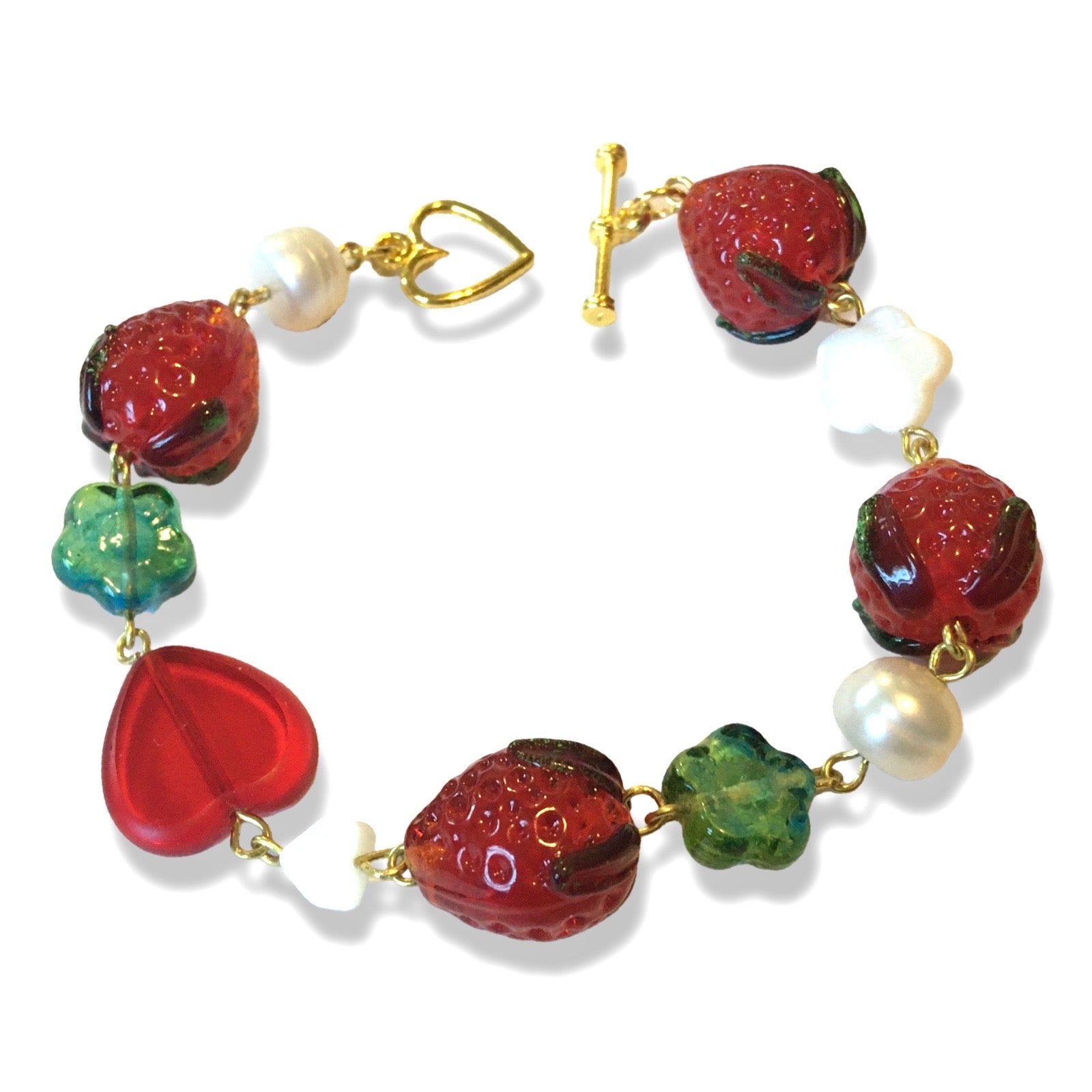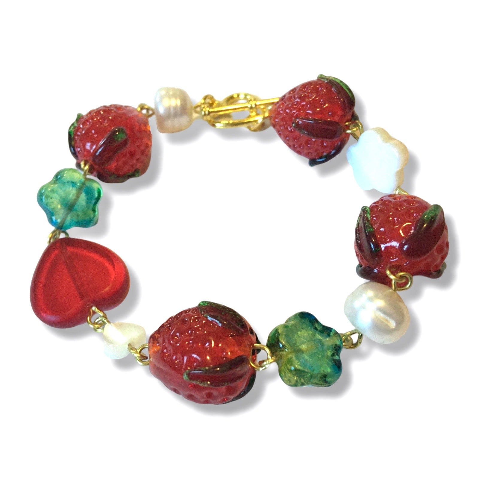A handmade bracelet featuring Czech glass strawberries and flowers, touches of shell beads, and cream freshwater pearls. Free US shipping!