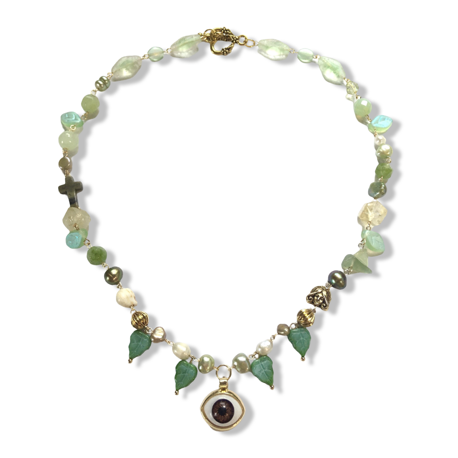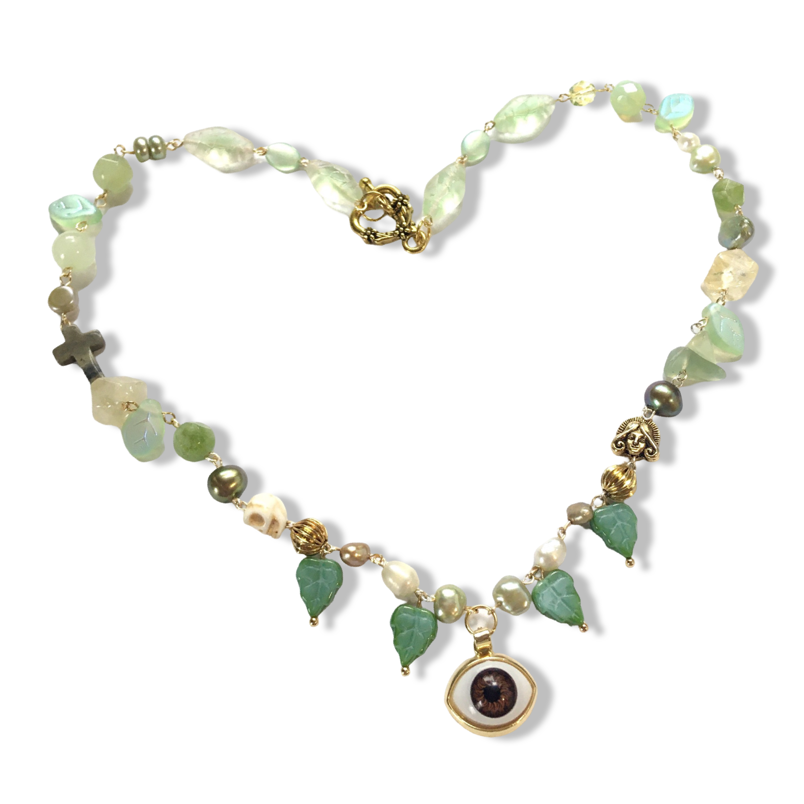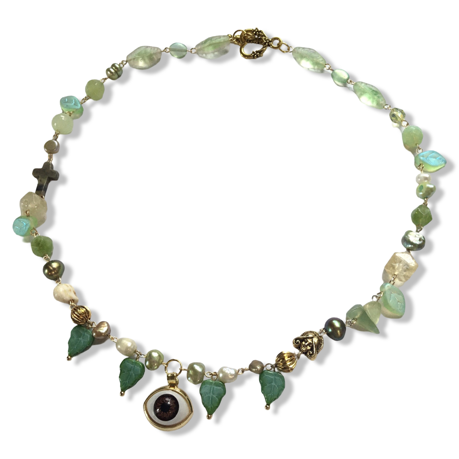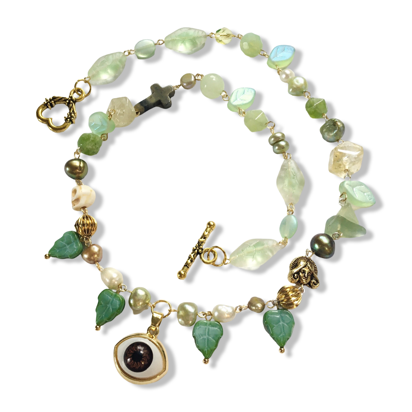 An ornate, handmade, 18" necklace featuring gold plated metal charms, semiprecious stones, freshwater pearls, Czech glass leaves and beads, and a salvaged eye pendant. Free US shipping.