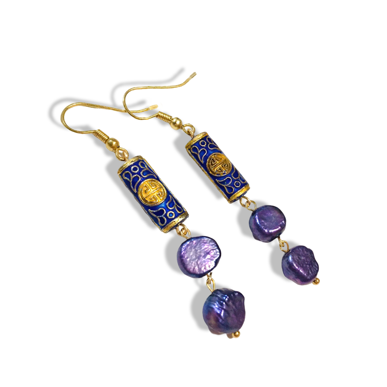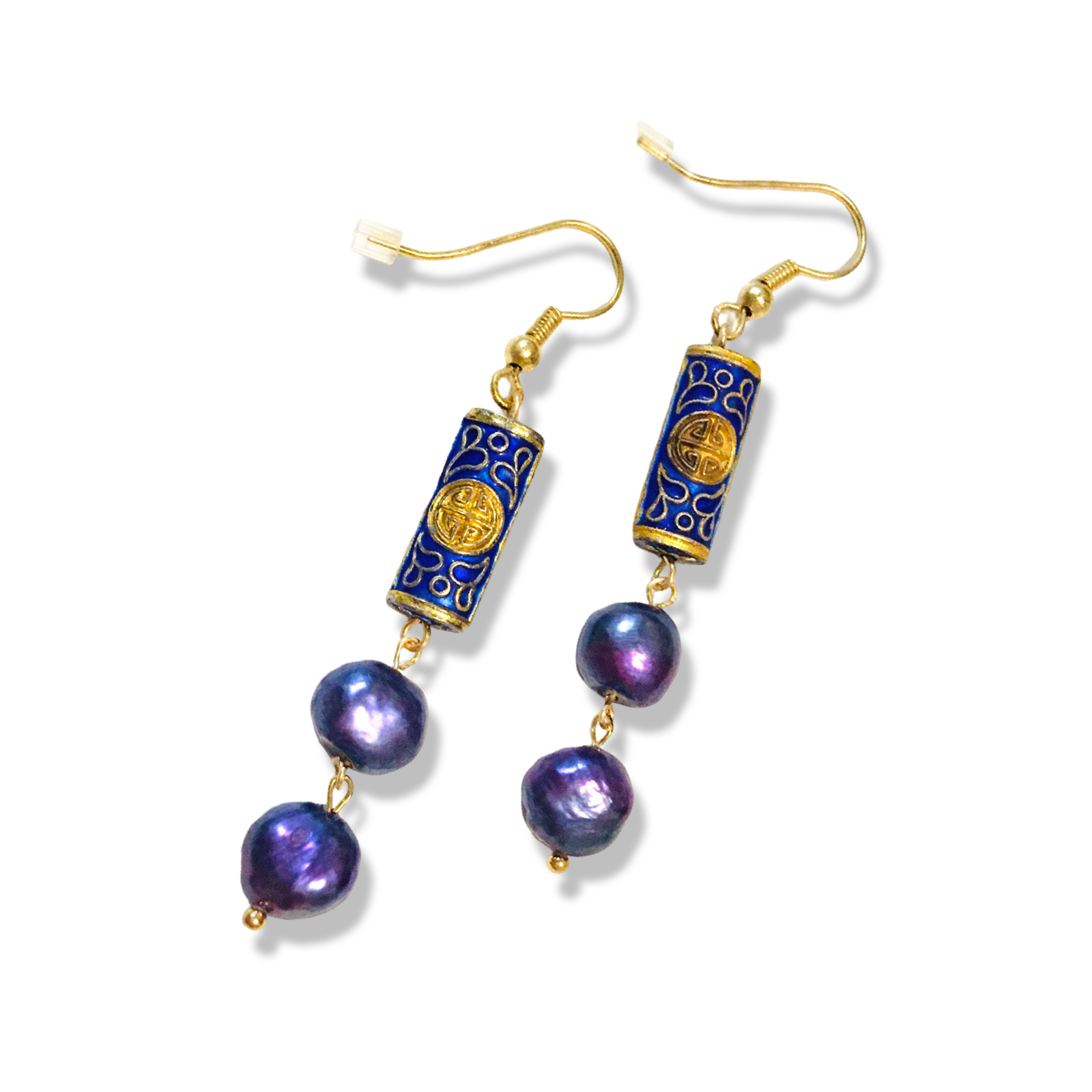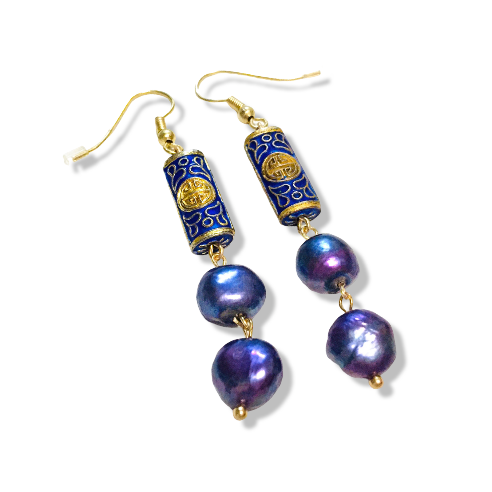A pair of simple hook earrings featuring deep blue Cloisonné beads and Iris freshwater pearls. Named aptly after the Purple Emperor butterfly.
