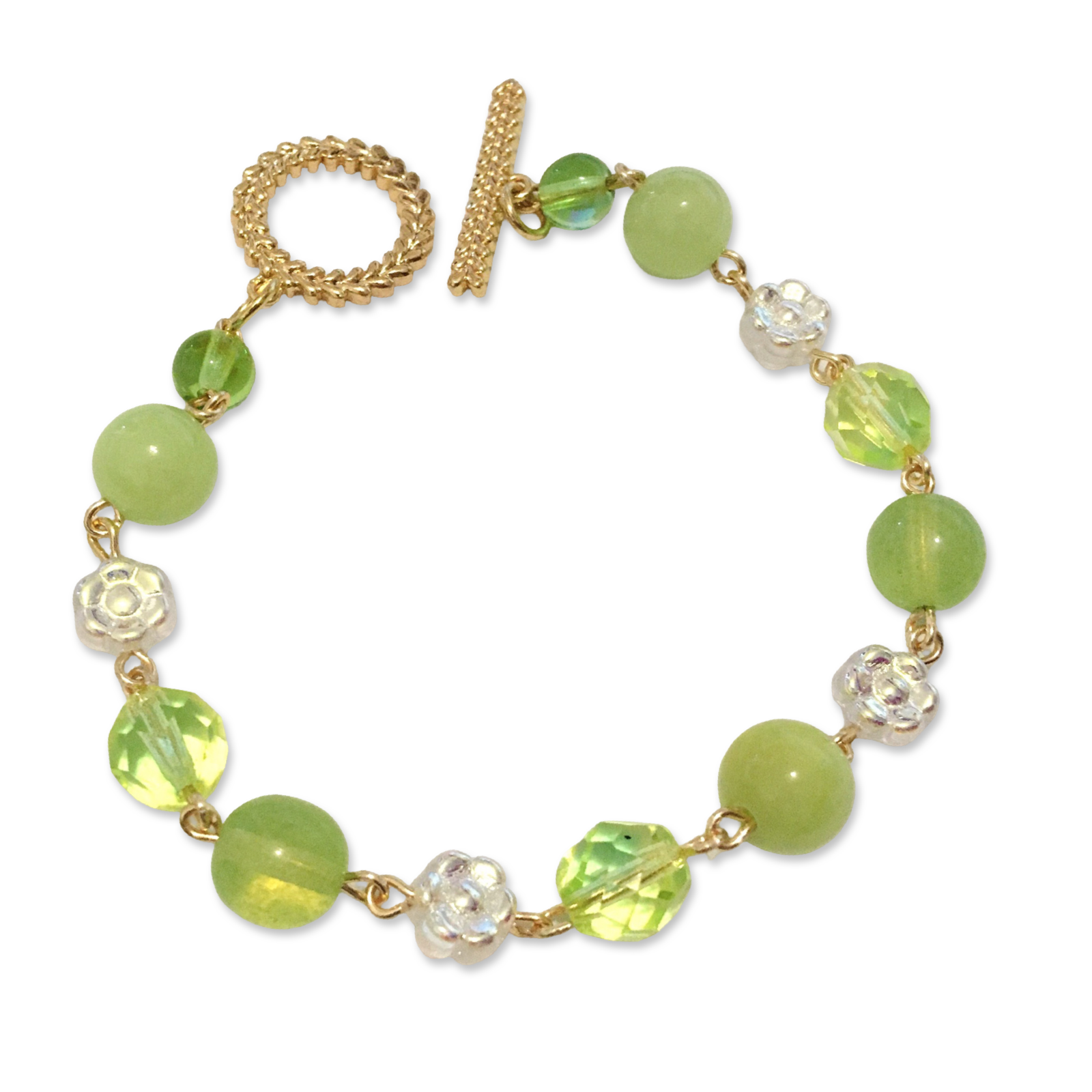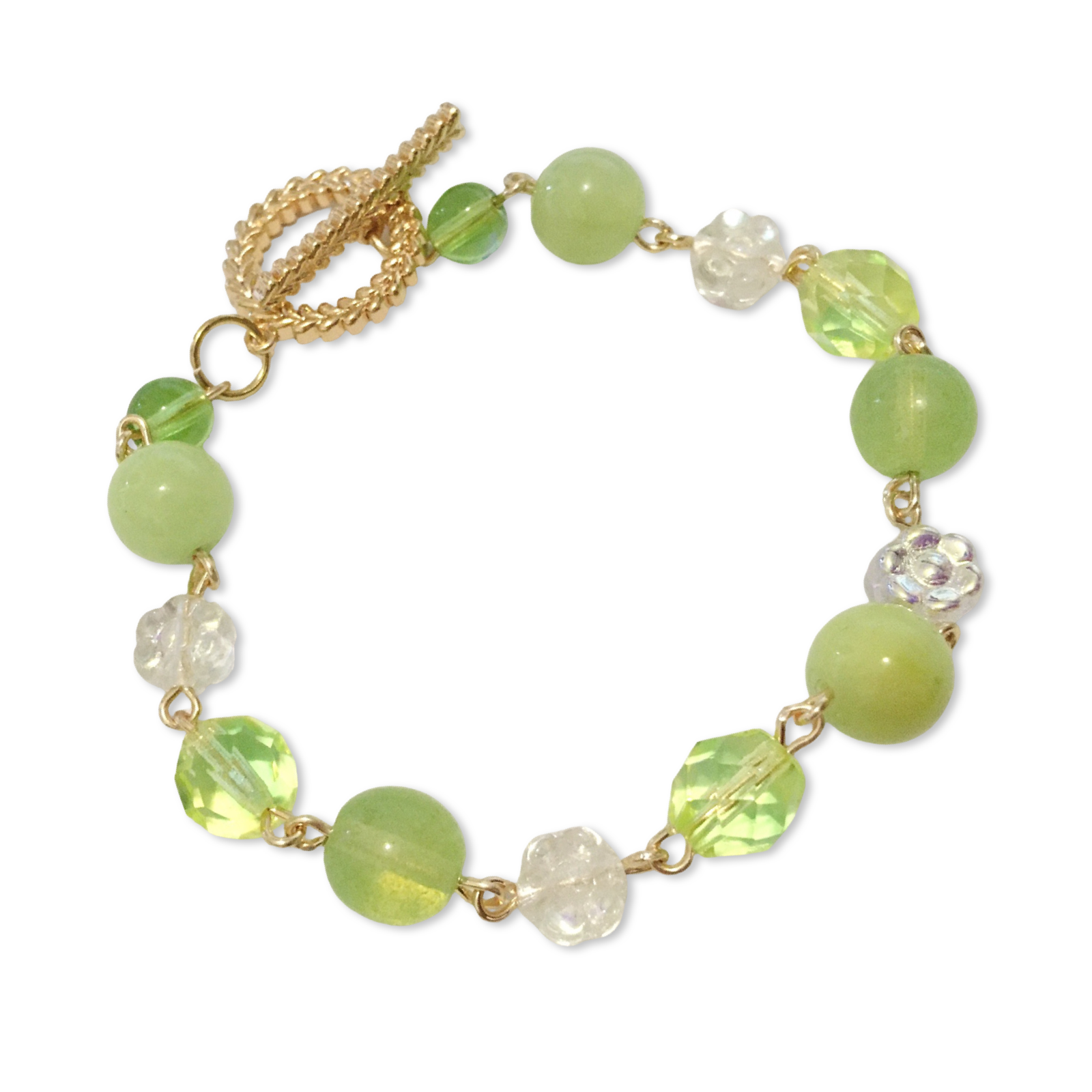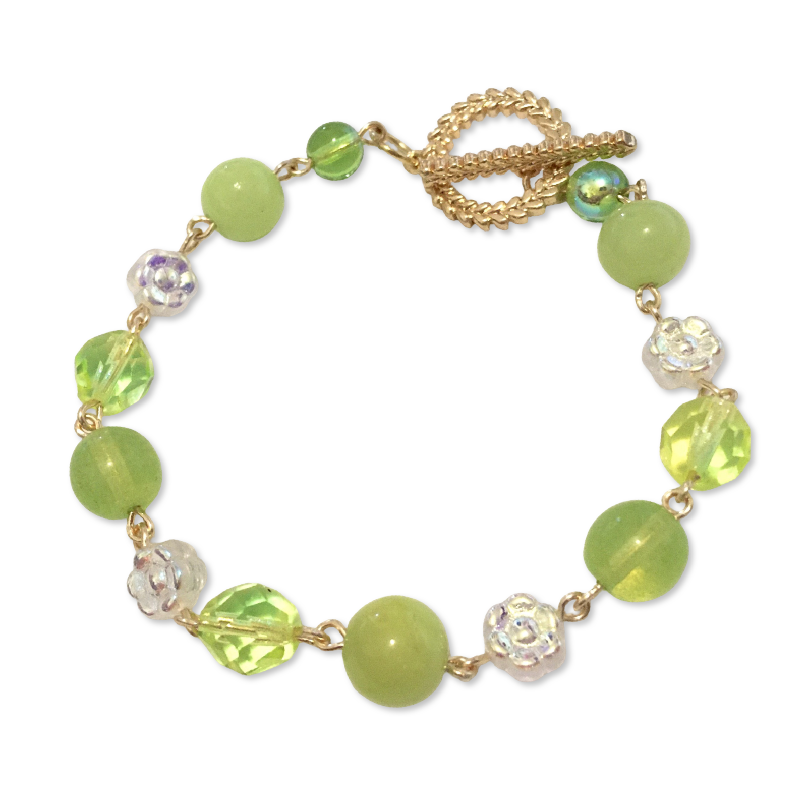 A handmade bracelet featuring stone and Czech glass beads in soft spring greens, and little prismatic glass flowers in white.