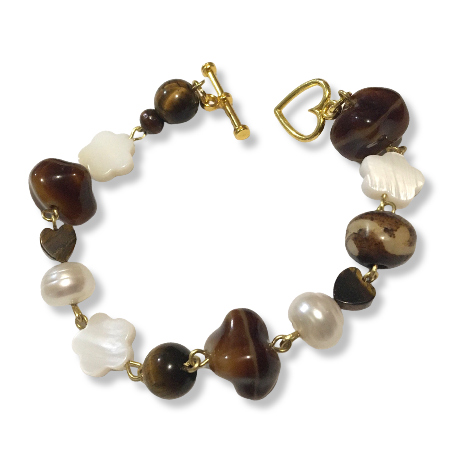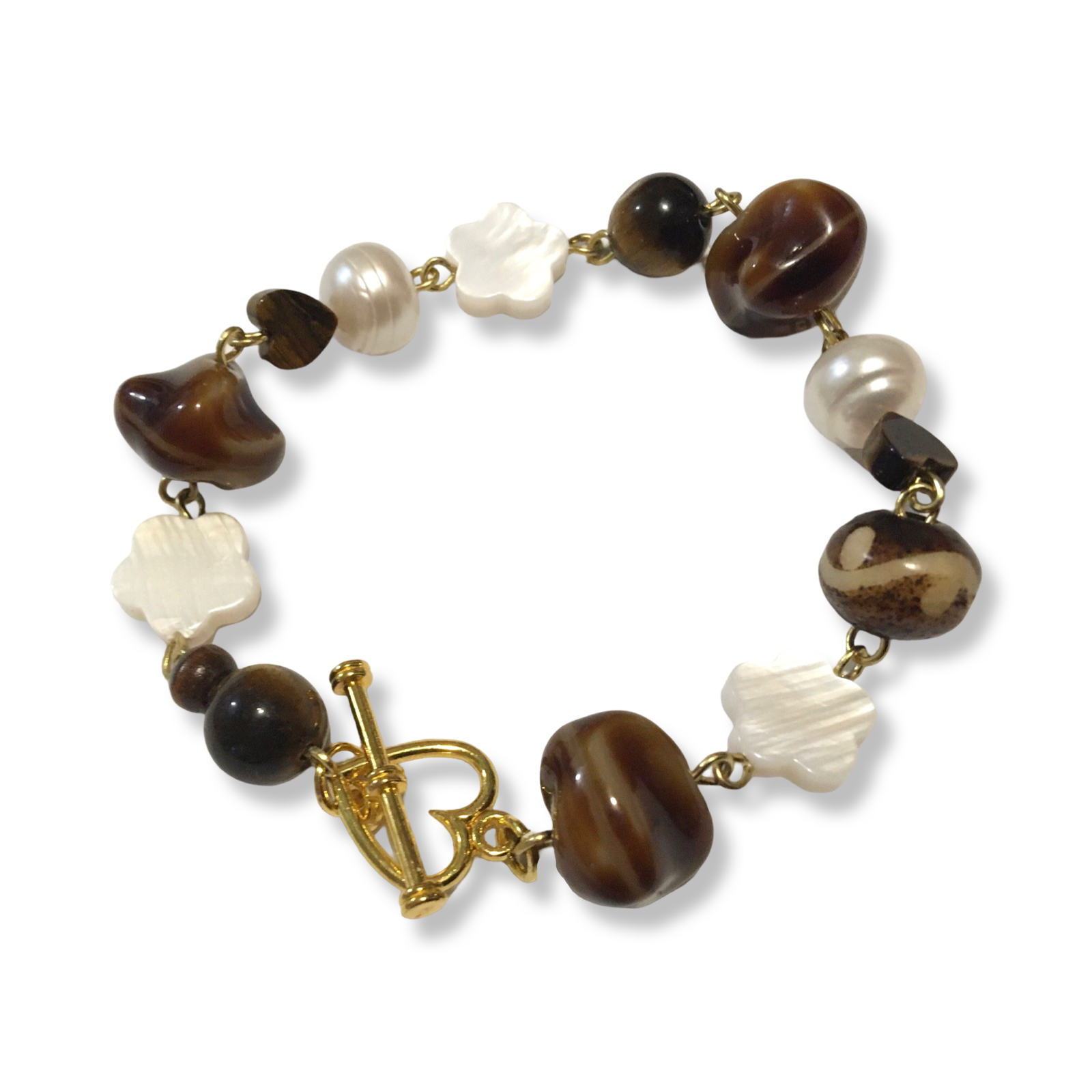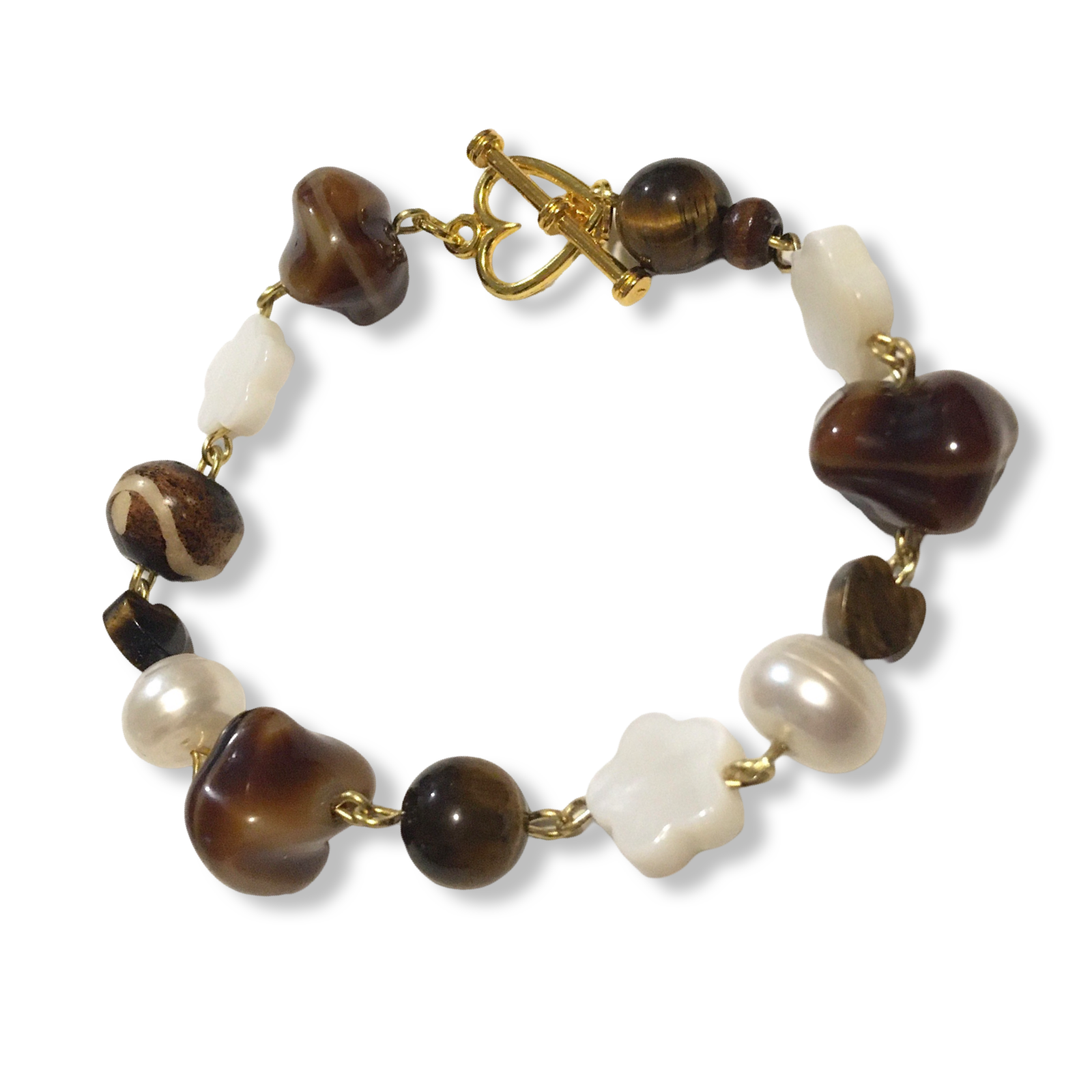 A handmade bracelet featuring shell flowers, cream freshwater pearls, tigerseye, a touch of bone, and salvaged glass beads in chocolate colors.