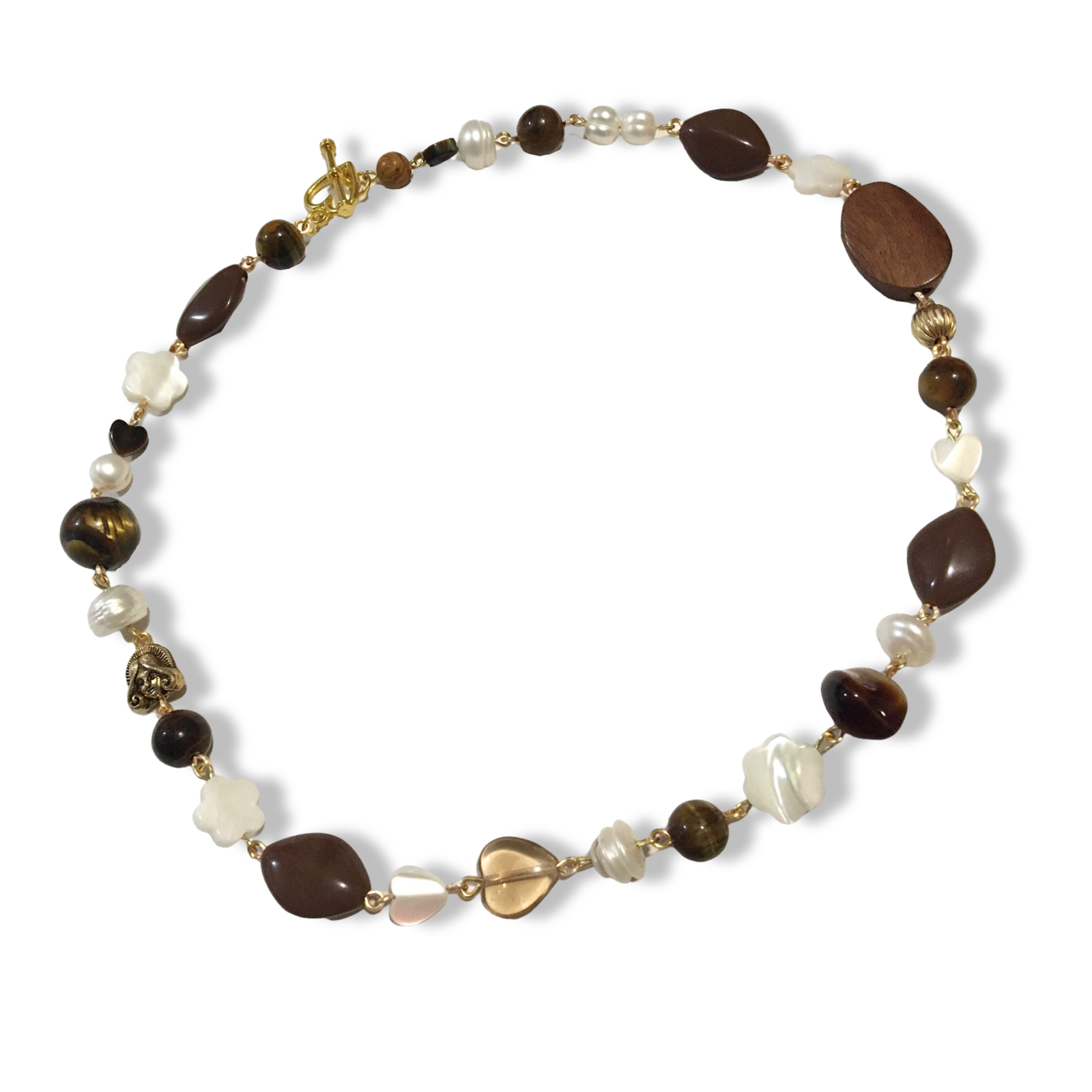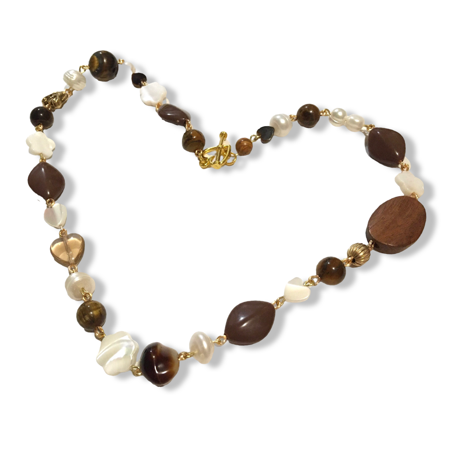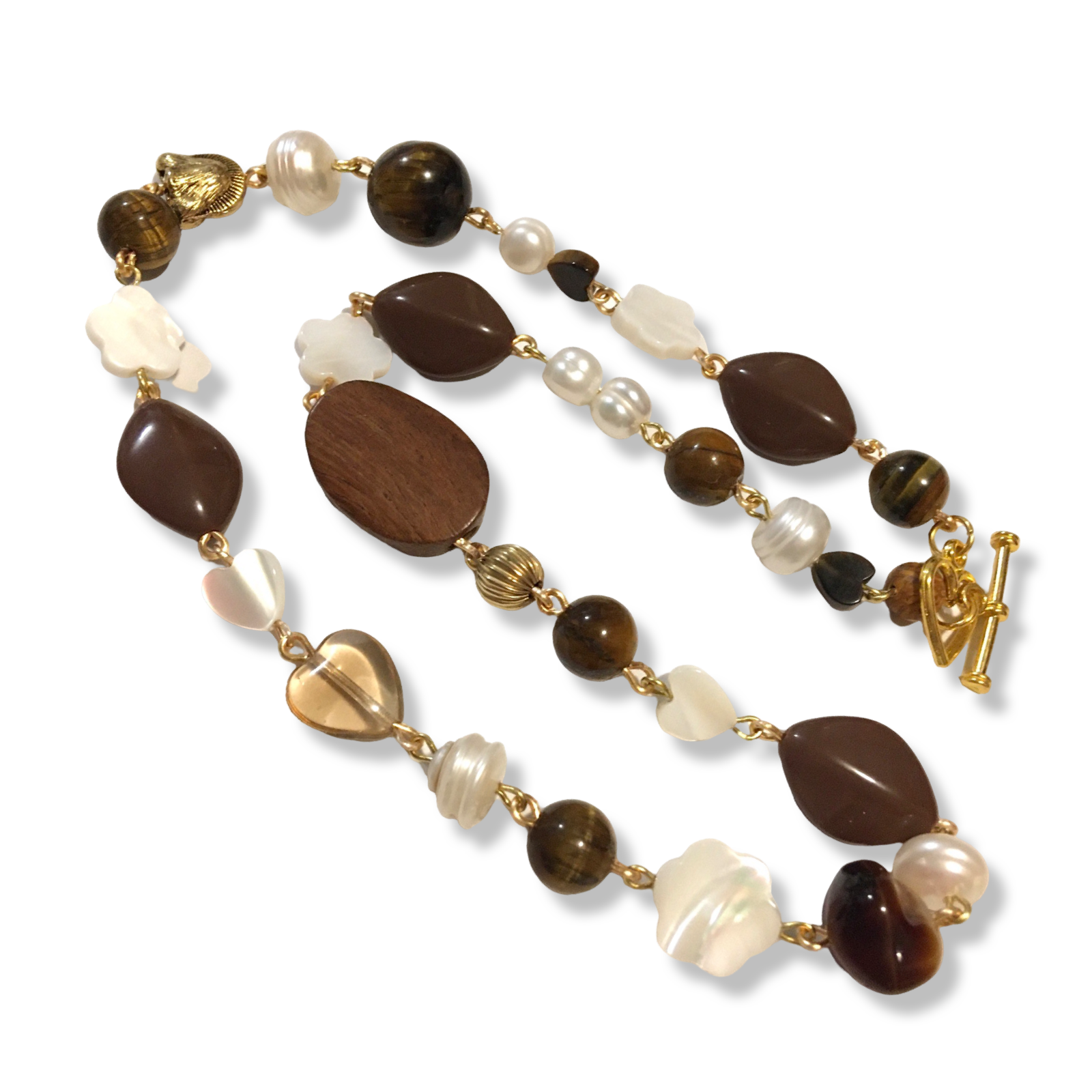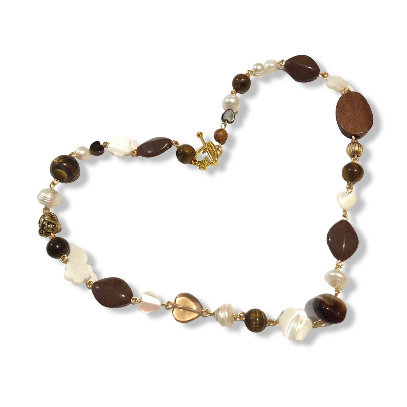 A handmade necklace reminiscent of tiramisu or milk chocolate. It features freshwater pearls, shell hearts and flowers, tigerseye, and touches of Czech glass, wood, and salvaged plastic beads. Free US shipping!