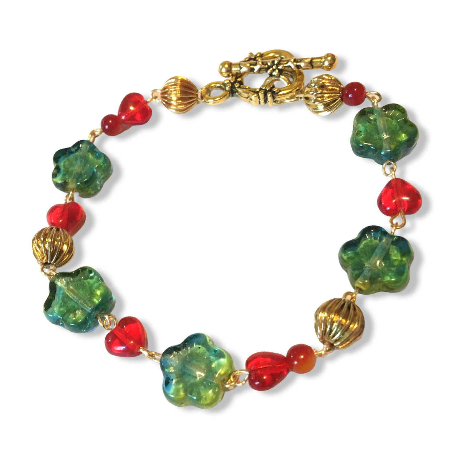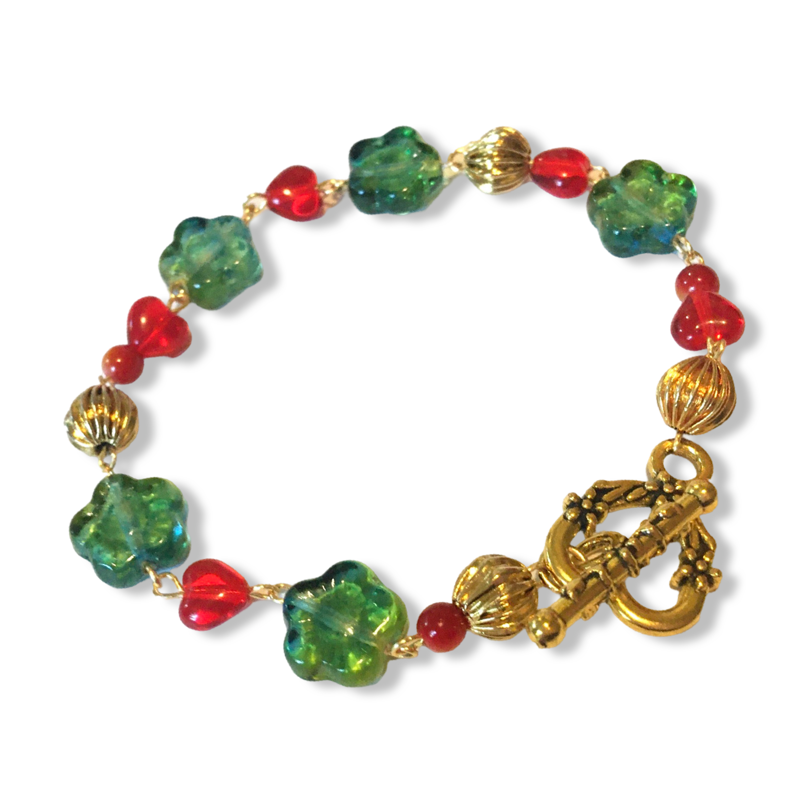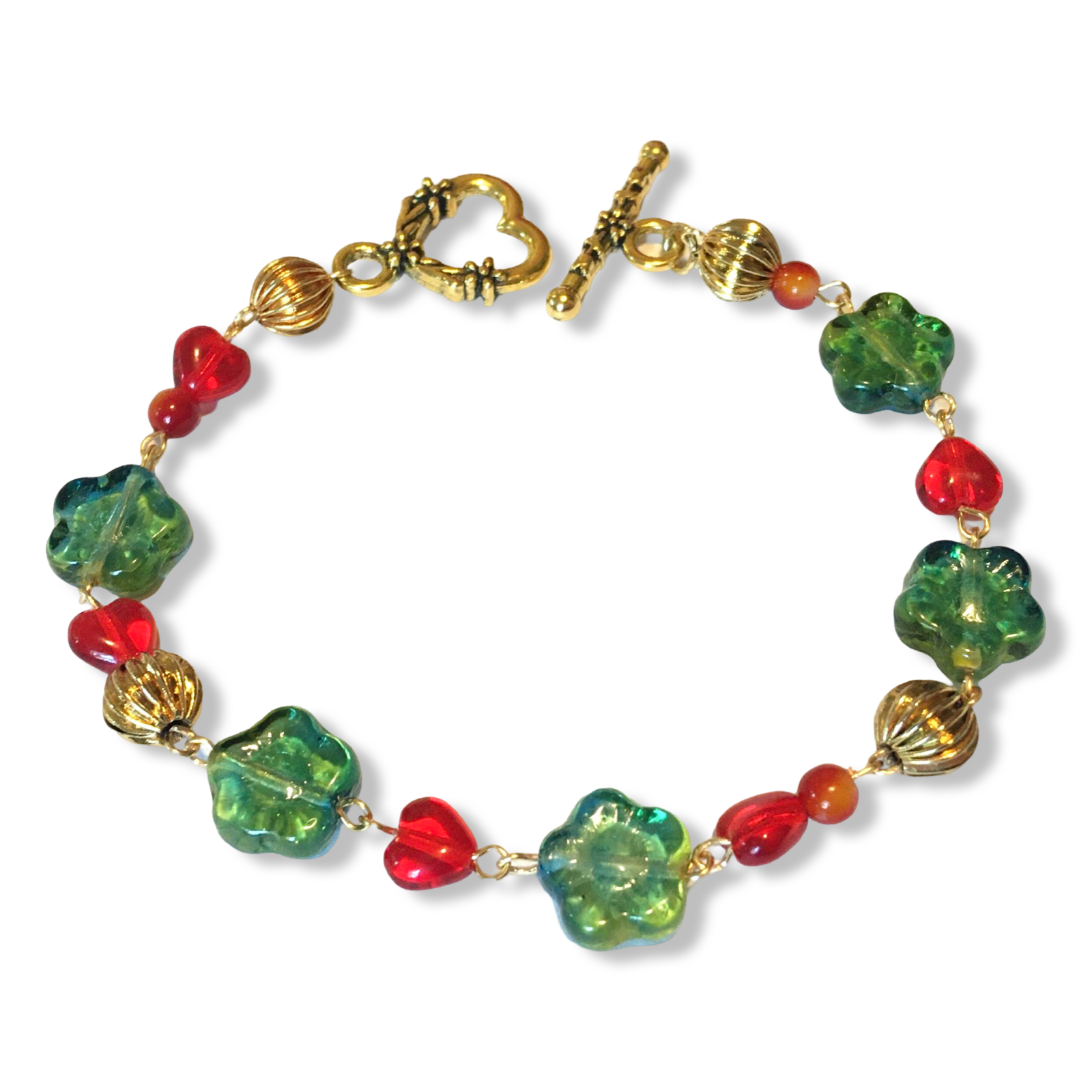 A handmade, 7.25" bracelet featuring Czech glass hearts and flowers, and an ornate heart clasp. Free US shipping!