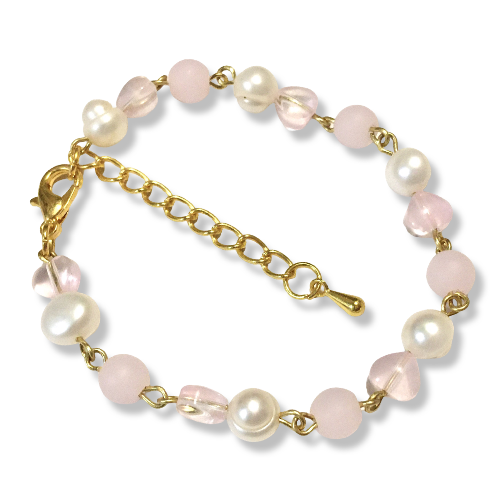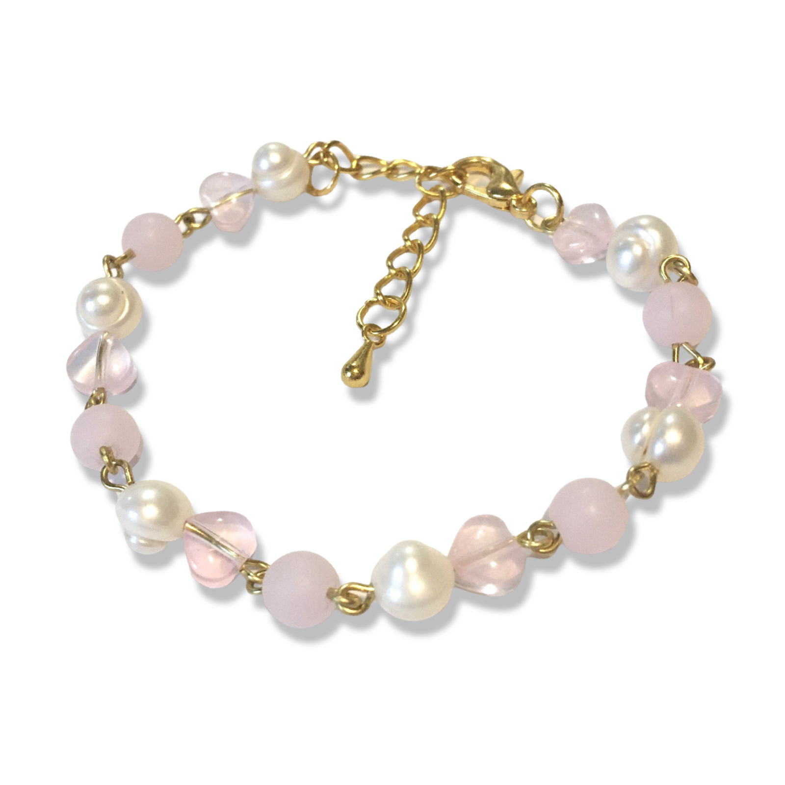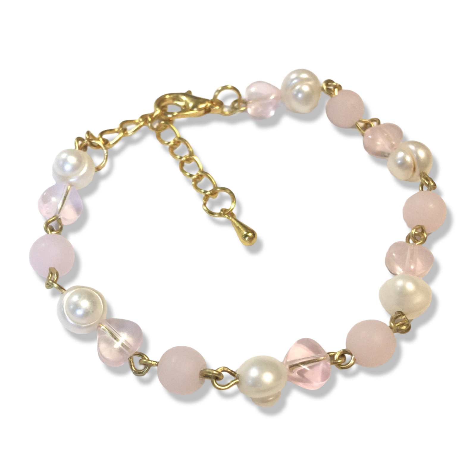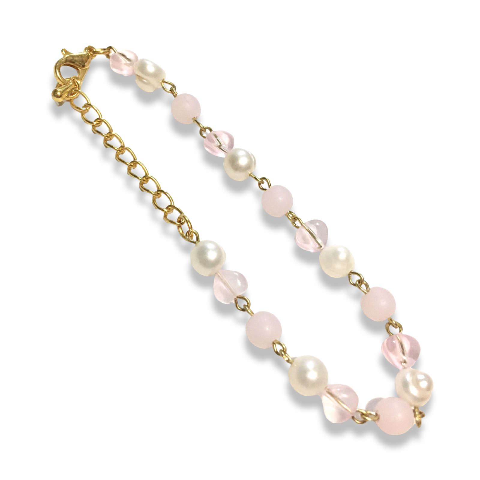 A sweet and simple adjustable bracelet, featuring freshwater pearls and pink glass beads and hearts.