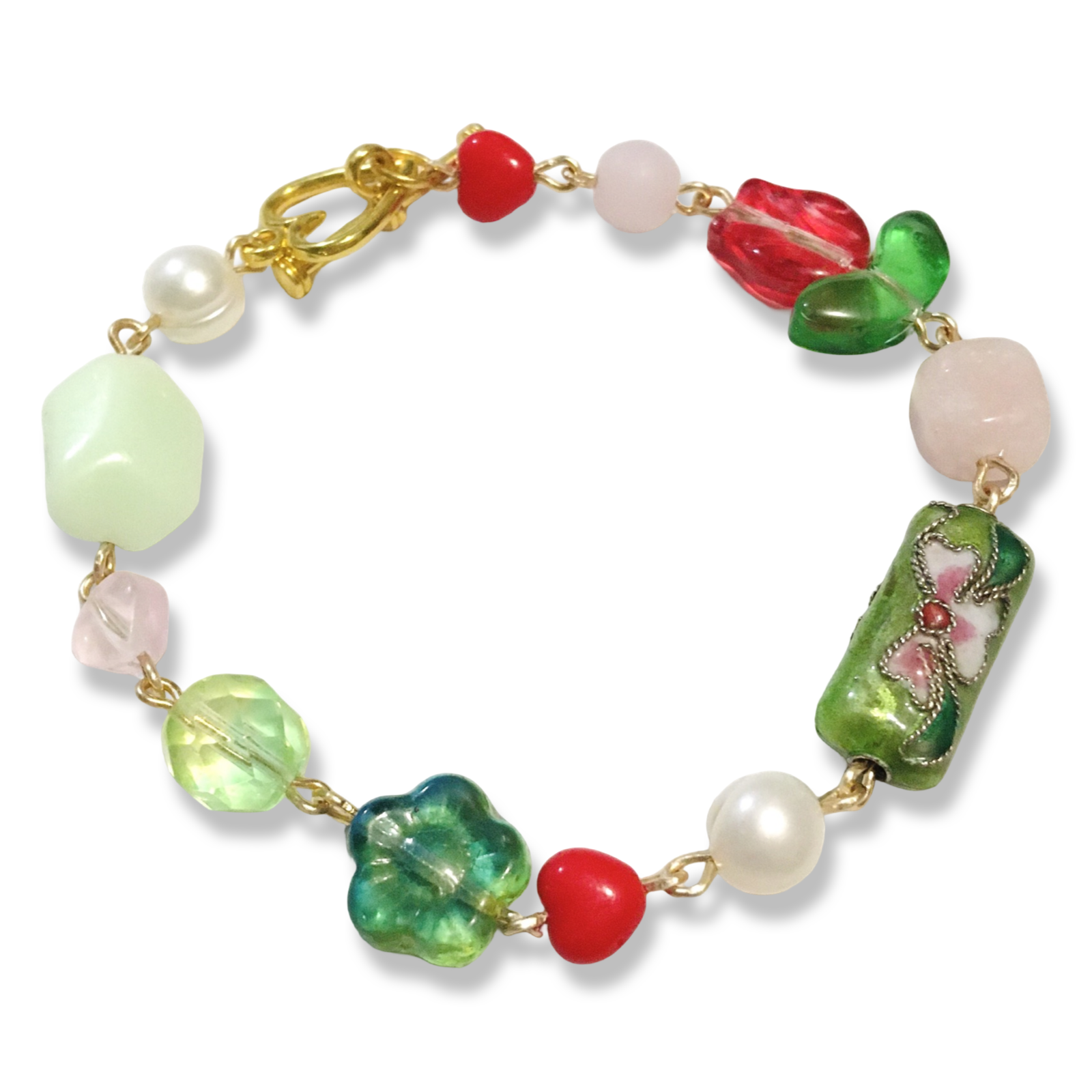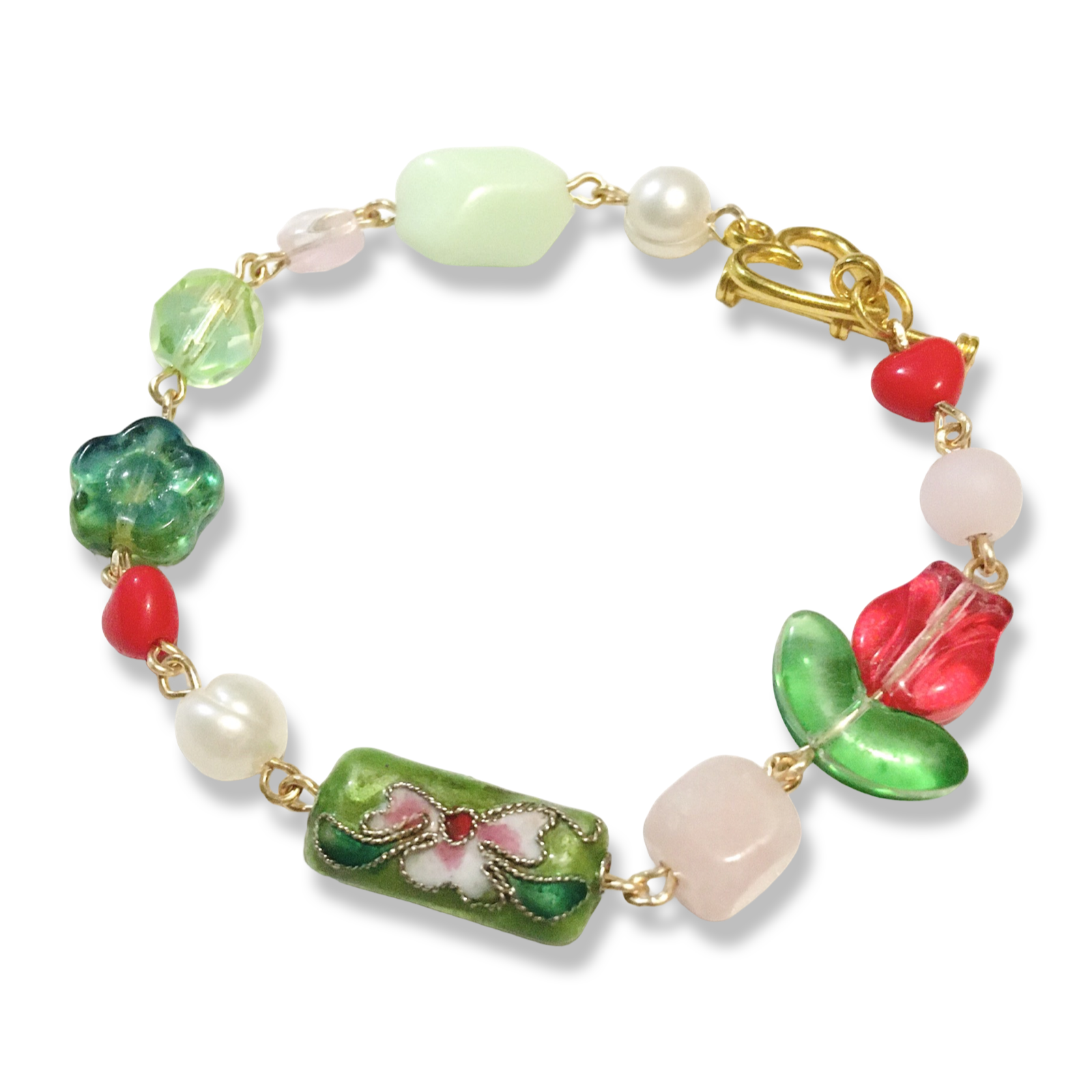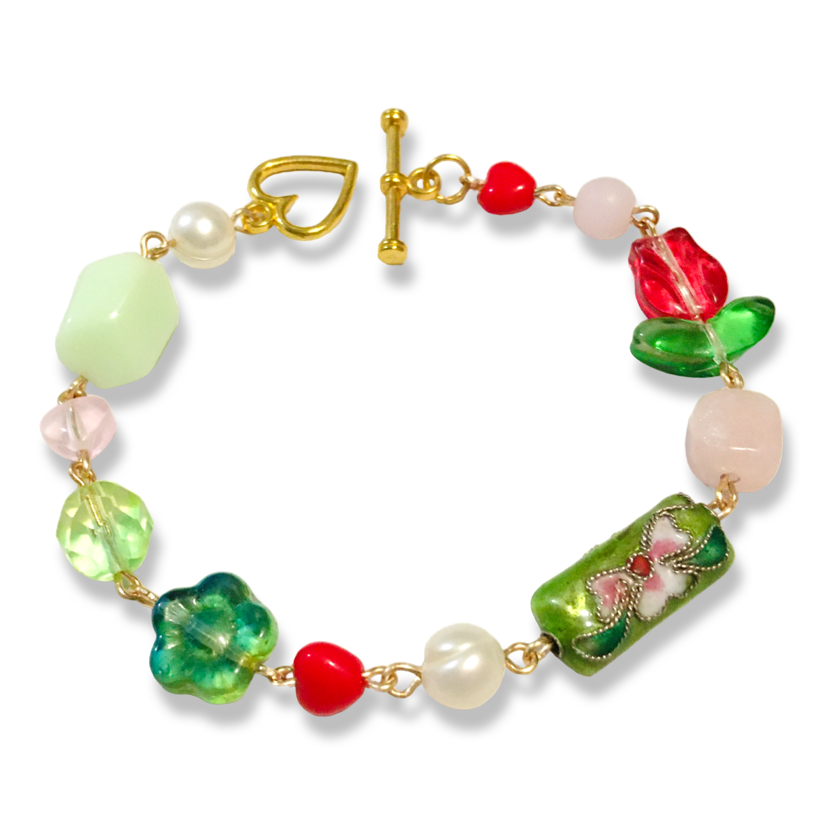 A handmade bracelet featuring freshwater pearls, a floral Cloisonné bead, and assorted Czech glass flowers, hearts, and shapes.