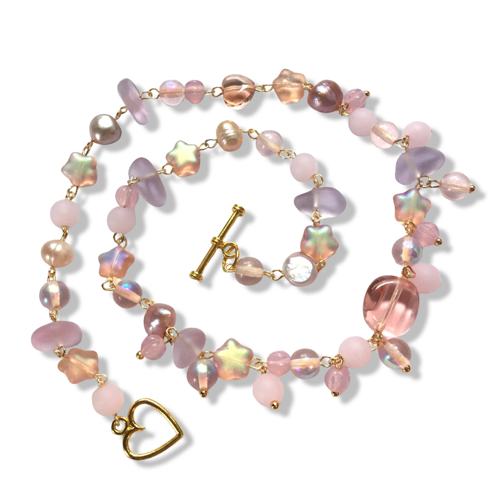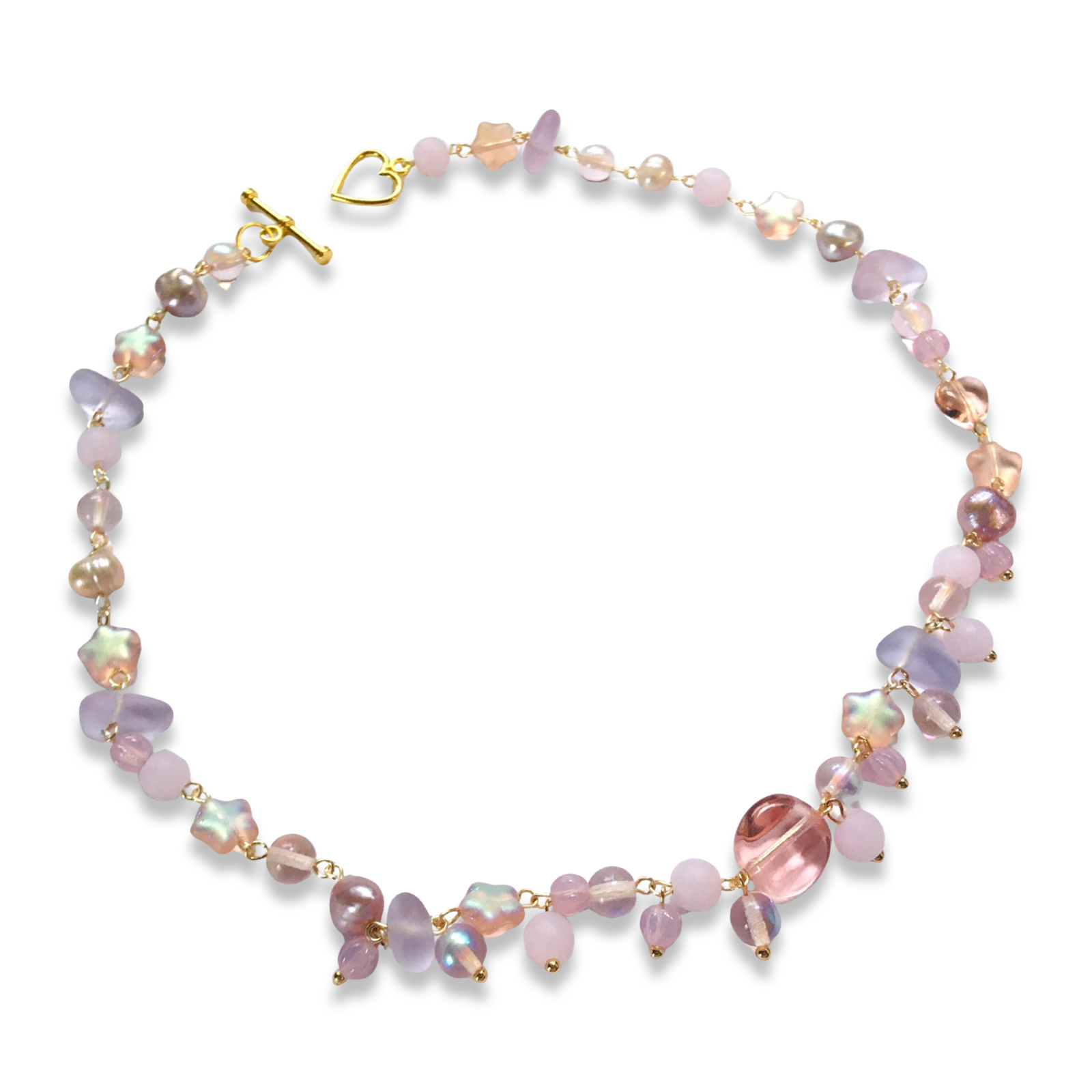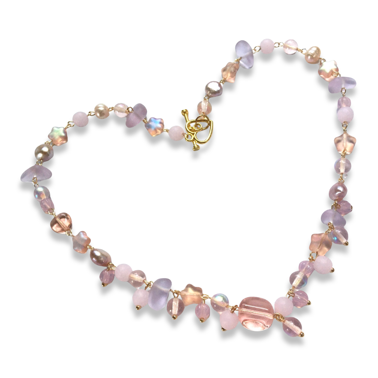A 15.5" short necklace featuring freshwater pearls with a champagne pink luster, sea glass, and assorted Czech glass beads and frosted stars, all sourced from small local businesses. US shipping is free!