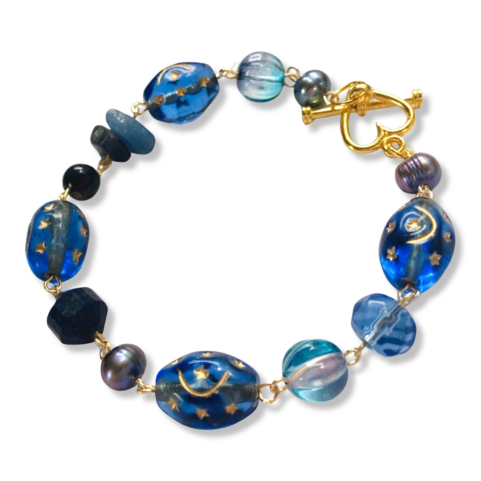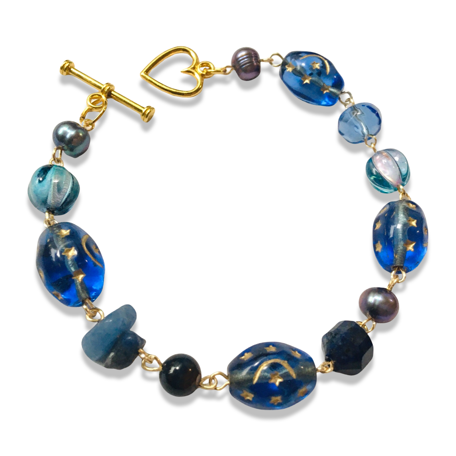 A 7.25" bracelet featuring Czech glass beads with painted moons and stars, black iris-luster freshwater pearls, and an assortment of glass, plastic, and semiprecious beads sourced from small local businesses. Free US shipping!