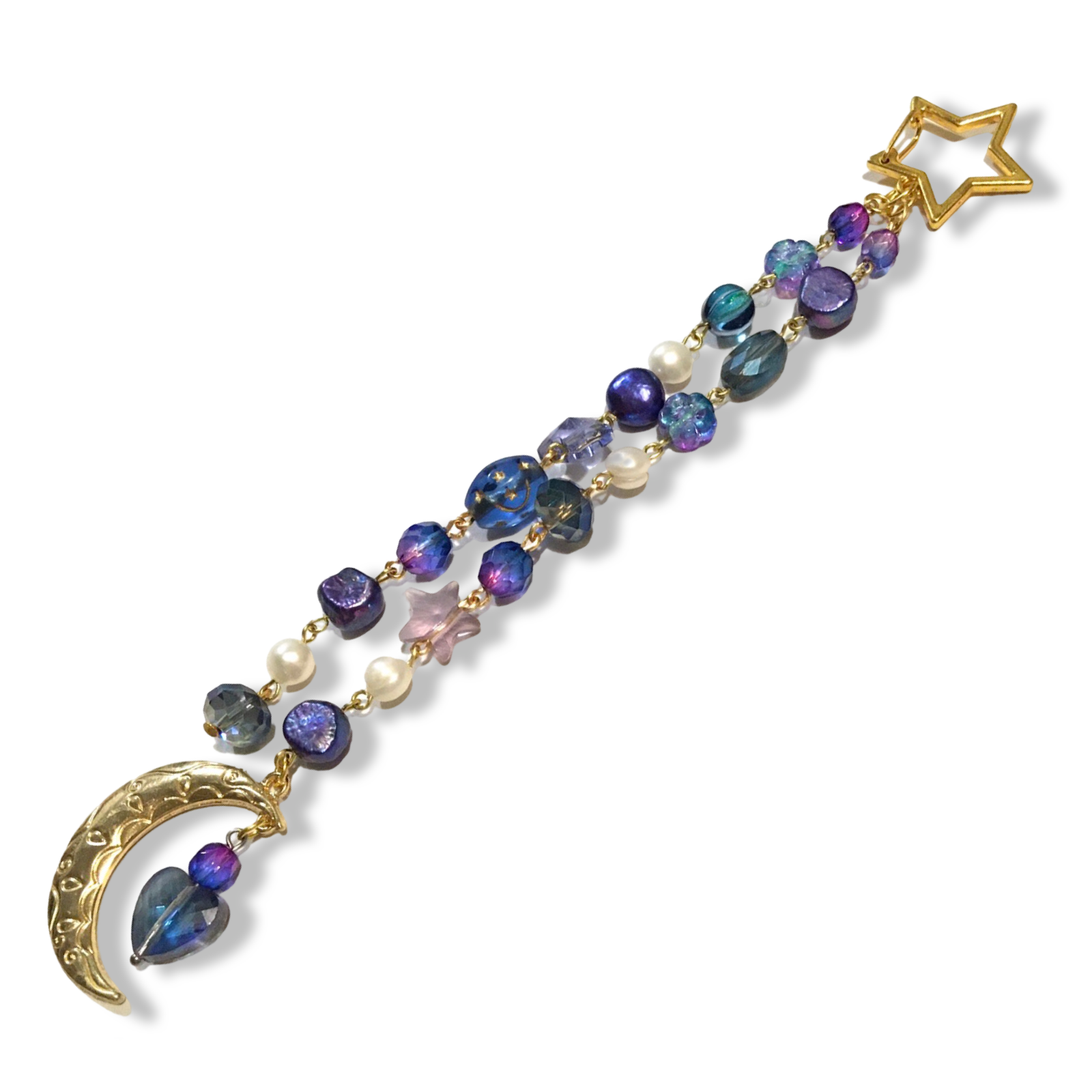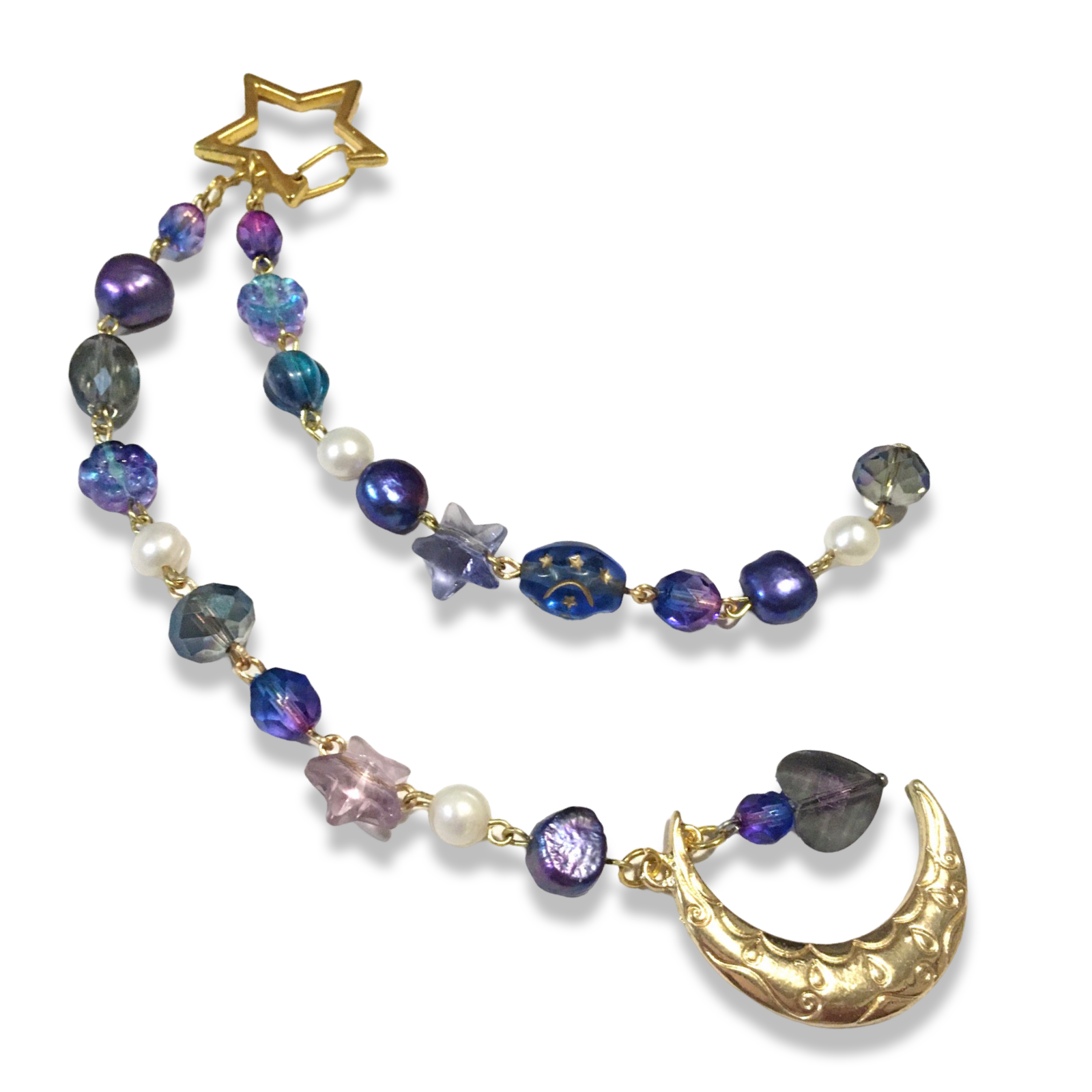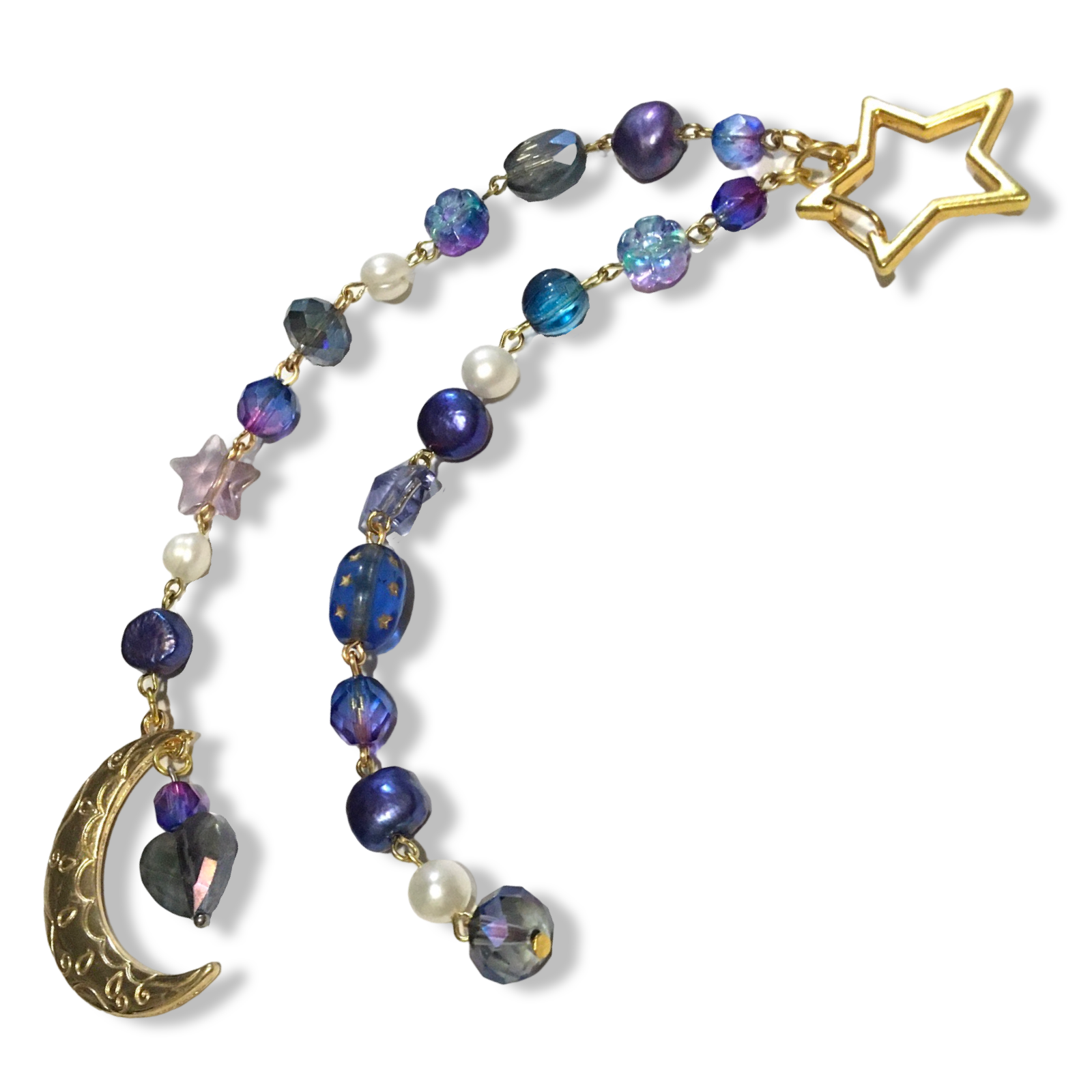 A star-carabiner keychain featuring strands of freshwater pearls, iris-luster Czech glass, Swarovski stars, and a metal cresent moon.