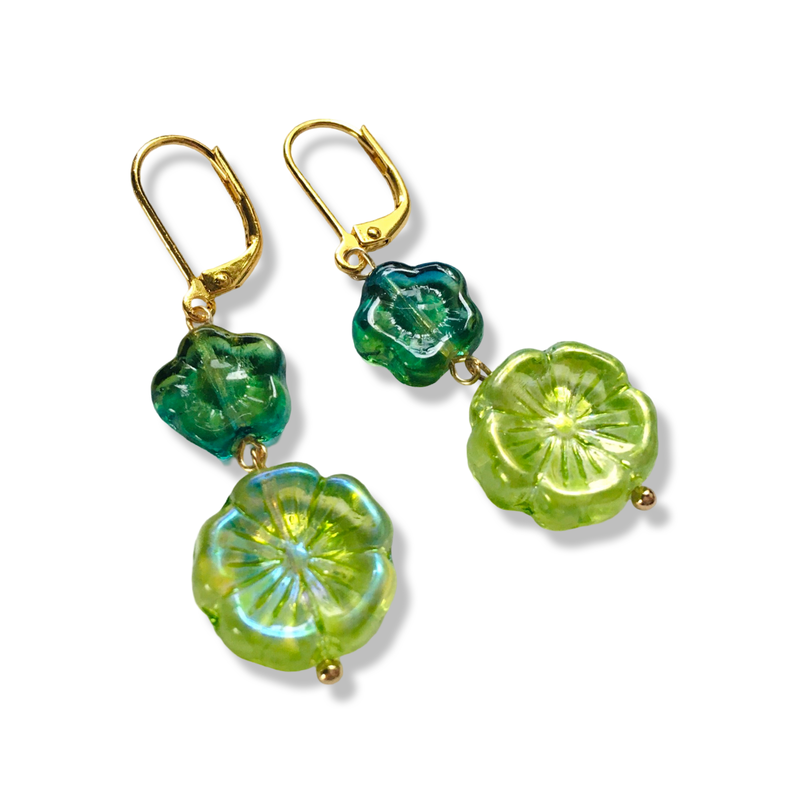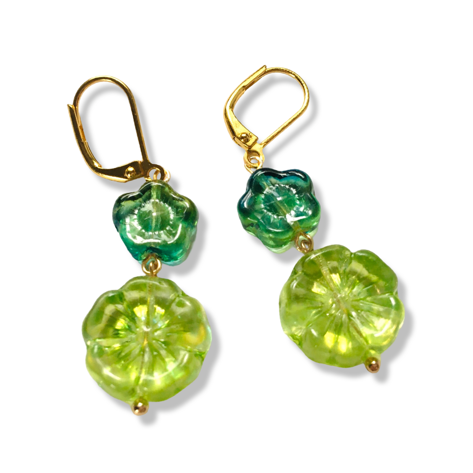 A pair of leverback earrings featuring retro Czech glass flowers in green. Free US shipping!