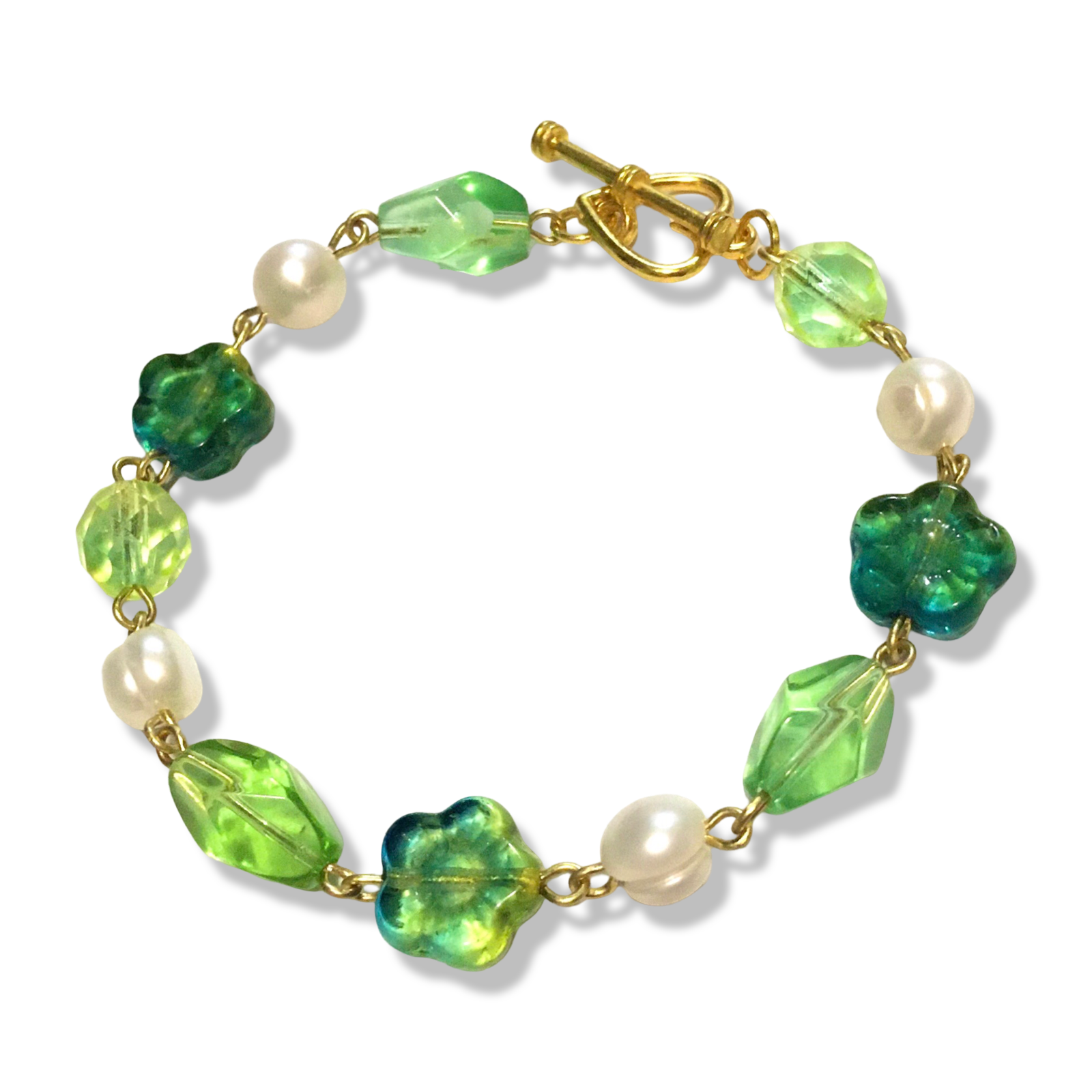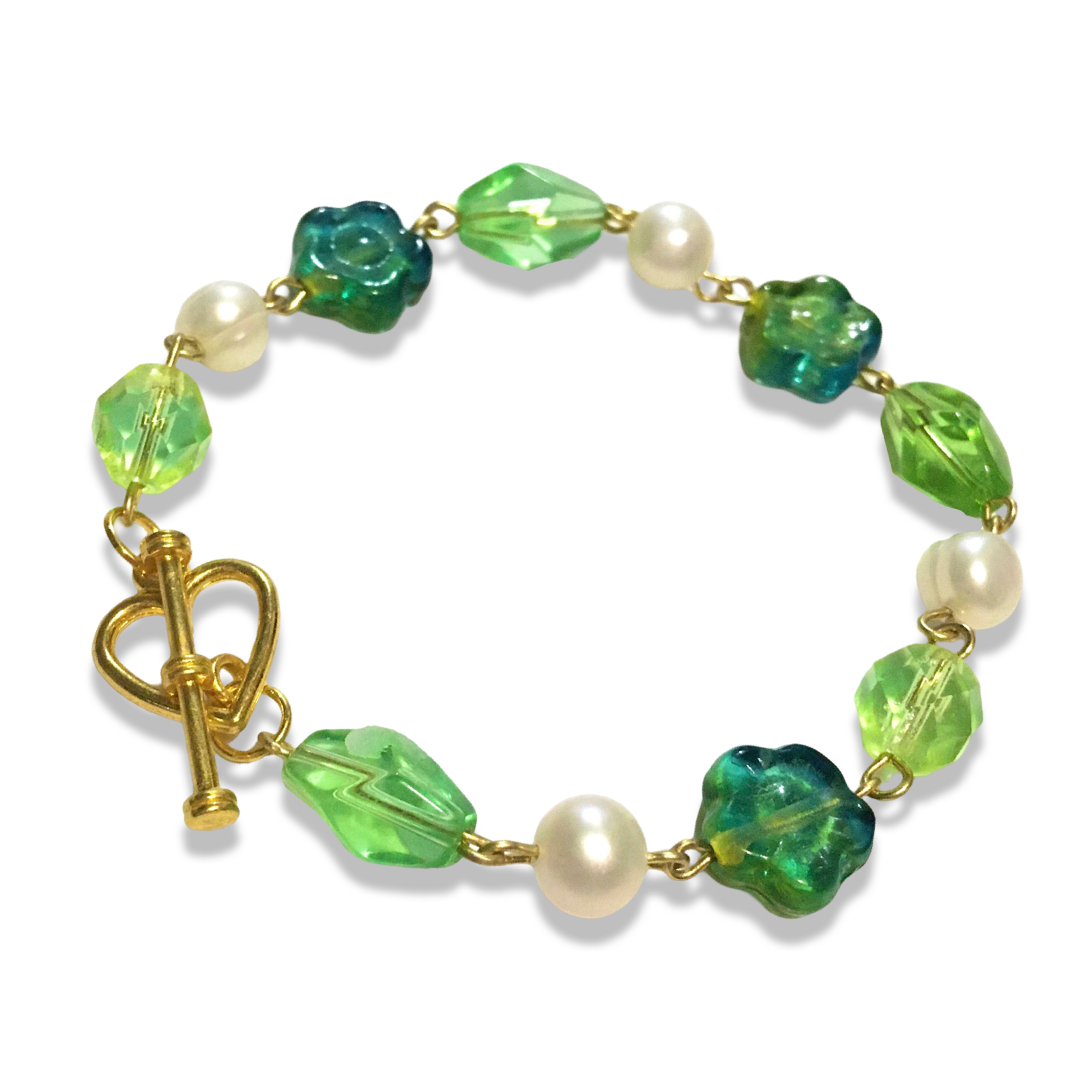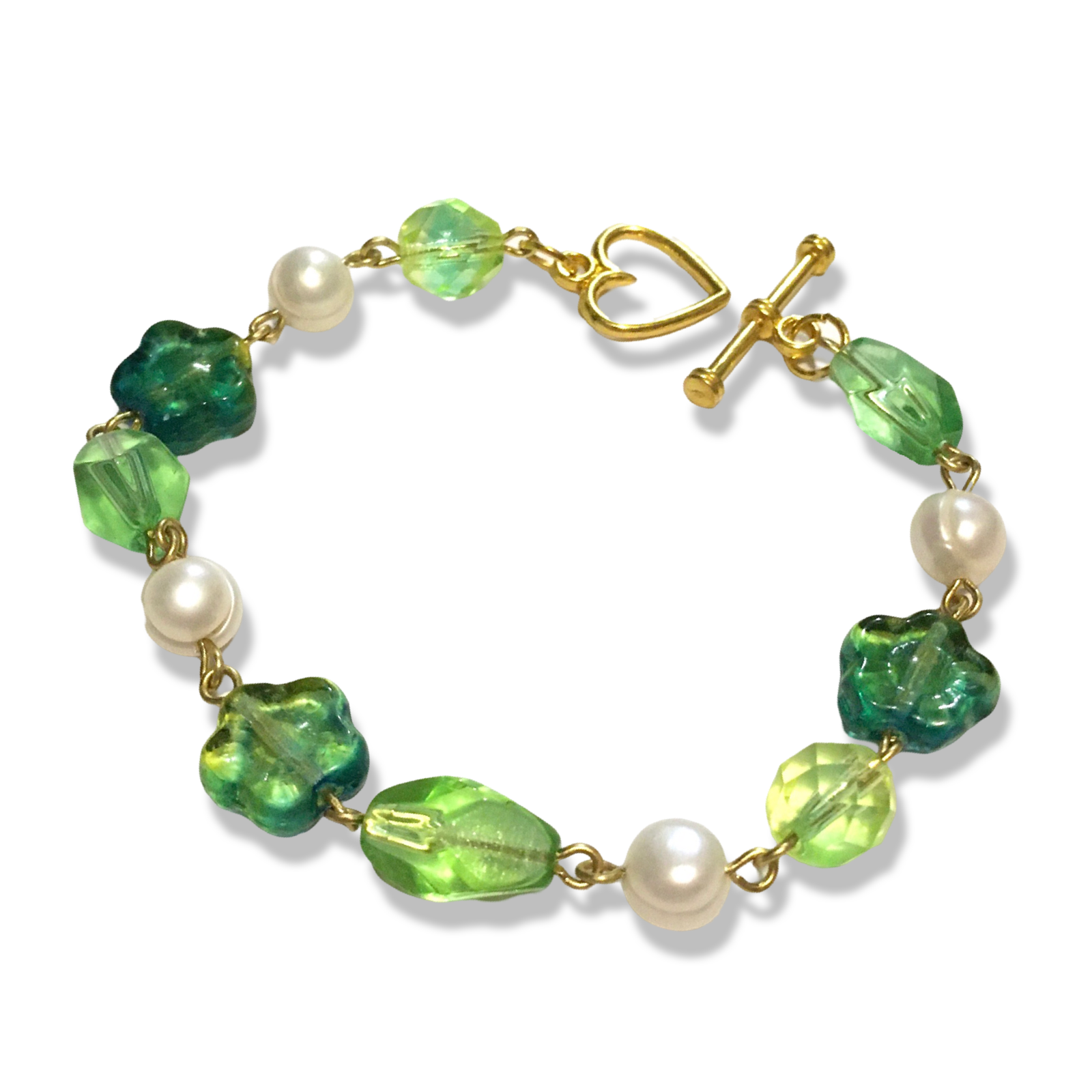 A simple handmade bracelet featuring freshwater pearls and Czech glass beads in vivid greens. Made in anticipation of the spring onion and three-cornered leek flower season.