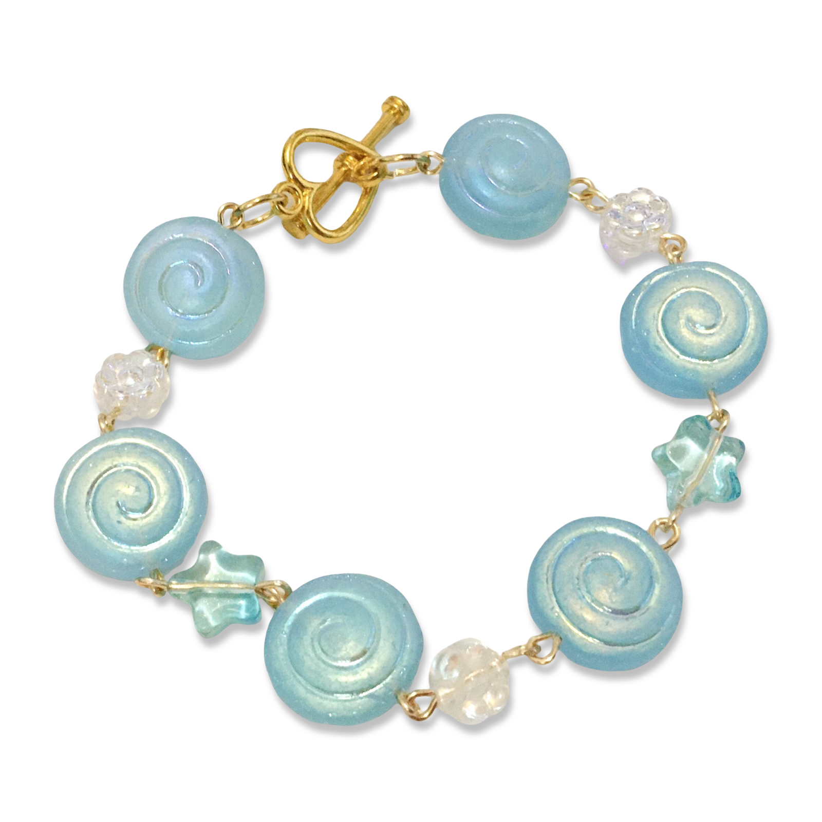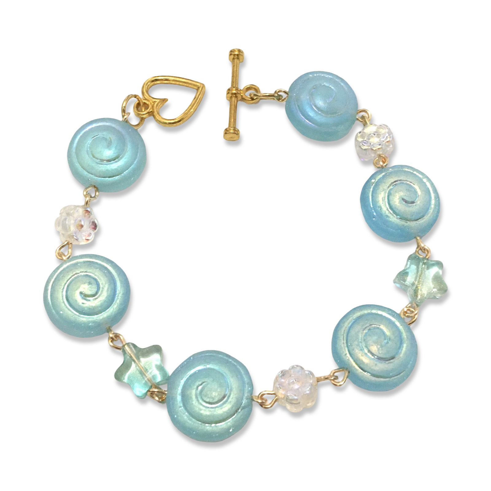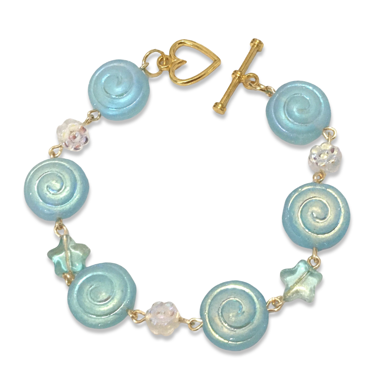 A handmade, soda-colored bracelet featuring cute Czech glass spirals, stars, and flowers.