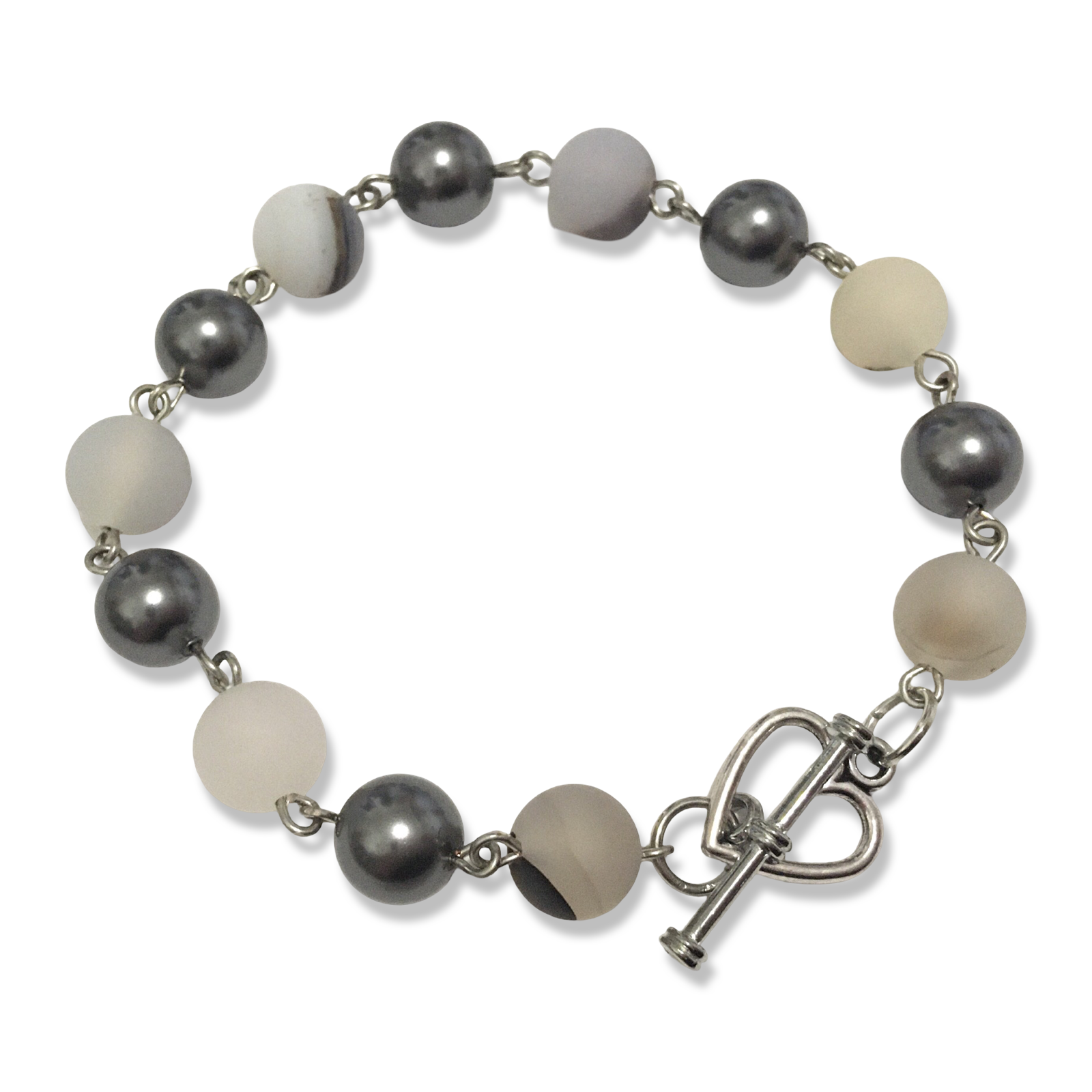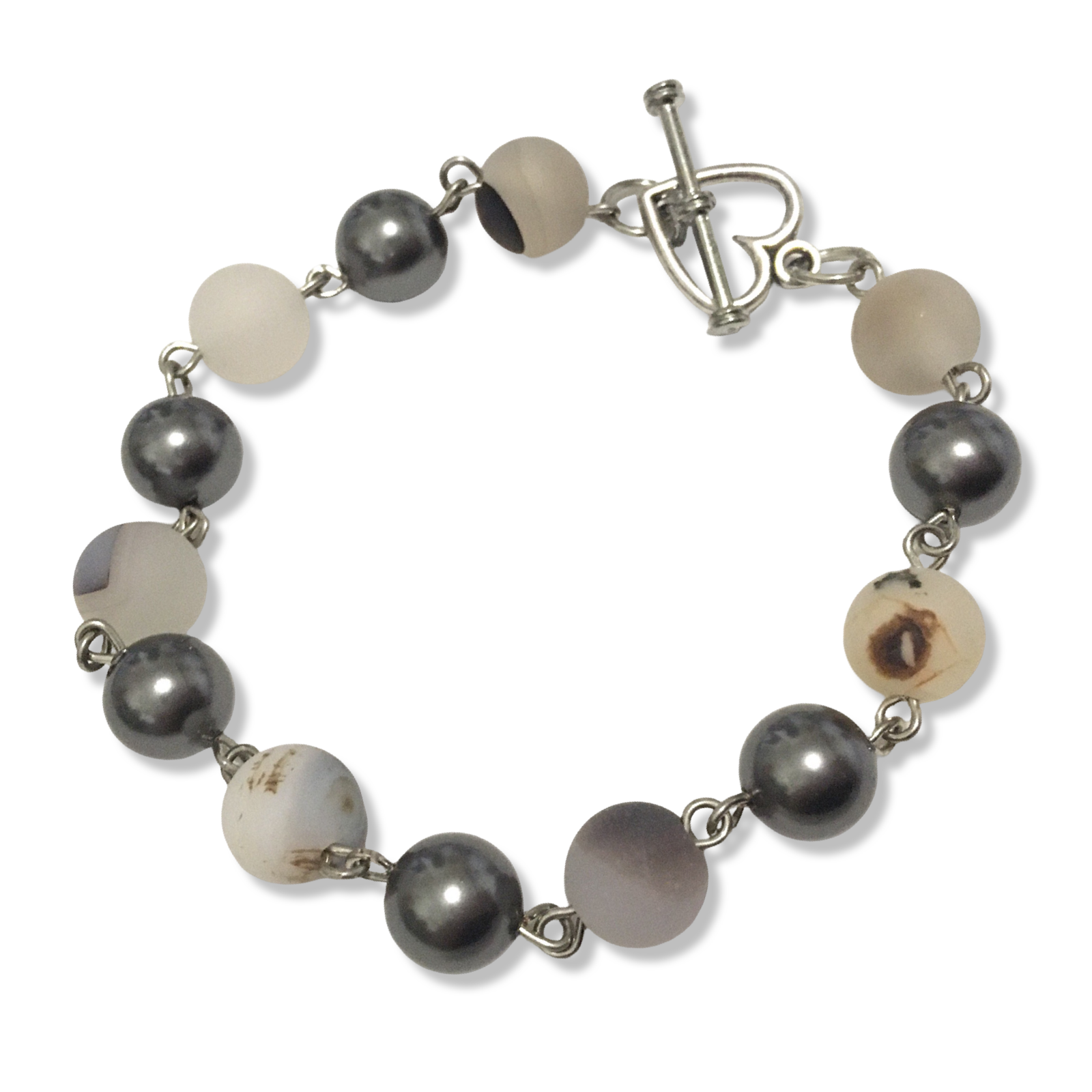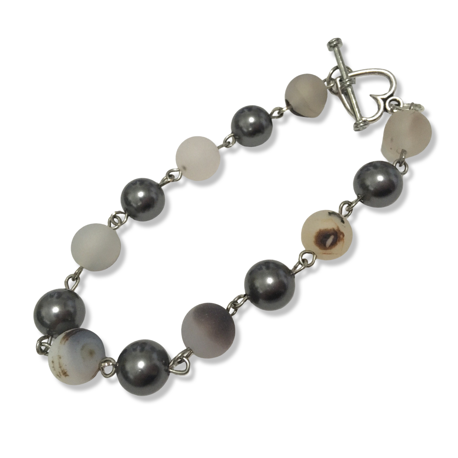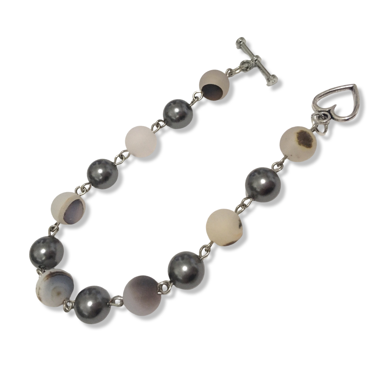 A simple handmade bracelet featuring sanded flower agates and Swarovski glass "pearls" in midnight.