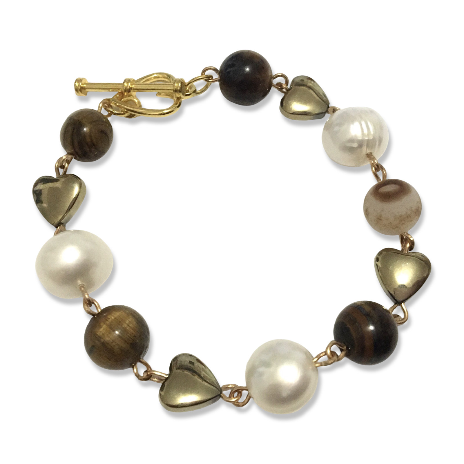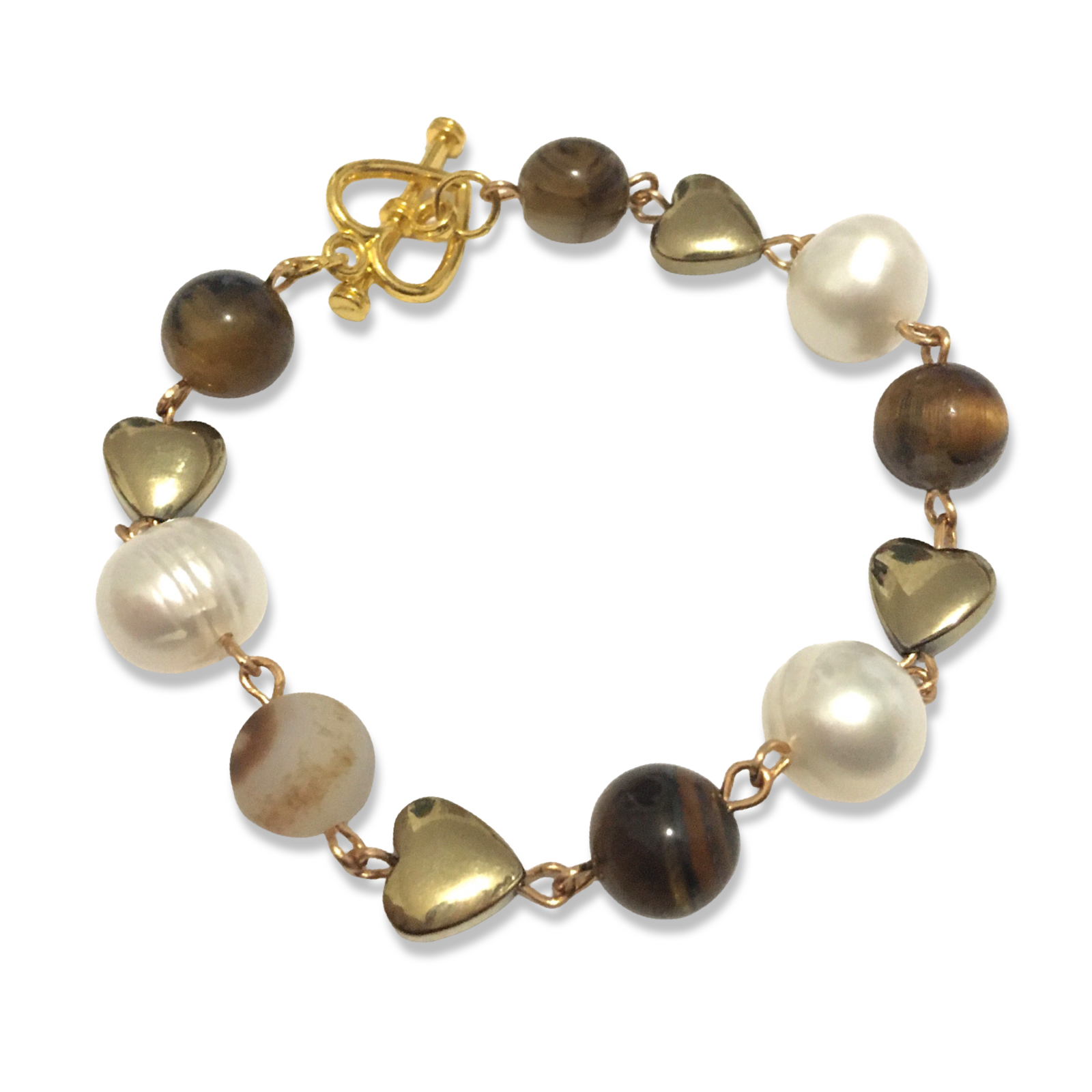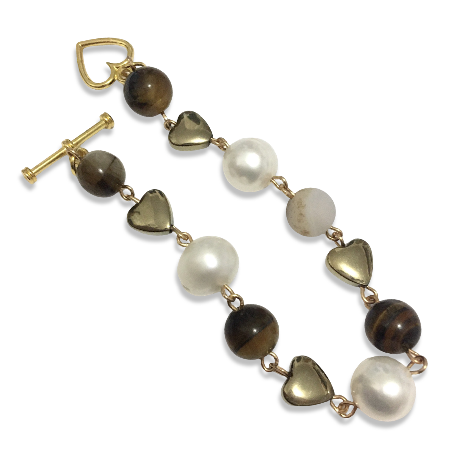 A handmade bracelet in chocolate colors, featuring tigers eye, large freshwater pearls, flower agate, and hematite hearts in gold.