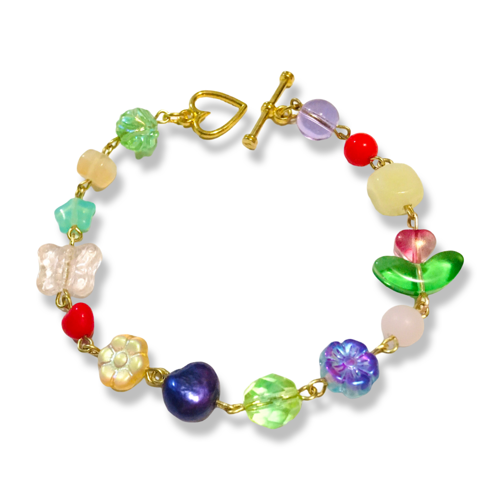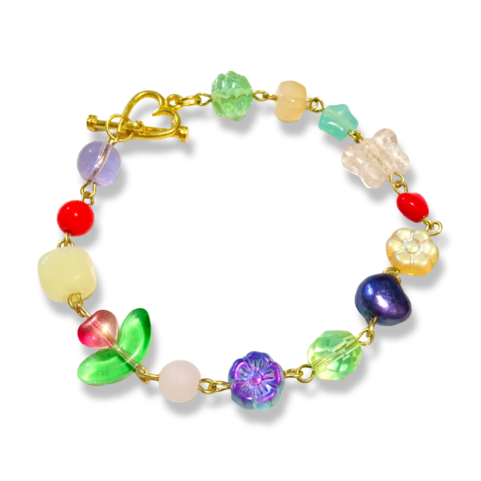 A colorful handmade bracelet featuring assorted glass and semiprecious stone beads; suitable for those with a flower field in your brain.