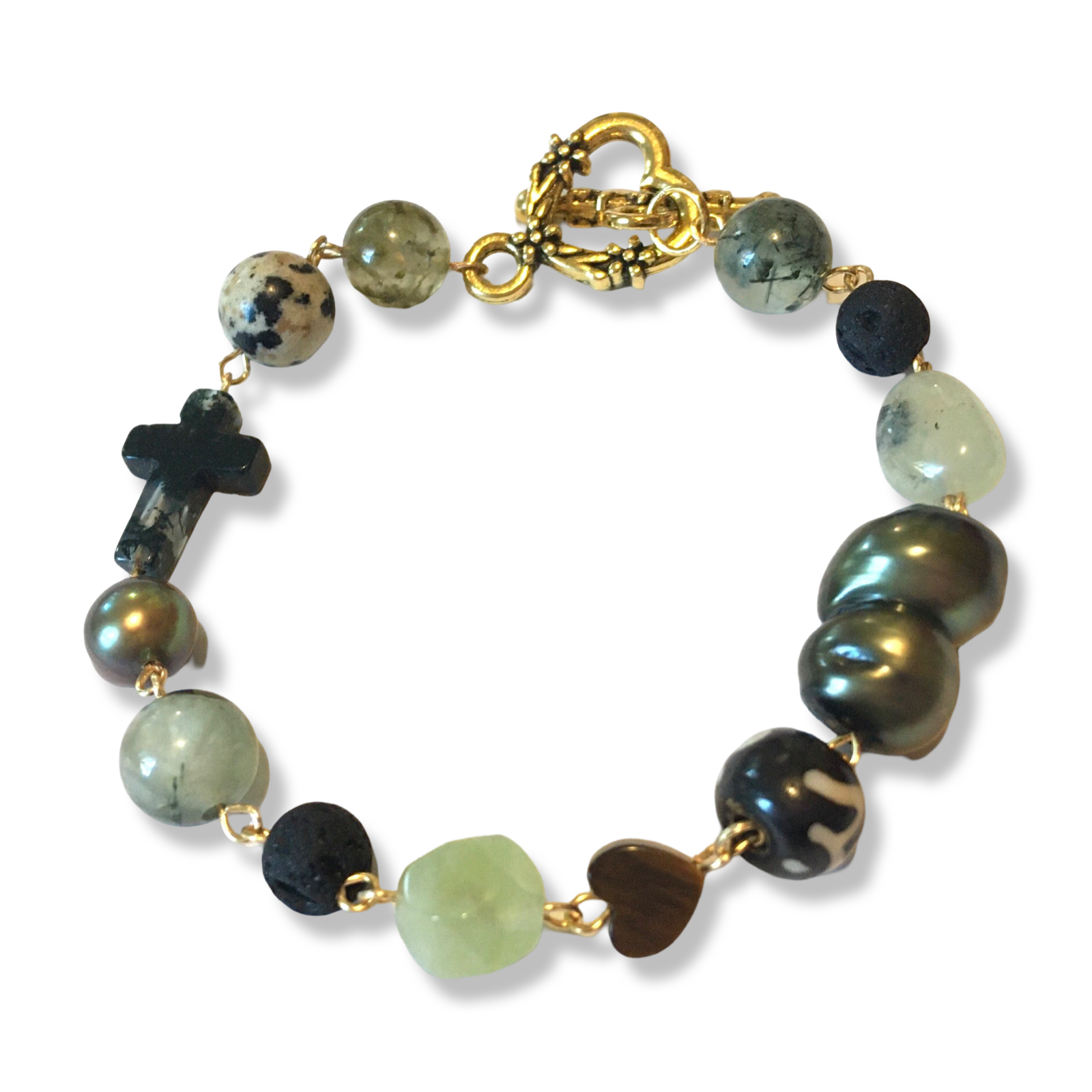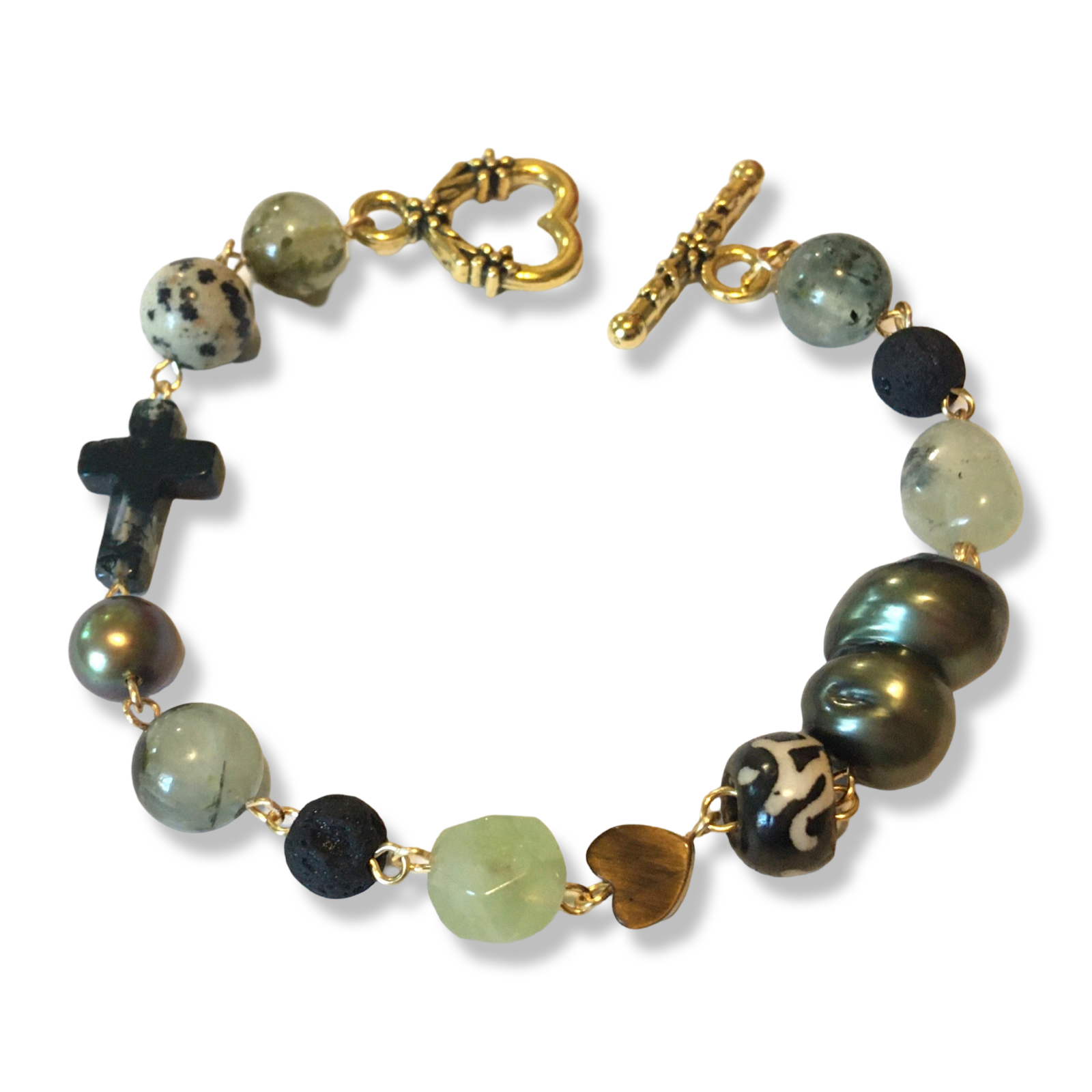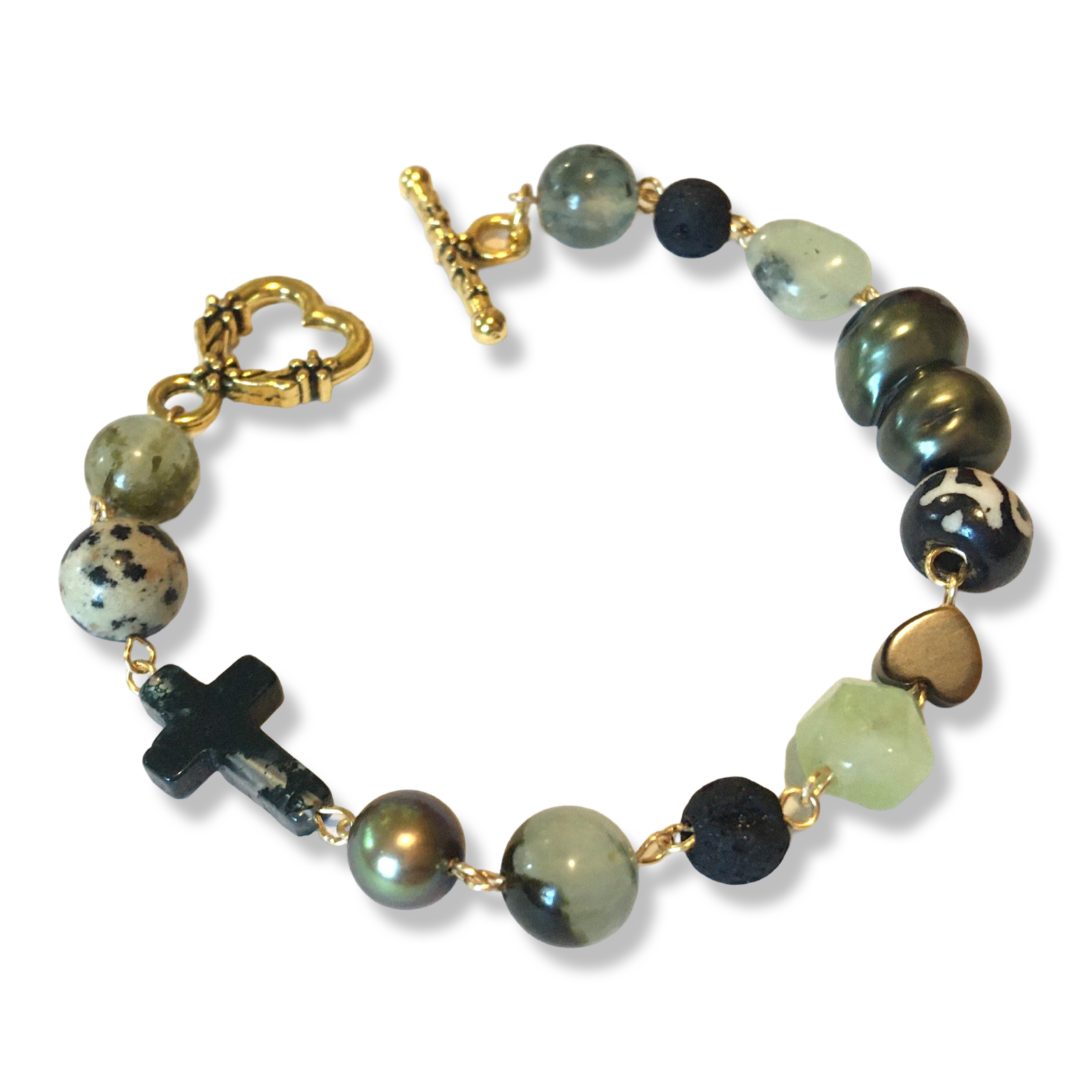 A handmade 7" bracelet featuring freshwater pearls and assorted semiprecious stone beads, with touches of lava rock, Czech glass, and bone.