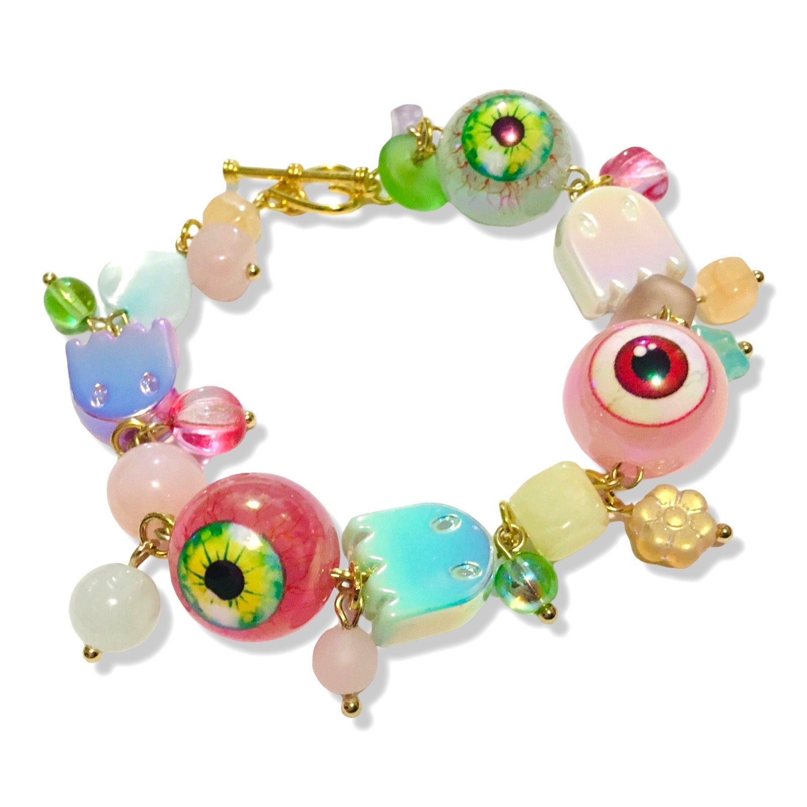 A handmade candy colored bracelet featuring iridescent ghosts and toy eyeballs, seaglass, and assorted beads made from Czech glass, plastics, and semiprecious stones.