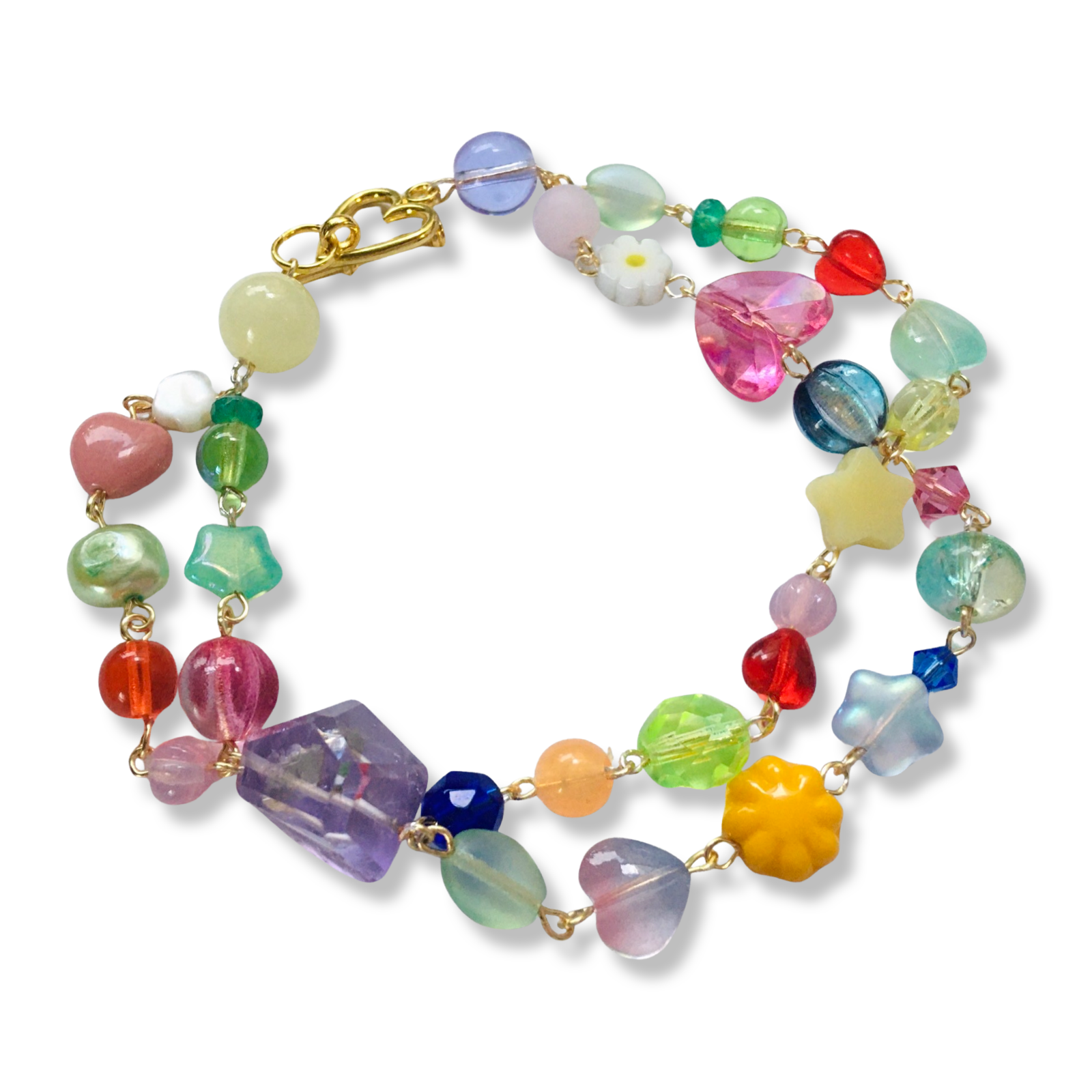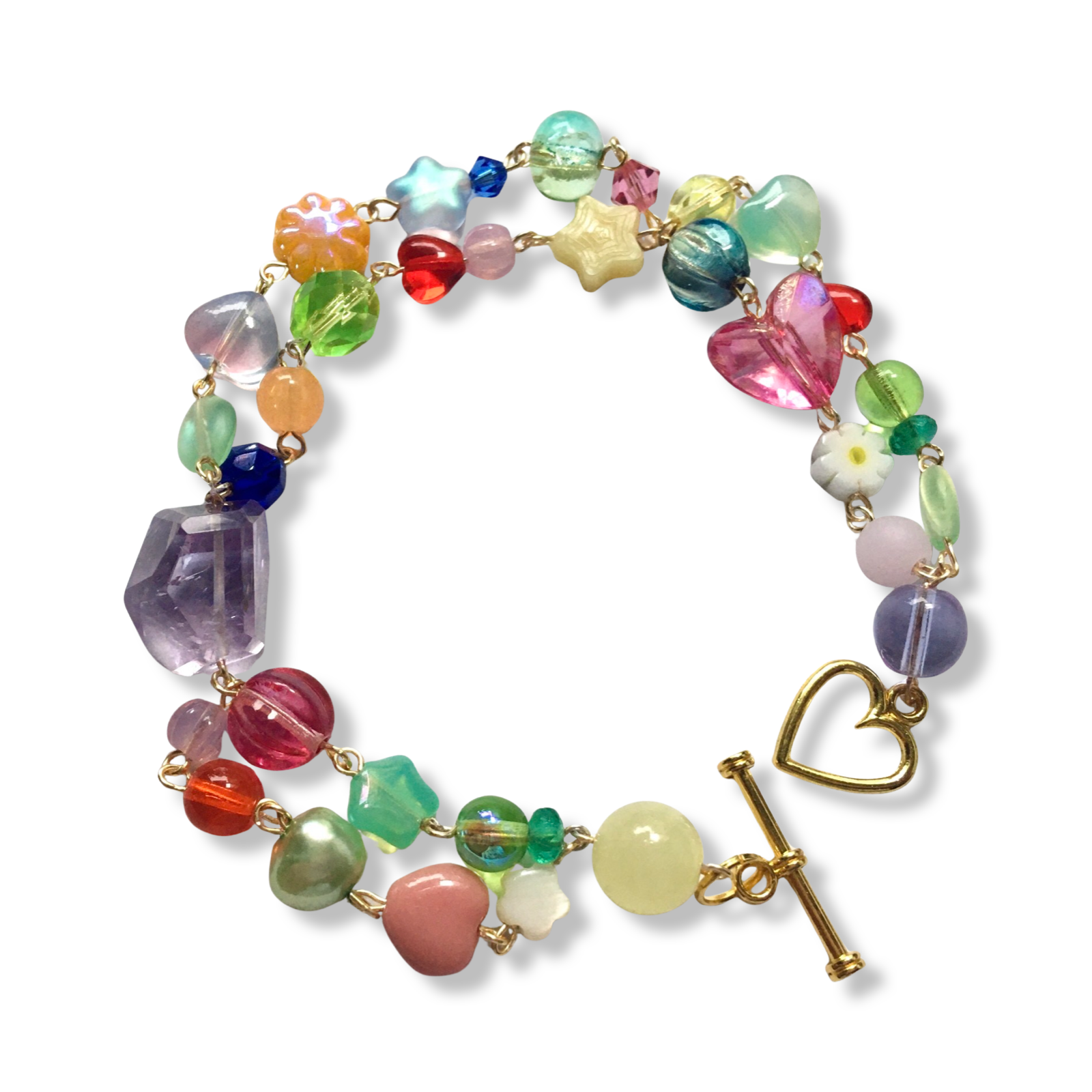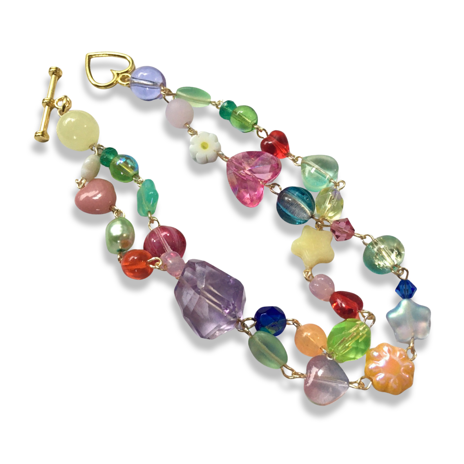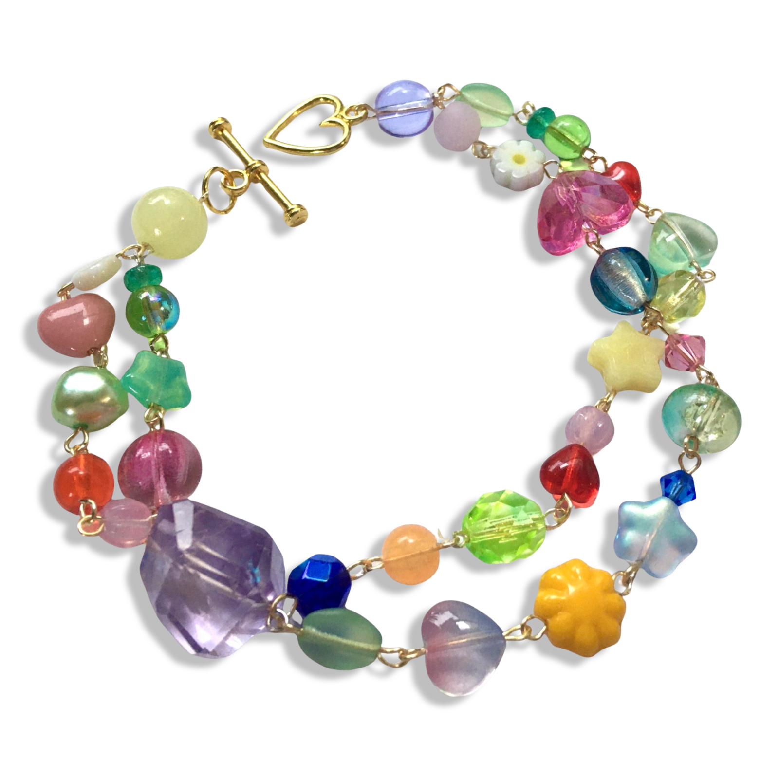 A colorful, 7.75" (large) bracelet featuring an assortment of Czech glass, semiprecious, and salvaged plastic beads, all sourced from small US businesses. Free US shipping!