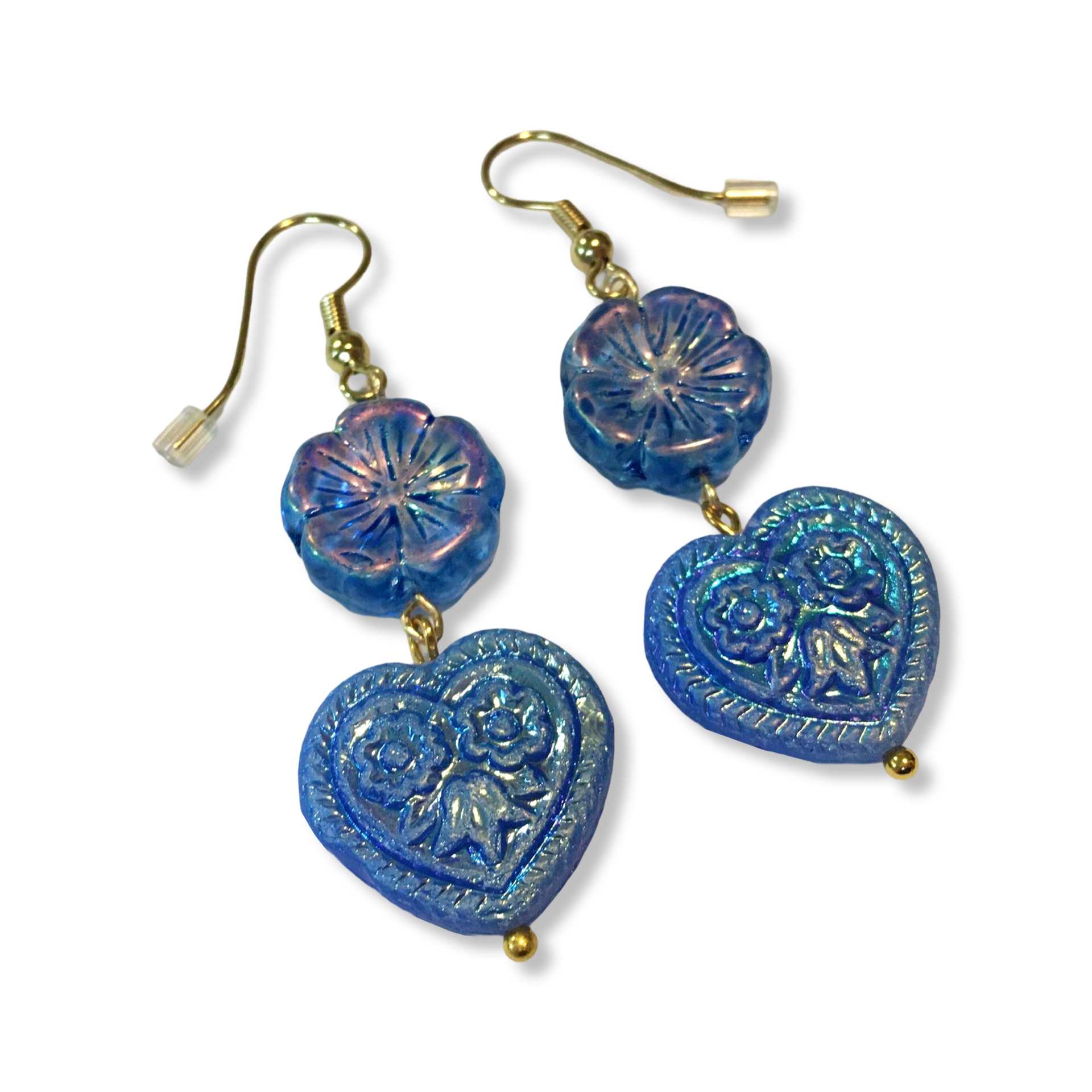A pair of simple earrings in deep blue, featuring iridescent Czech glass flowers and vintage hearts.