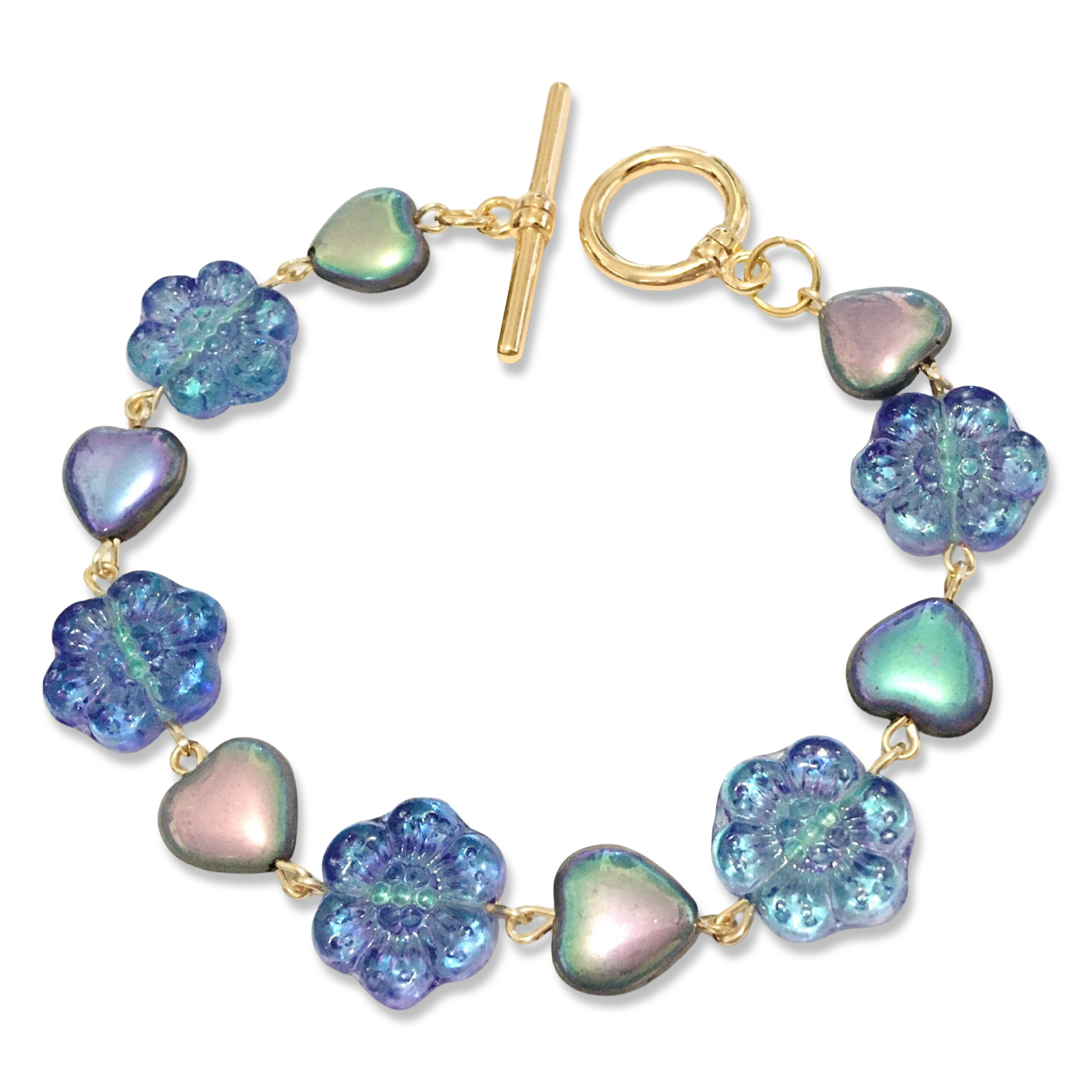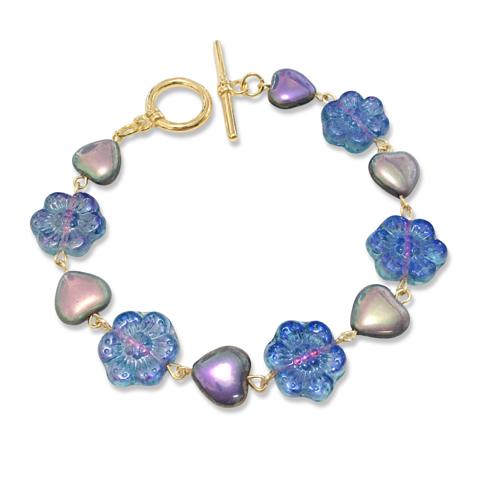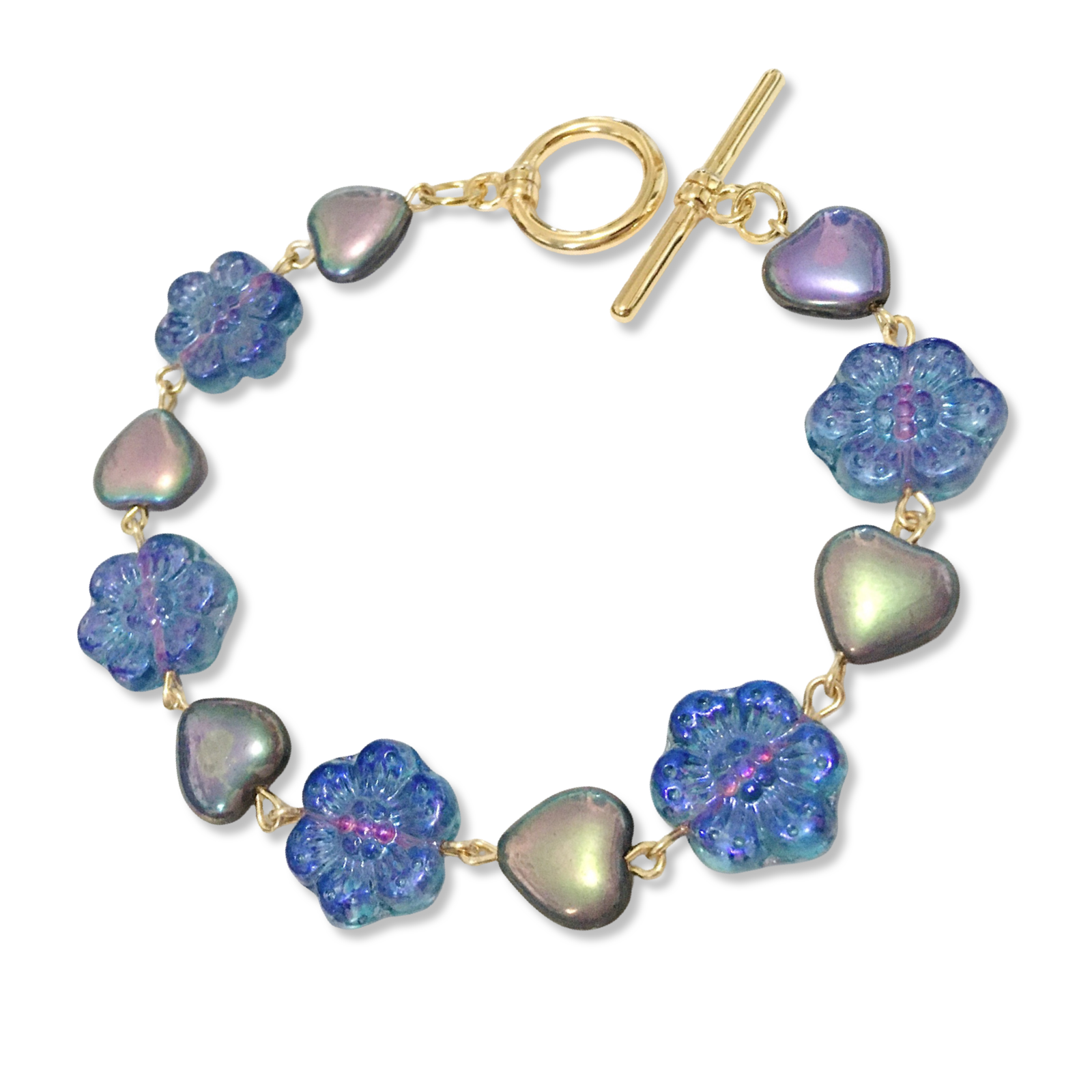 A handmade bracelet in a shiny iris luster that reminds me of magpies; it features Czech glass anemones and metallic hearts.