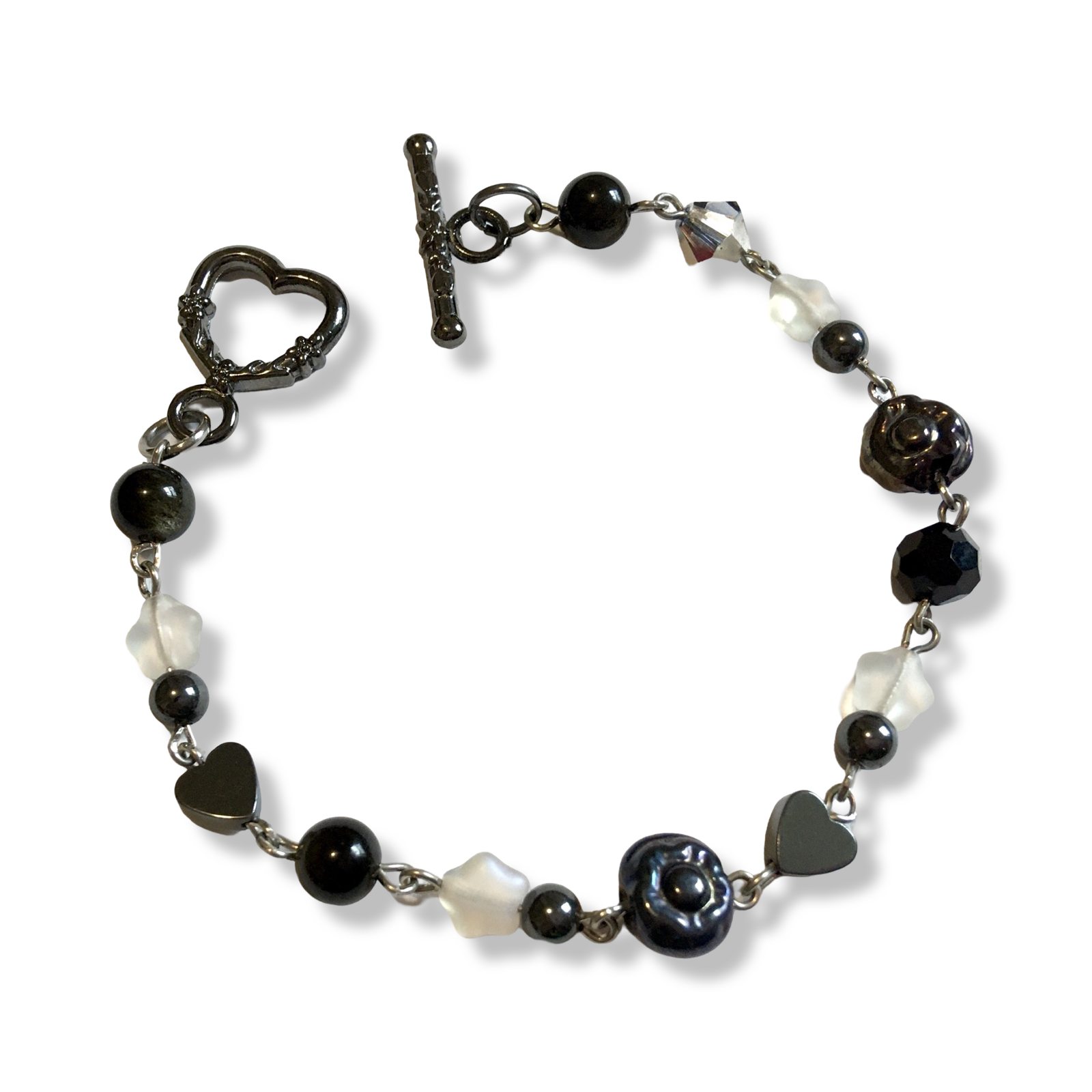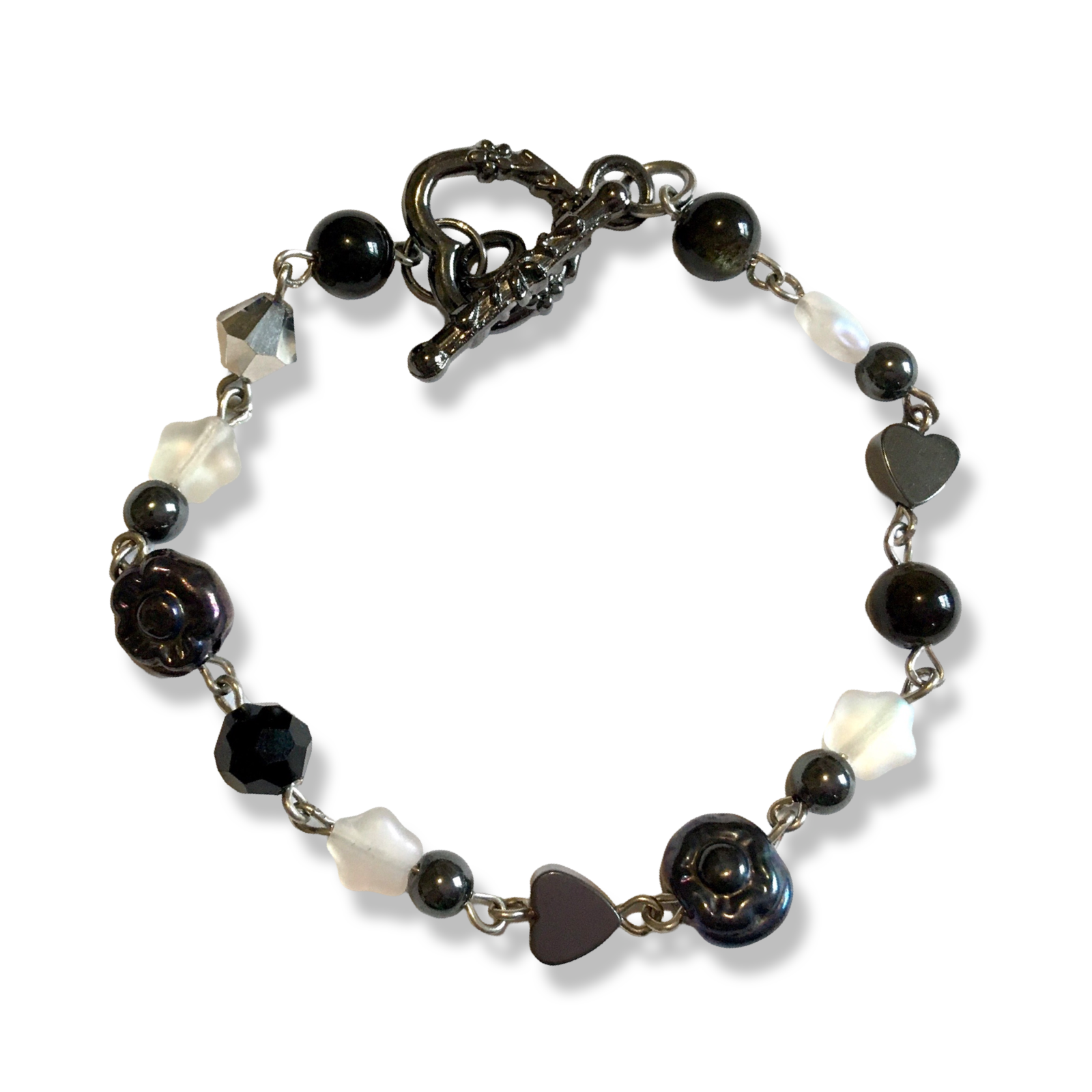 A simple handmade bracelet featuring obsidian orbs, assorted Czech glass and hematite beads, salvaged black flowers, and mini frosted glass stars.