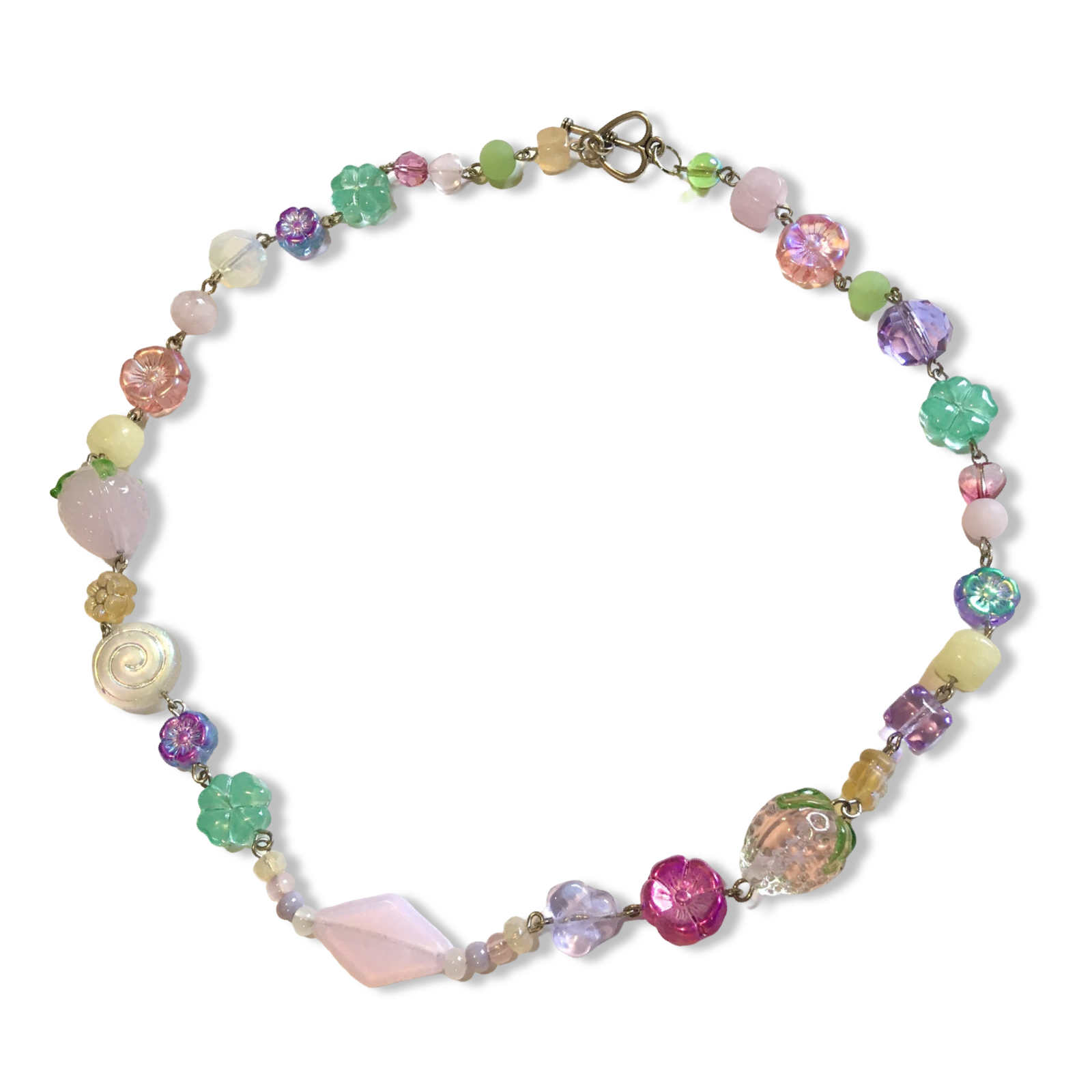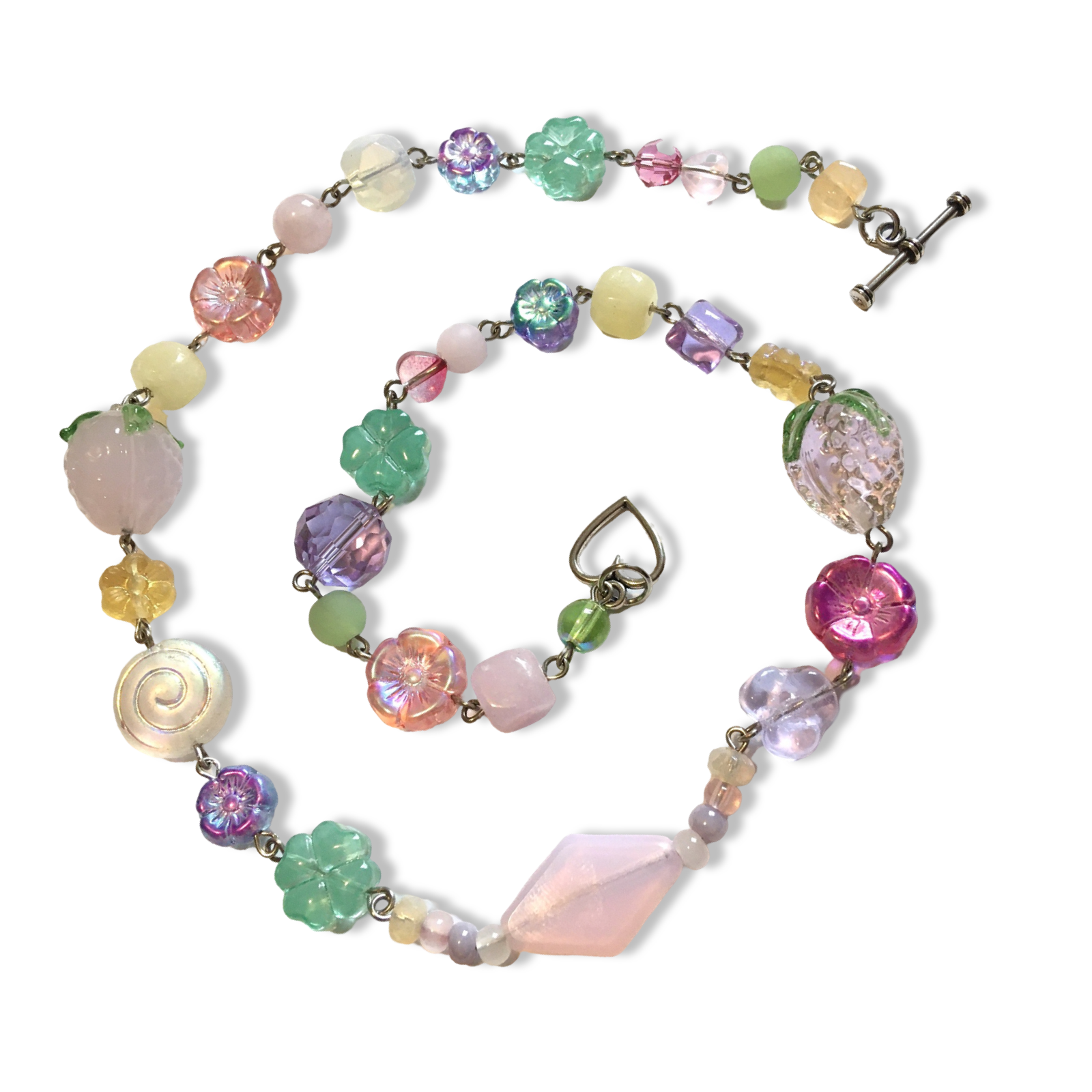 A handmade Czech glass necklace in dreamy pop-kei colors. It features stone and glass flowers, strawberries, clovers, hearts, and assorted shapes.