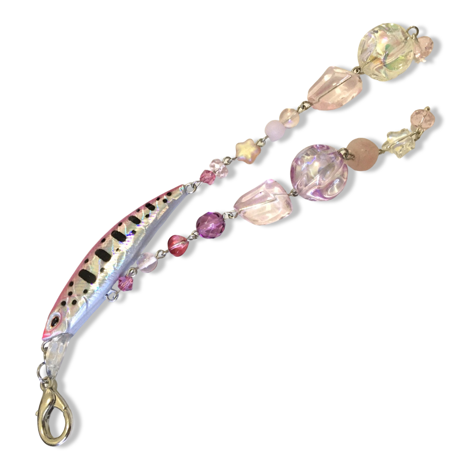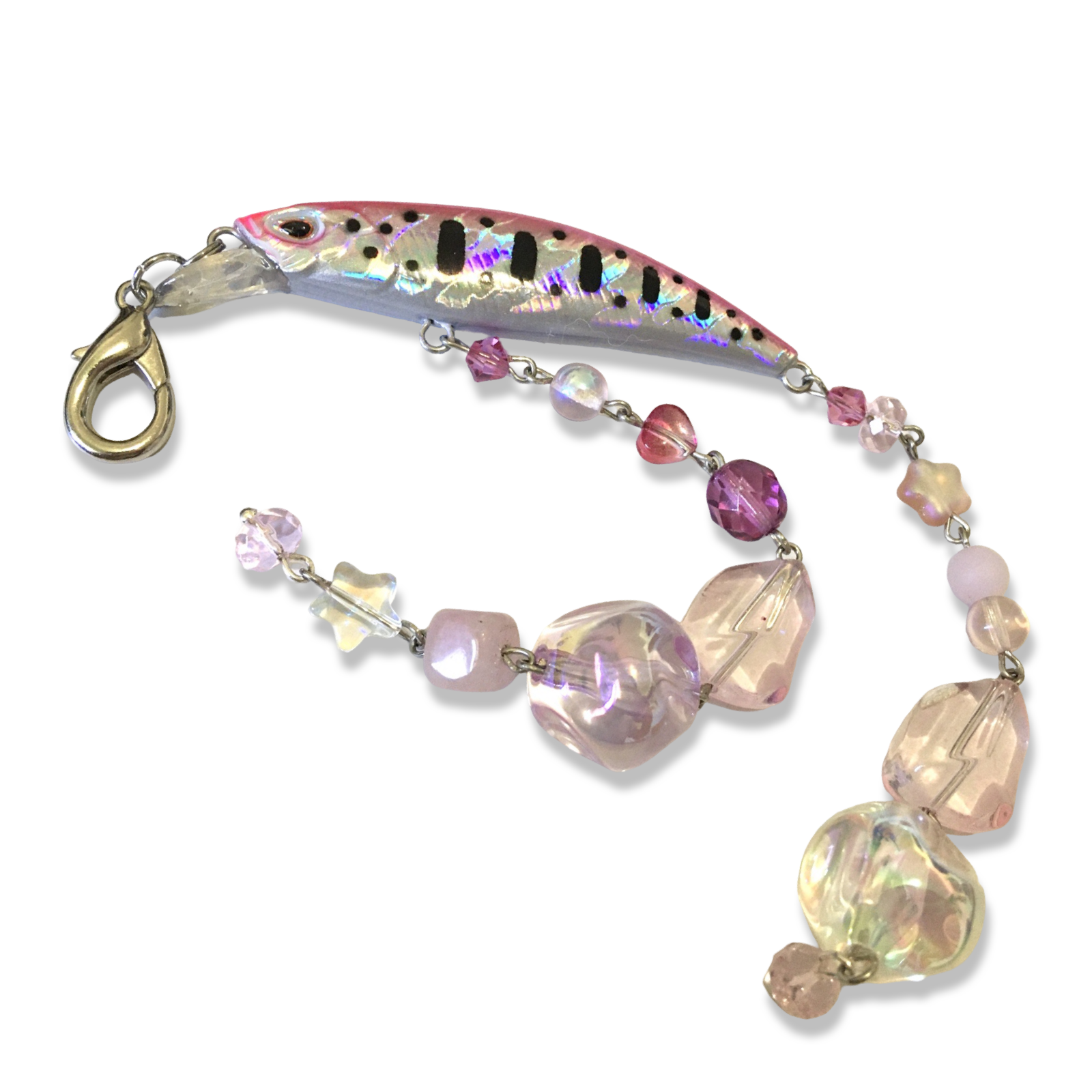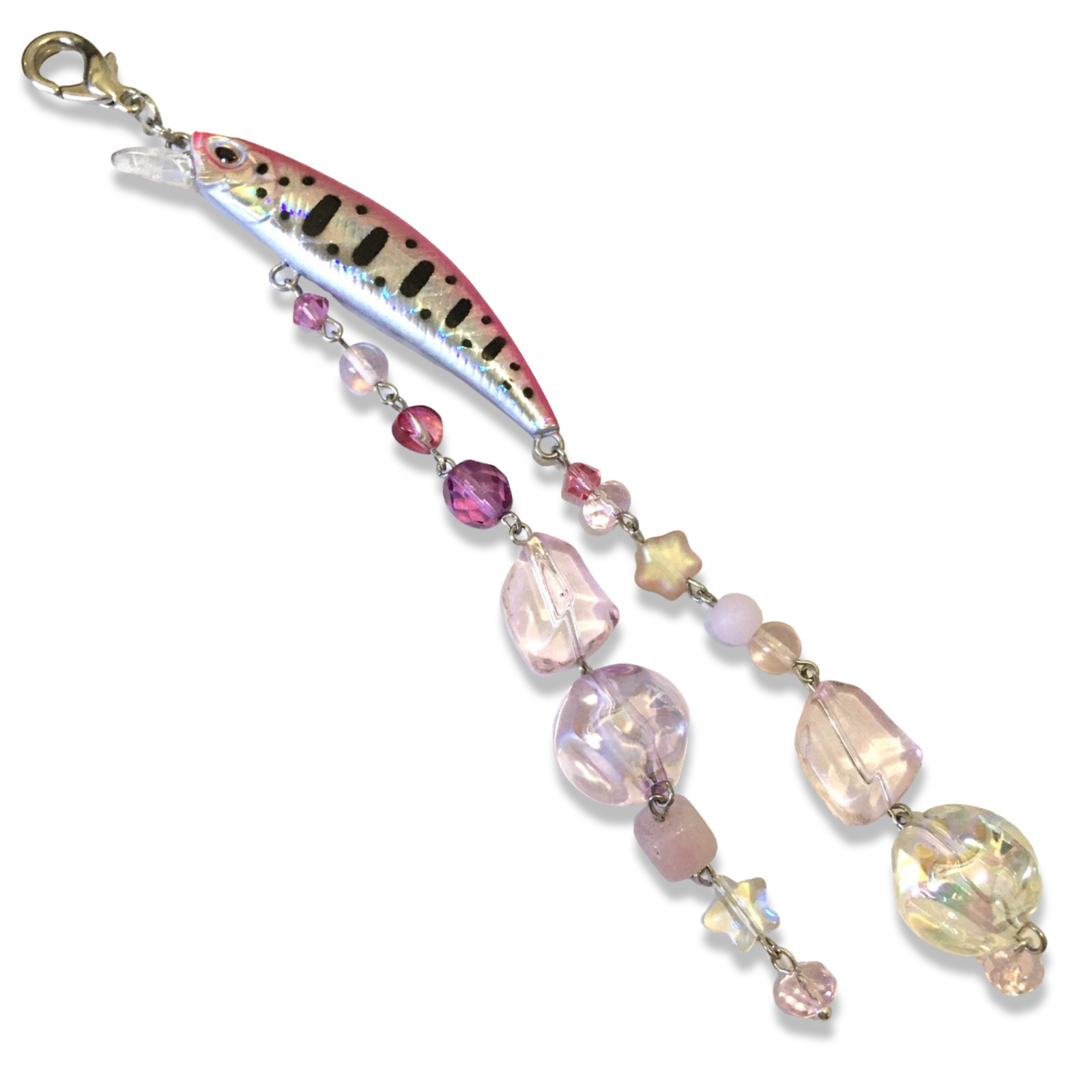 A handmade lobster-clasp charm featuring a holographic fishing lure and an assortment of salvaged glass and plastic beads. Named after the beautiful pink meanie jellyfish!