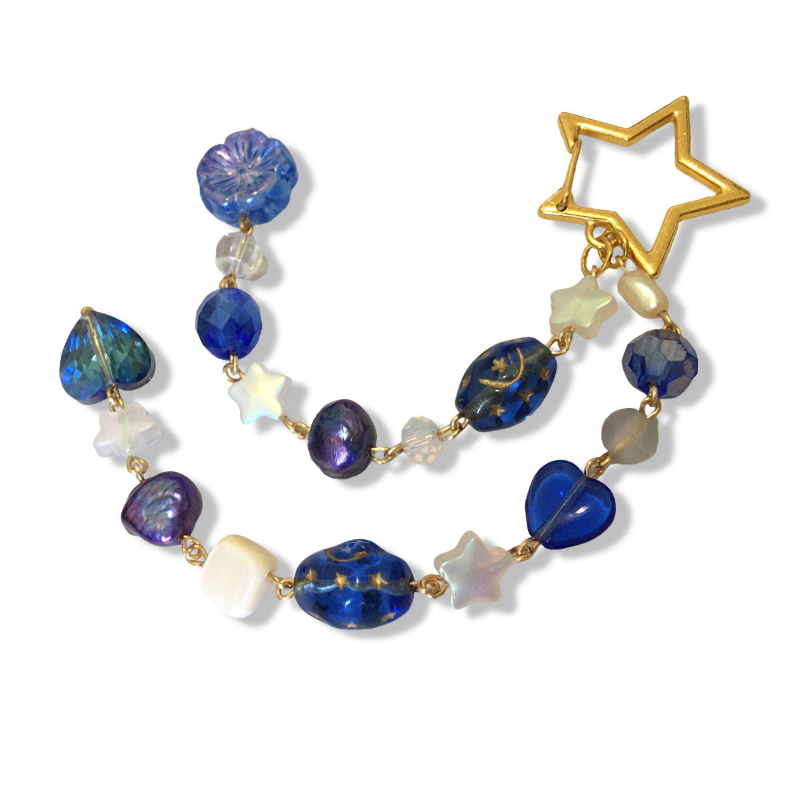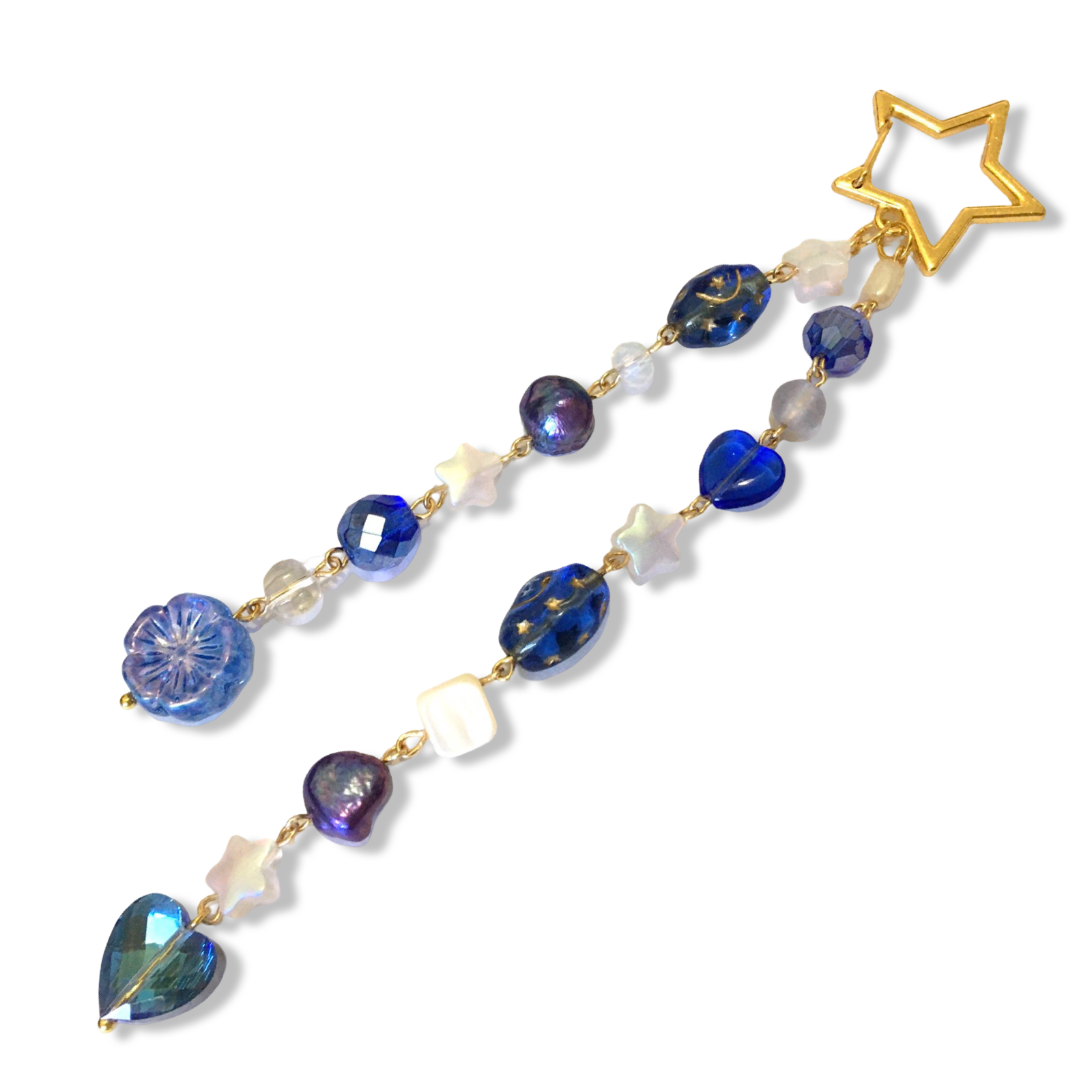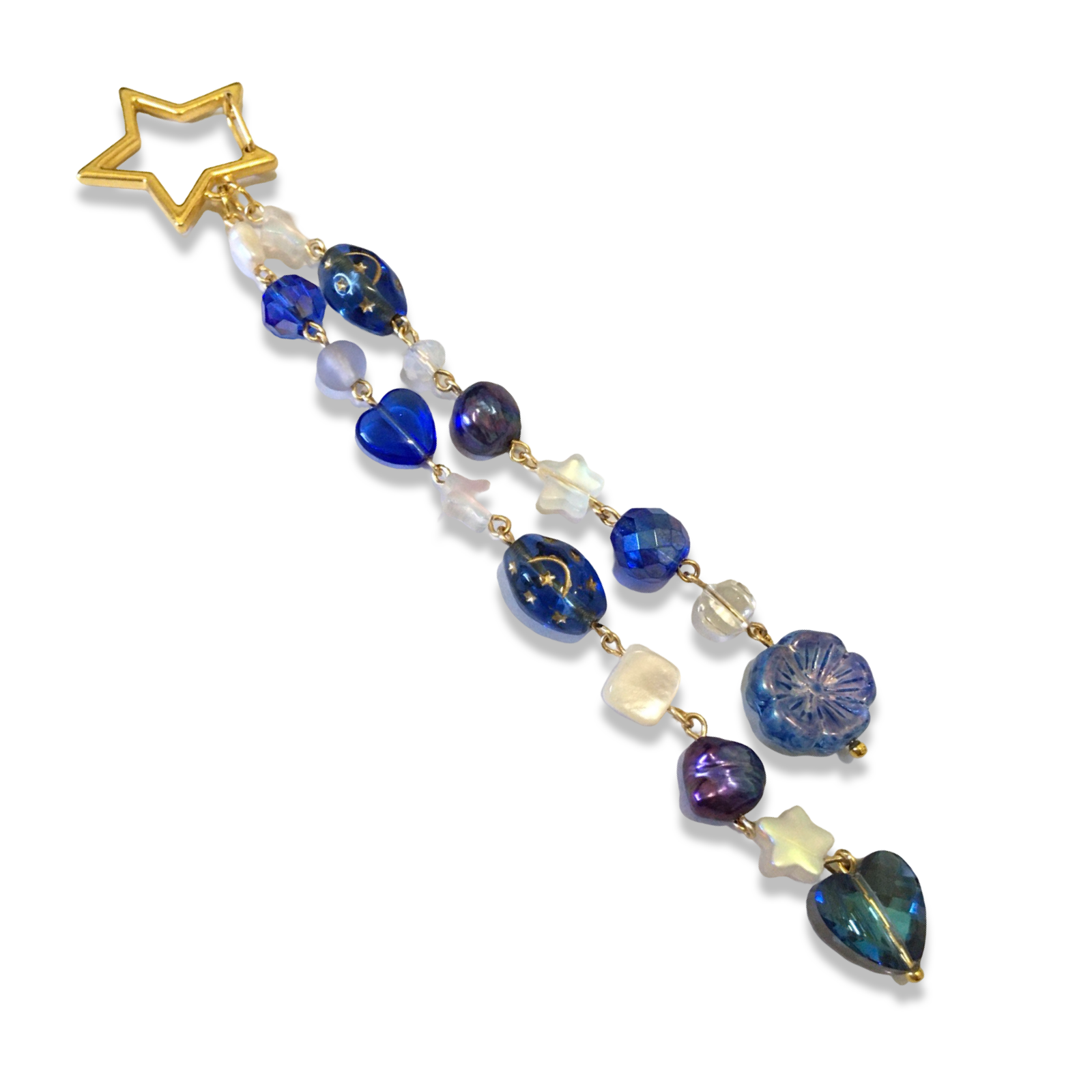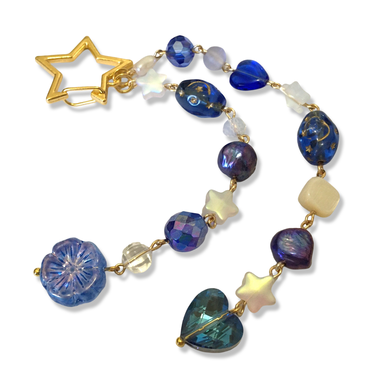 A star-carabiner charm with a starry-sky theme. It features iris luster pearls, frosted Czech glass stars, and an assortment of salvaged glass and plastic beads.