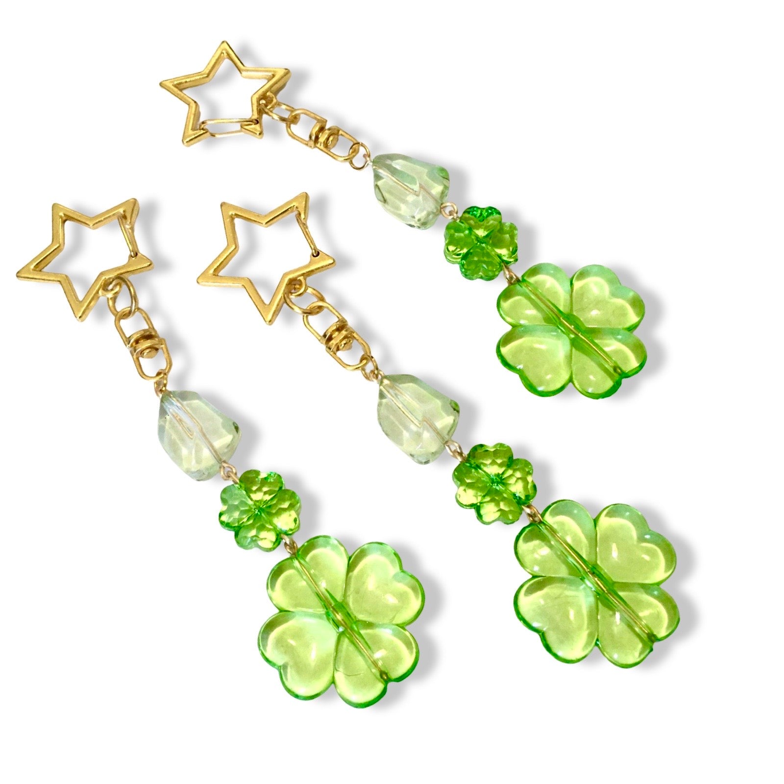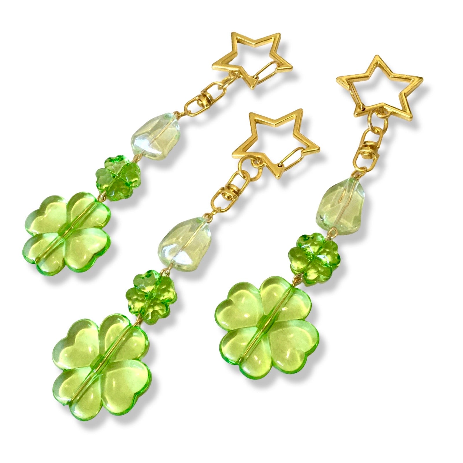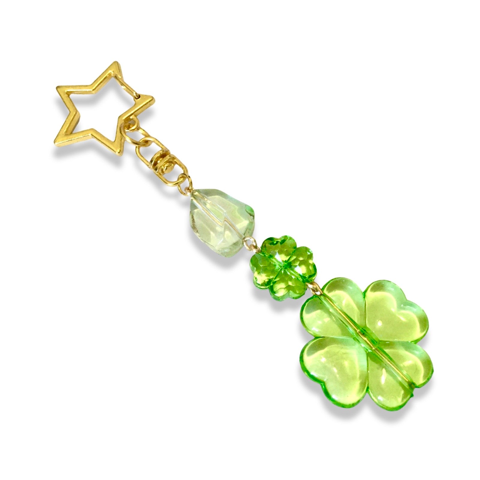 A simple, handmade star-carabiner charm featuring sweet plastic clovers and glass.