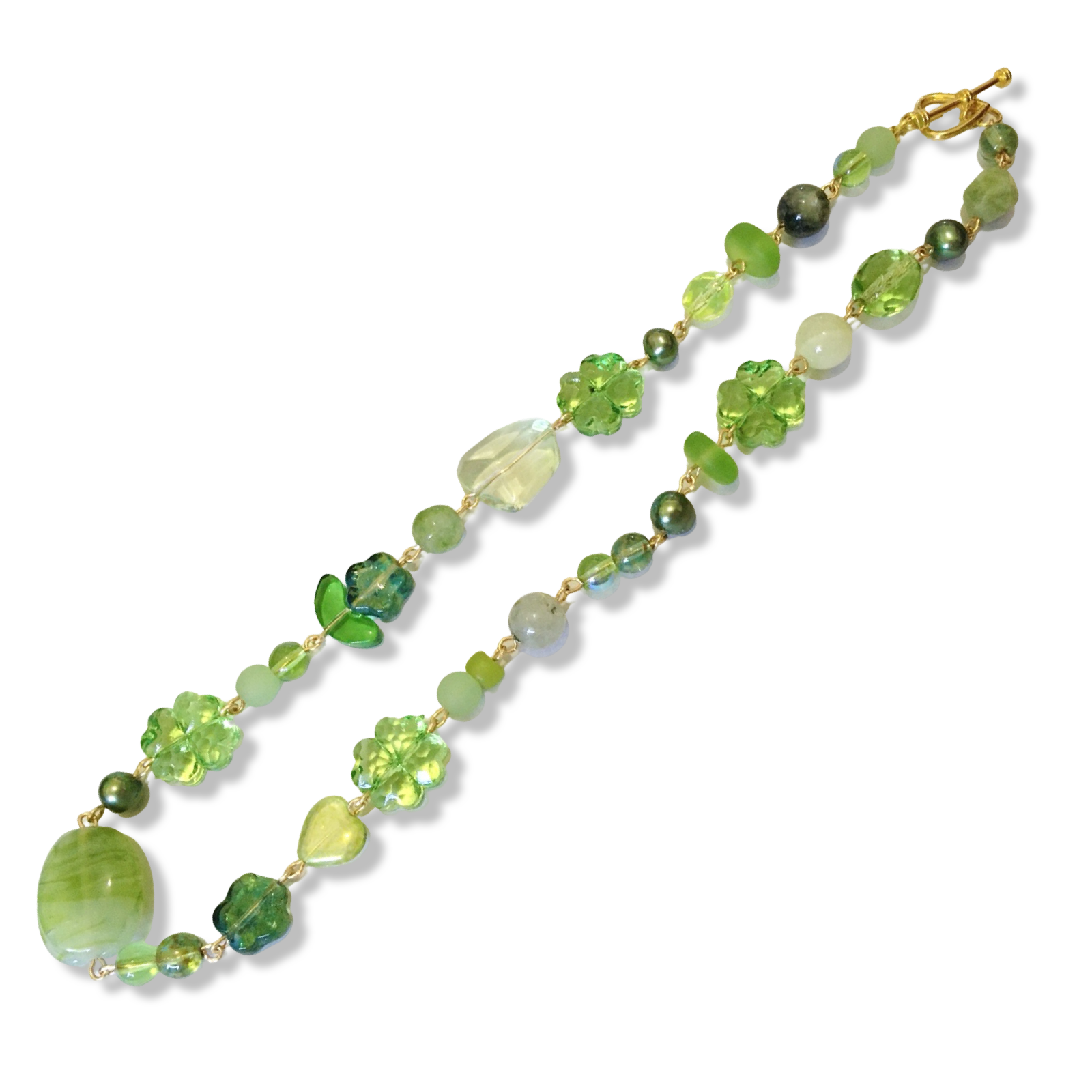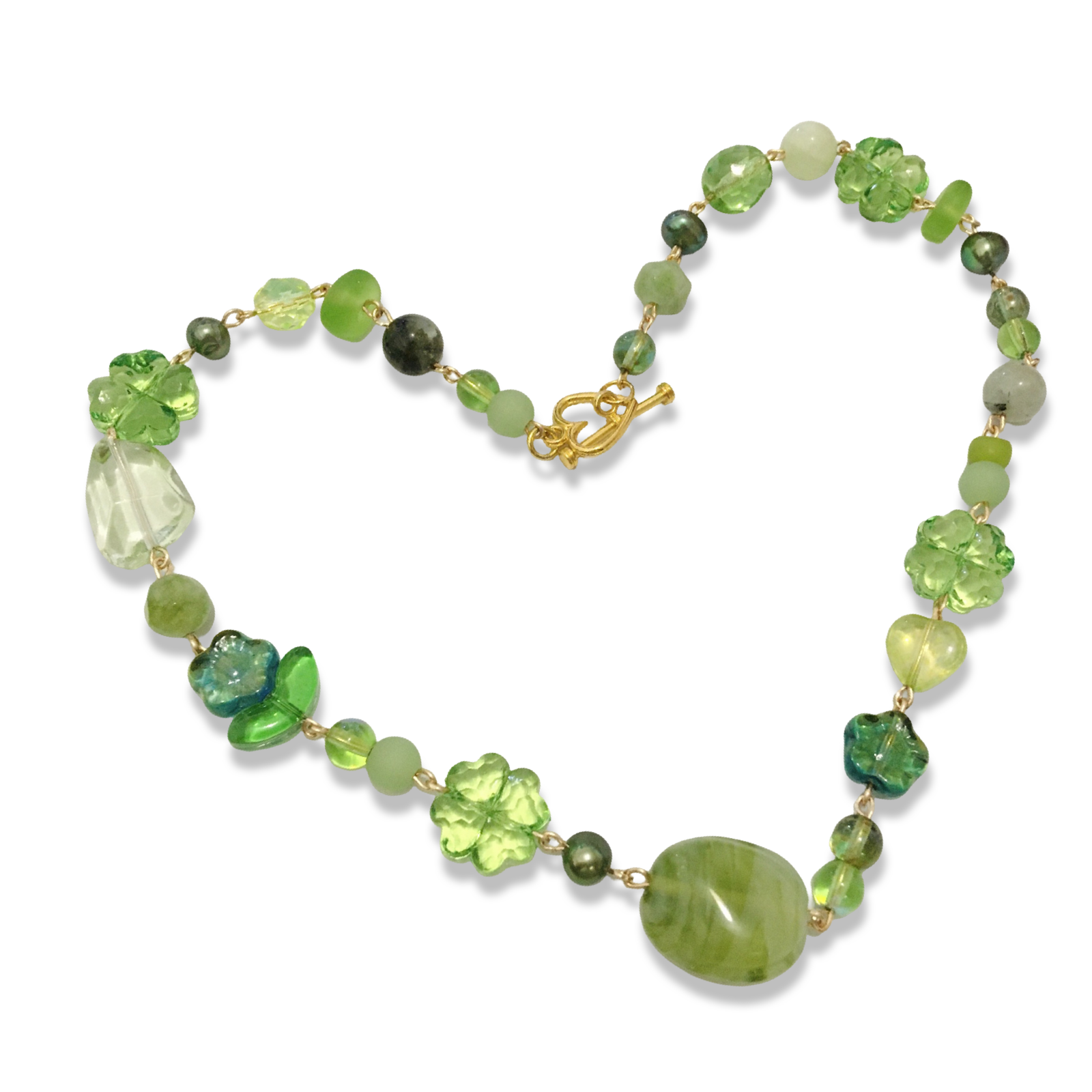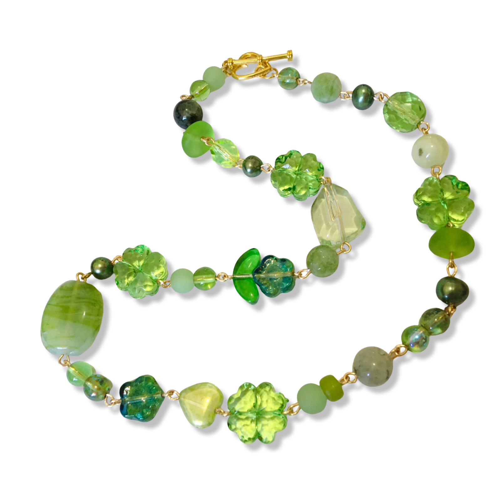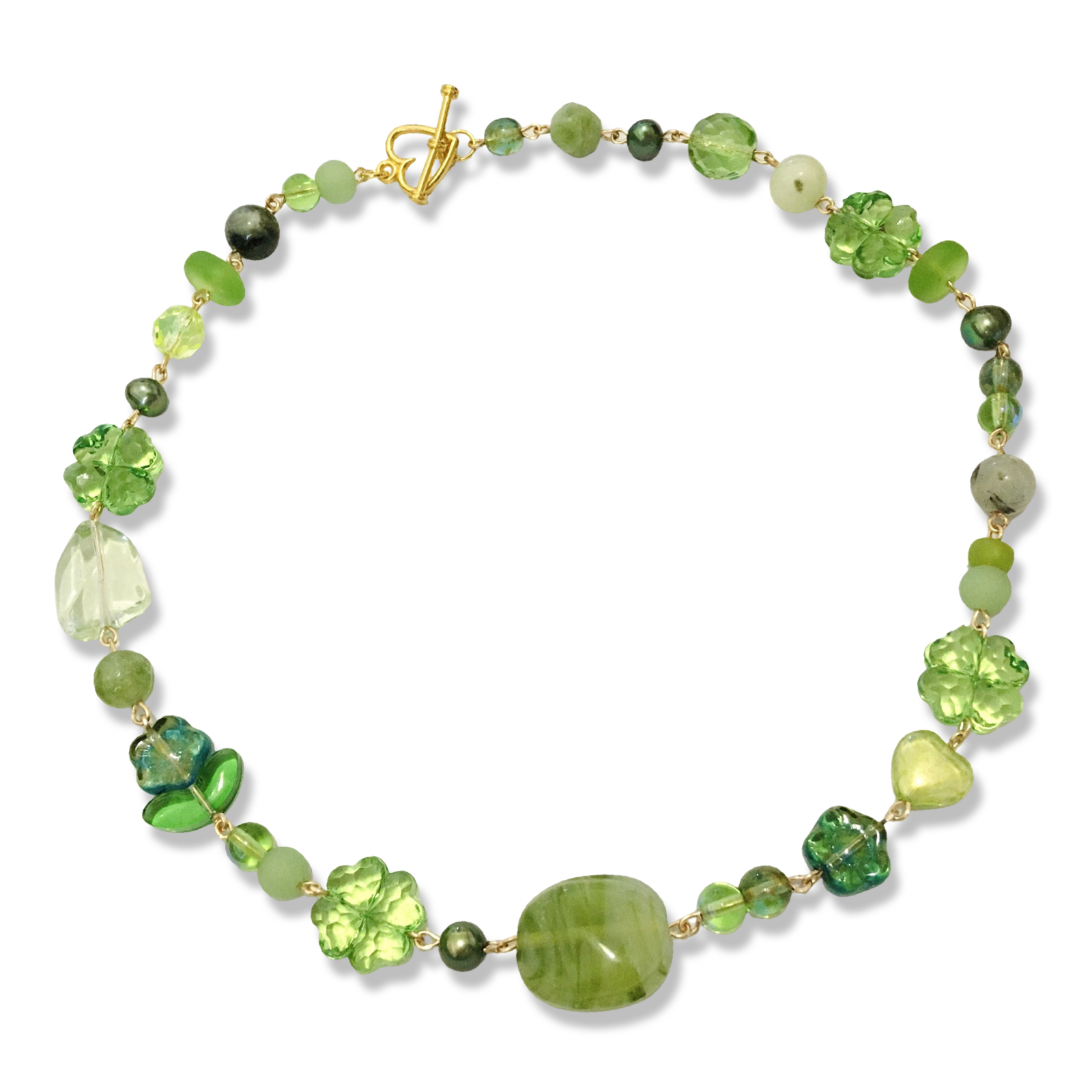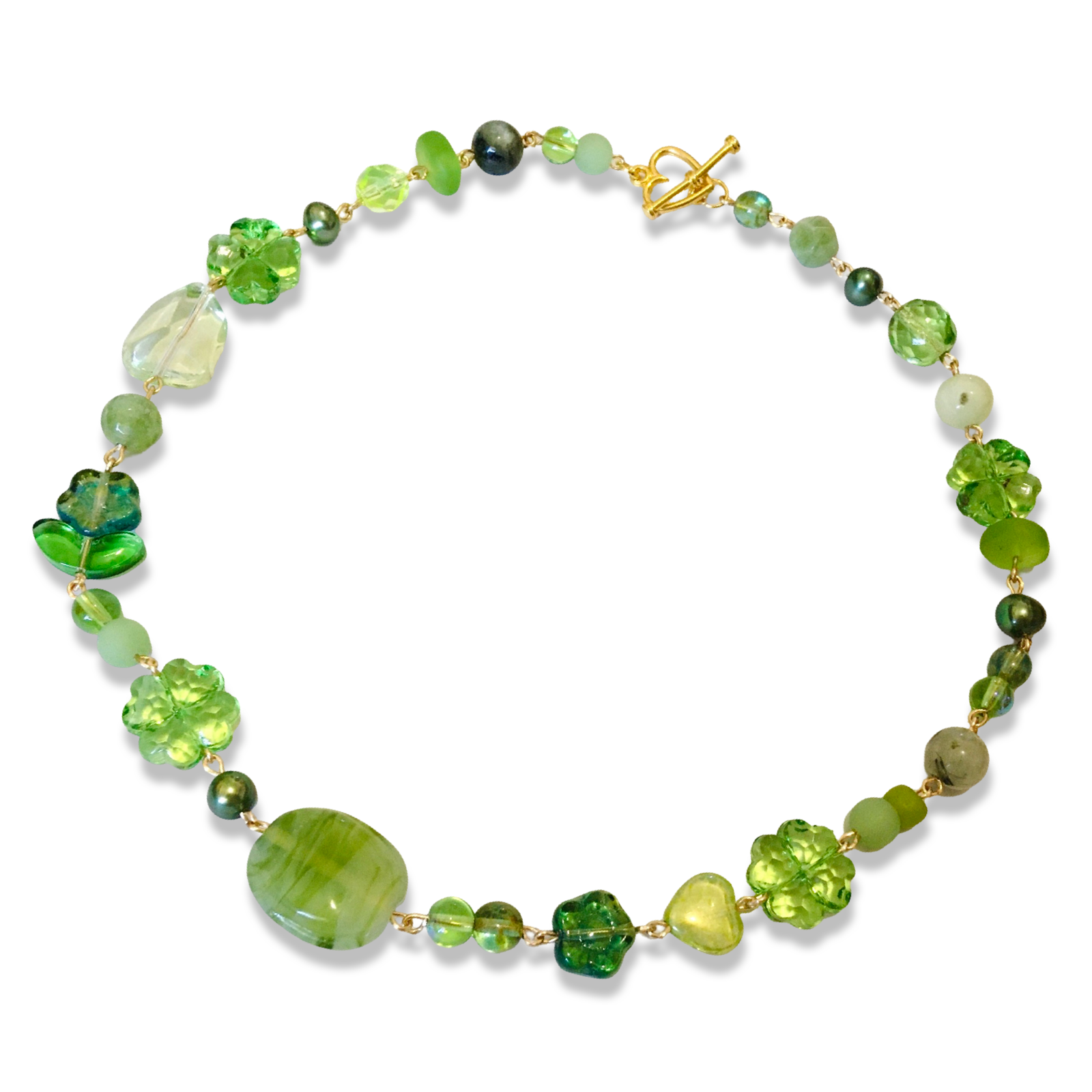A handmade short necklace in green featuring Czech glass hearts and flowers, freshwater pearls in emerald, sea glass, plastic clovers, and an assortment of salvaged beads made from glass, plastic and semiprecious stones.
