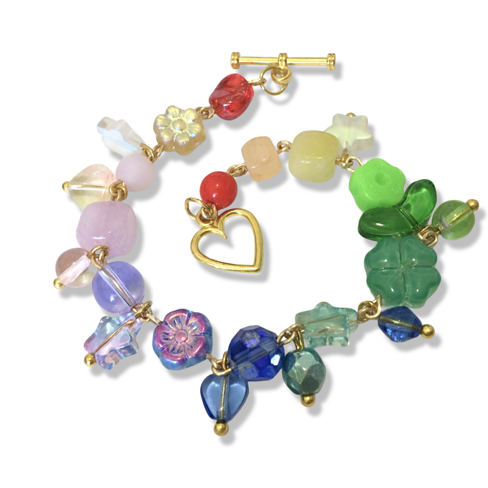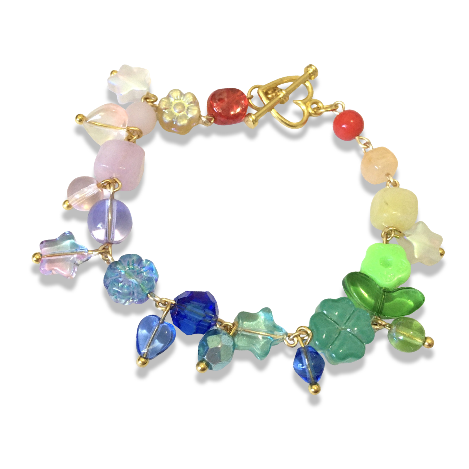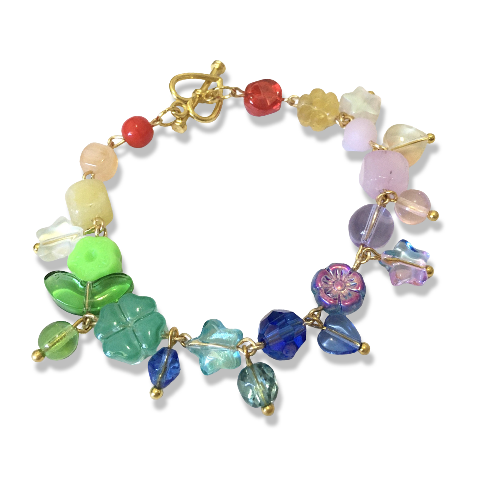 A handmade rainbow bracelet featuring salvaged glass and plastic beads, stone cubes, and Czech glass stars and flowers.