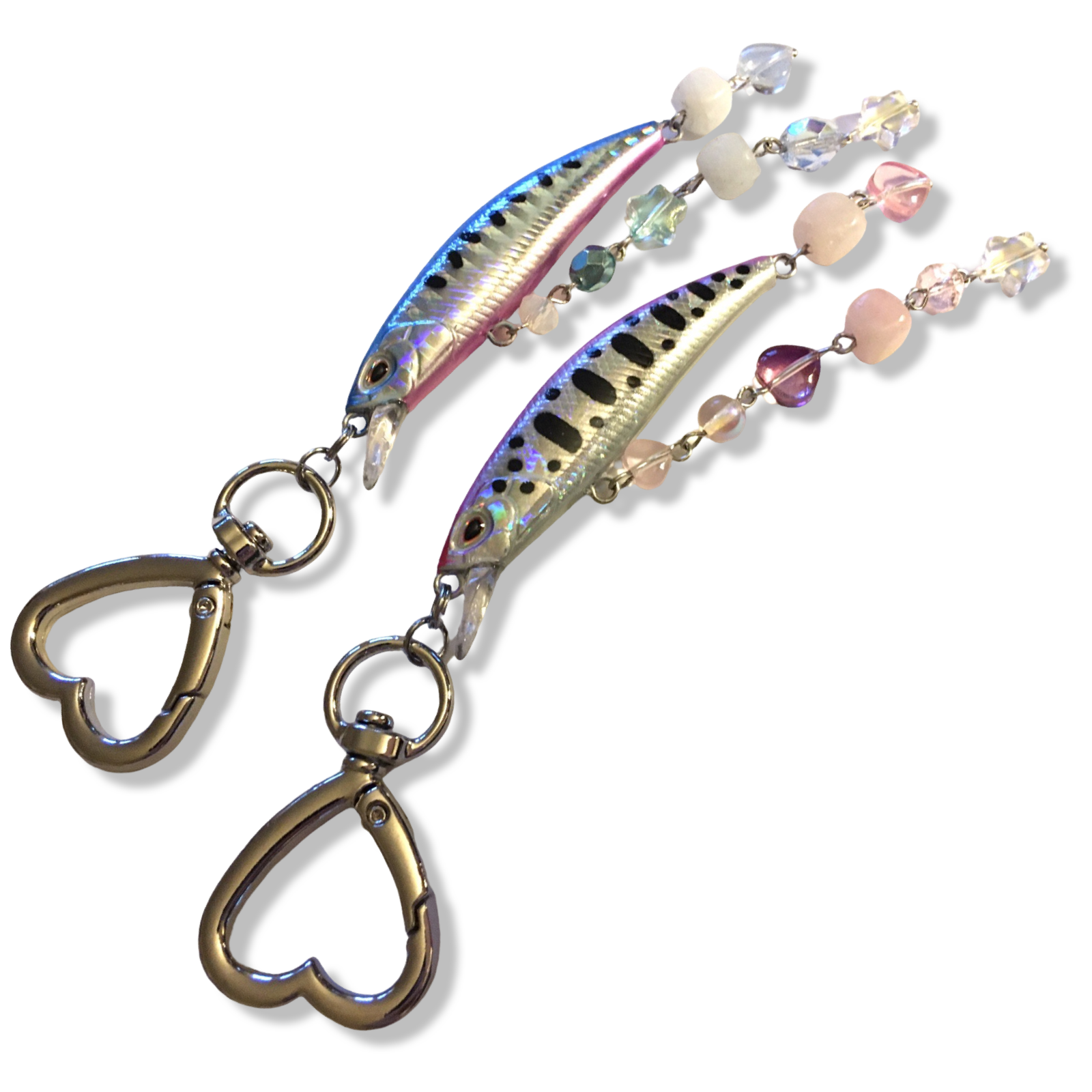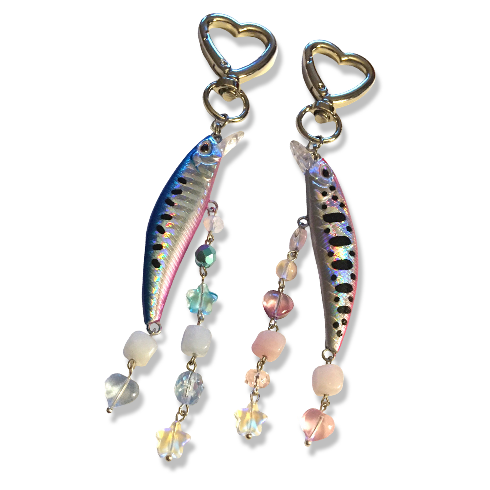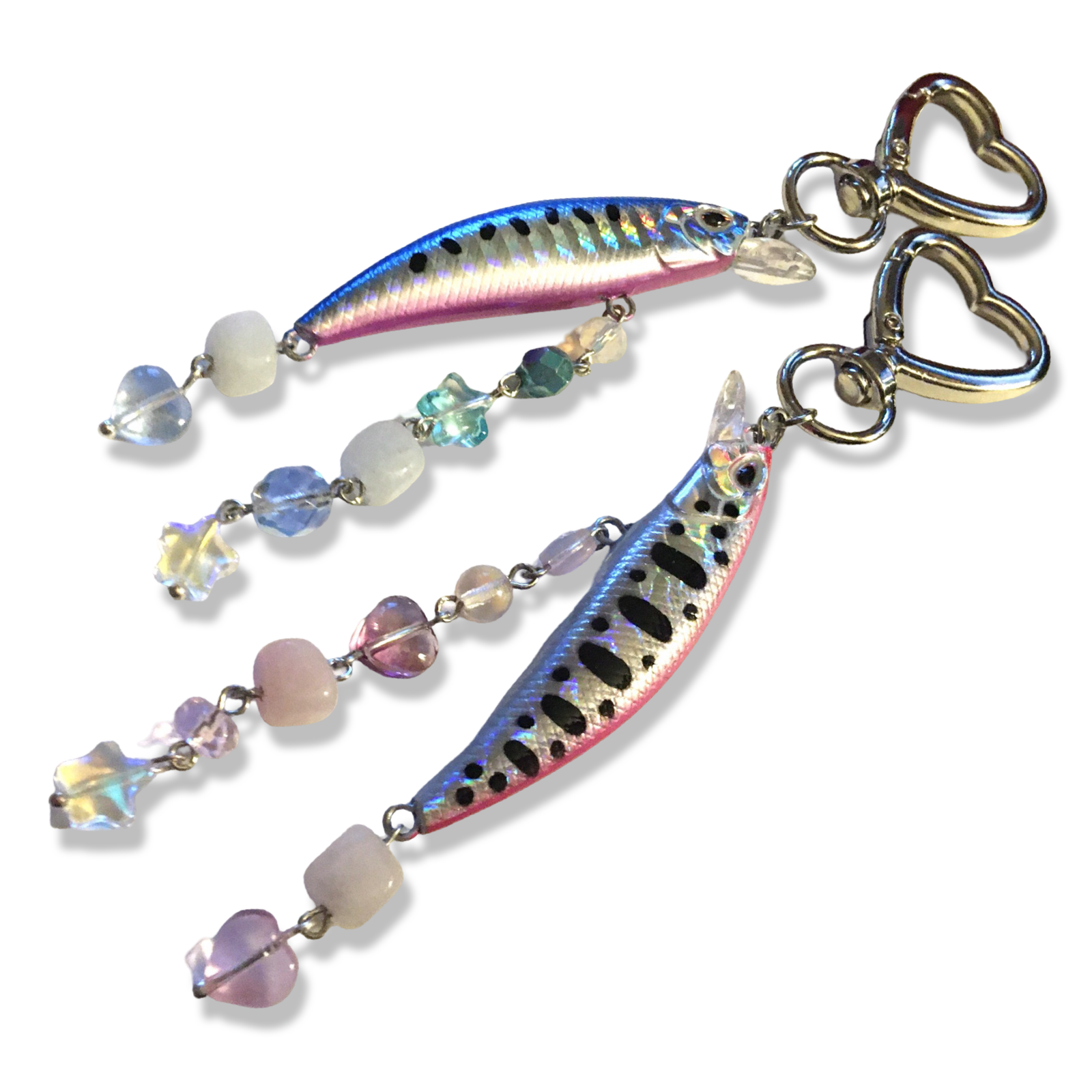 A simple pair of two heart-carabiner charms, made with holographic fishing lures and assorted beads in soft pinks and blues.