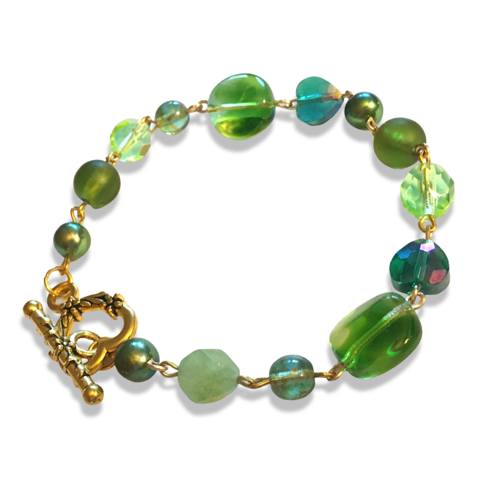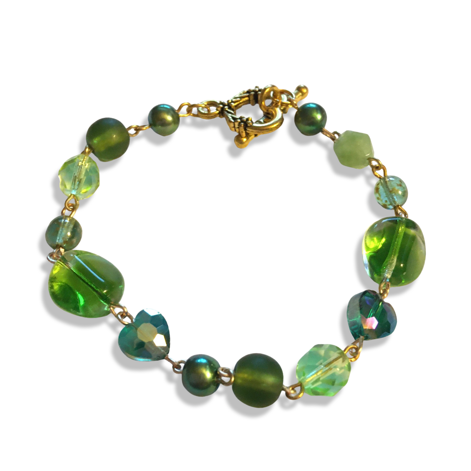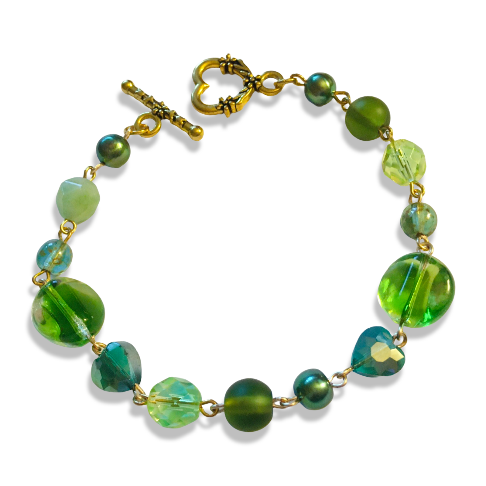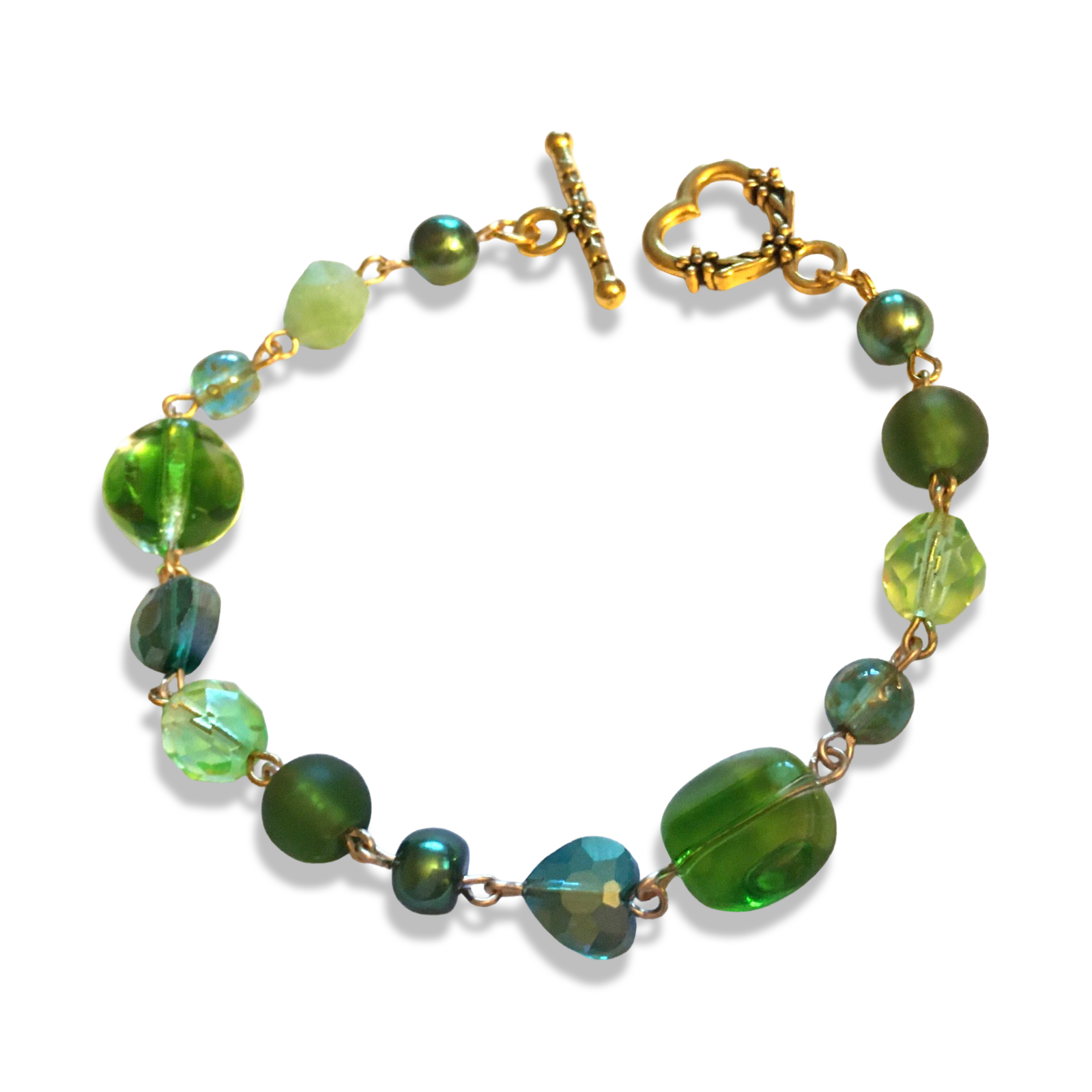 A handmade bracelet in summery forest greens, featuring emerald freshwater pearls and an assortment of glass and stone beads.