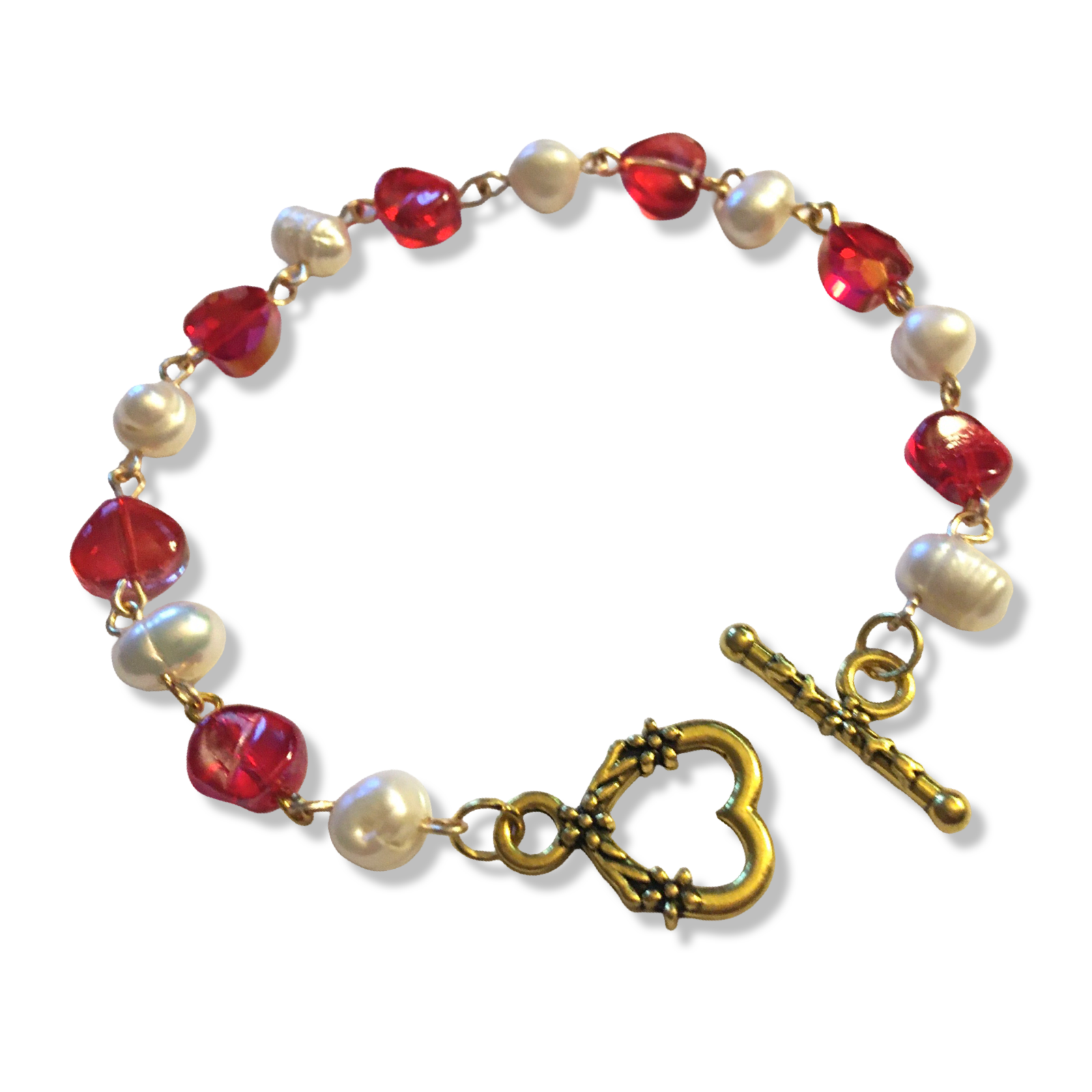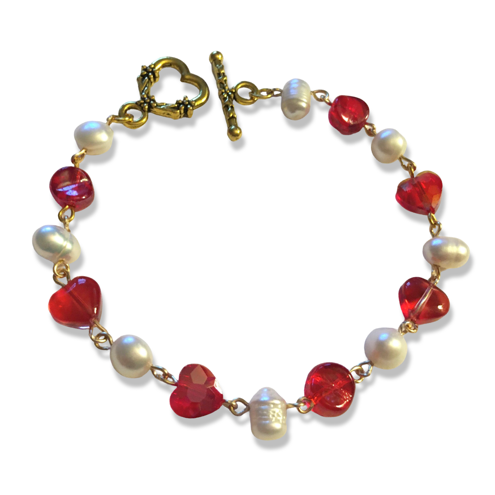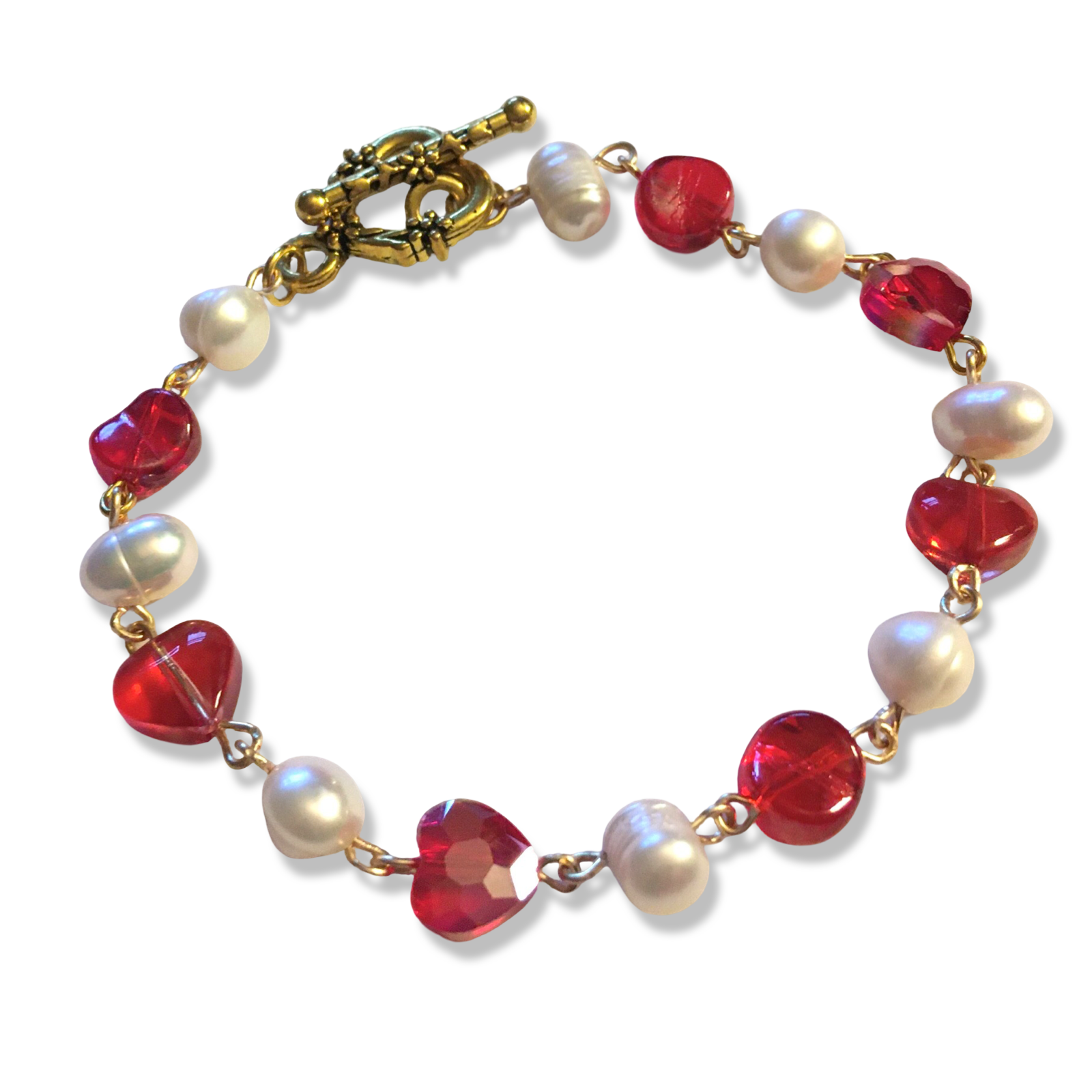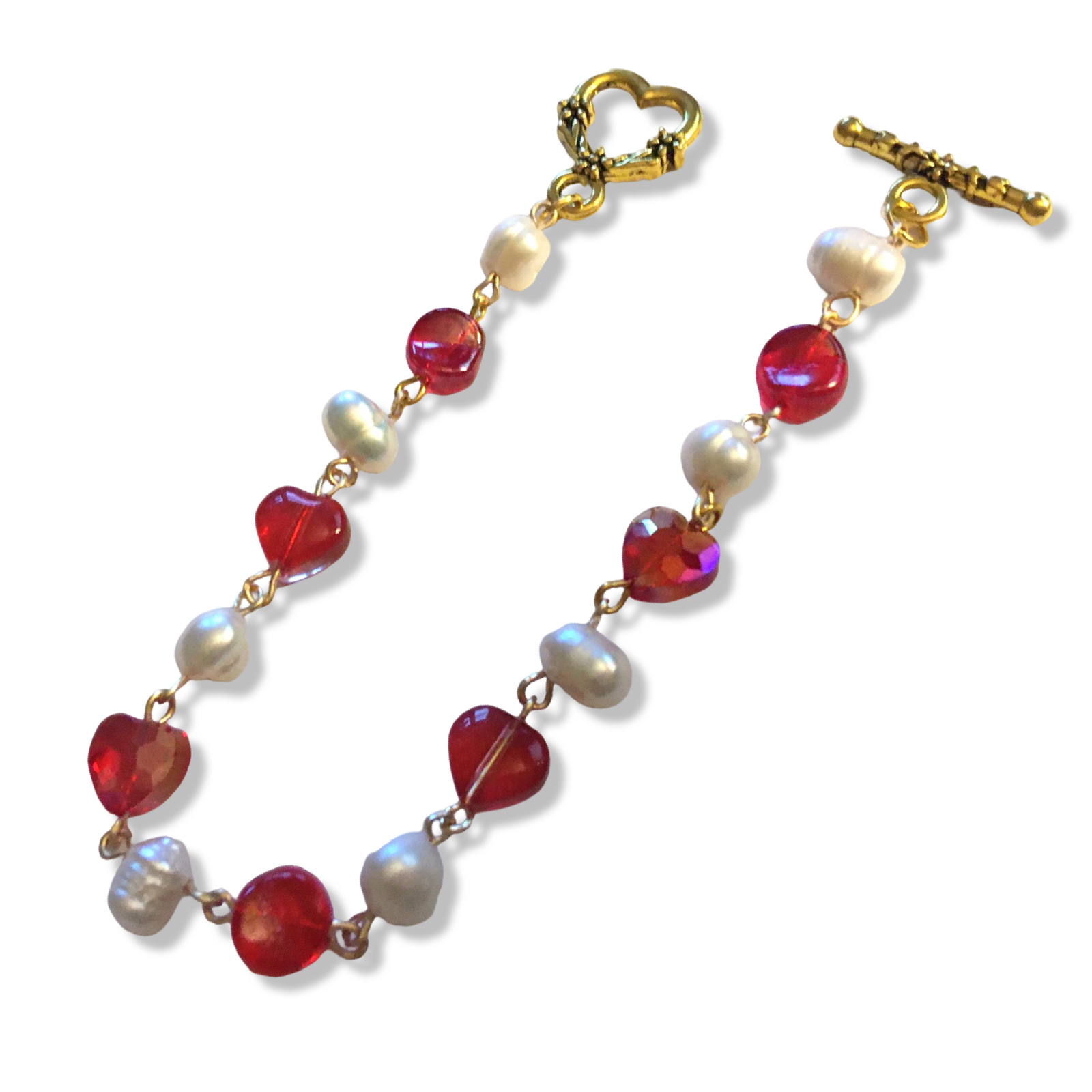A simple handmade bracelet featuring Czech glass hearts and white freshwater pearls.