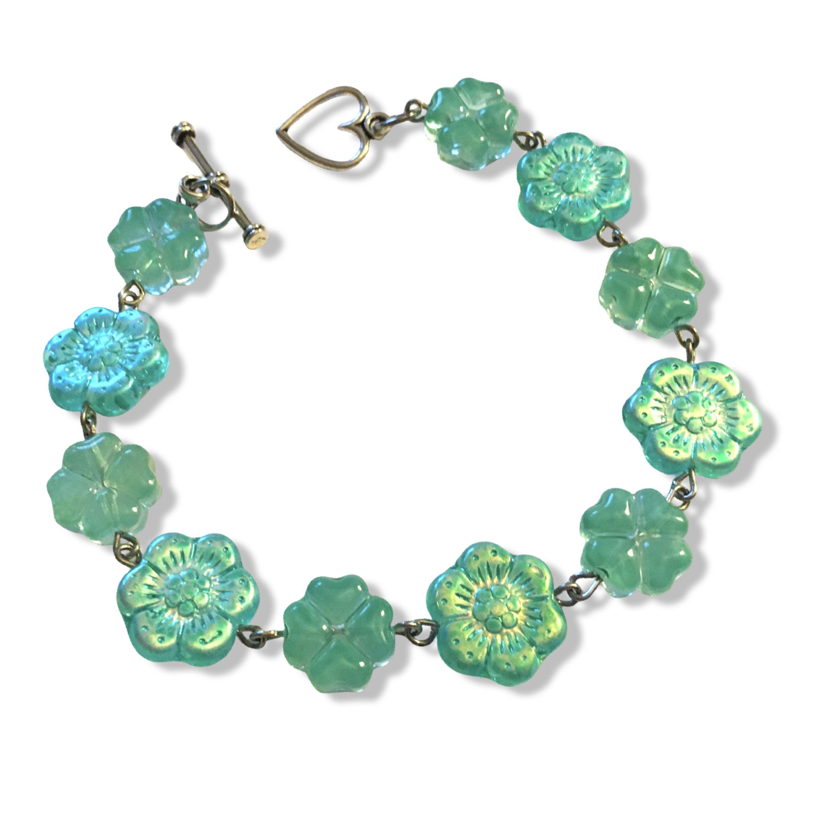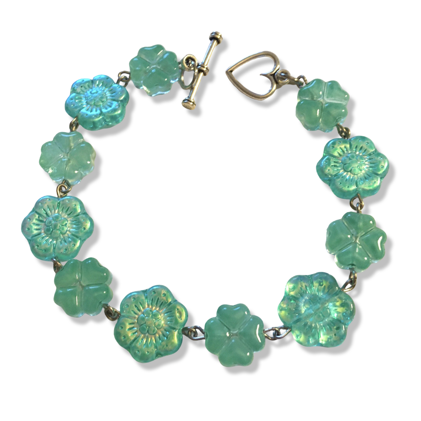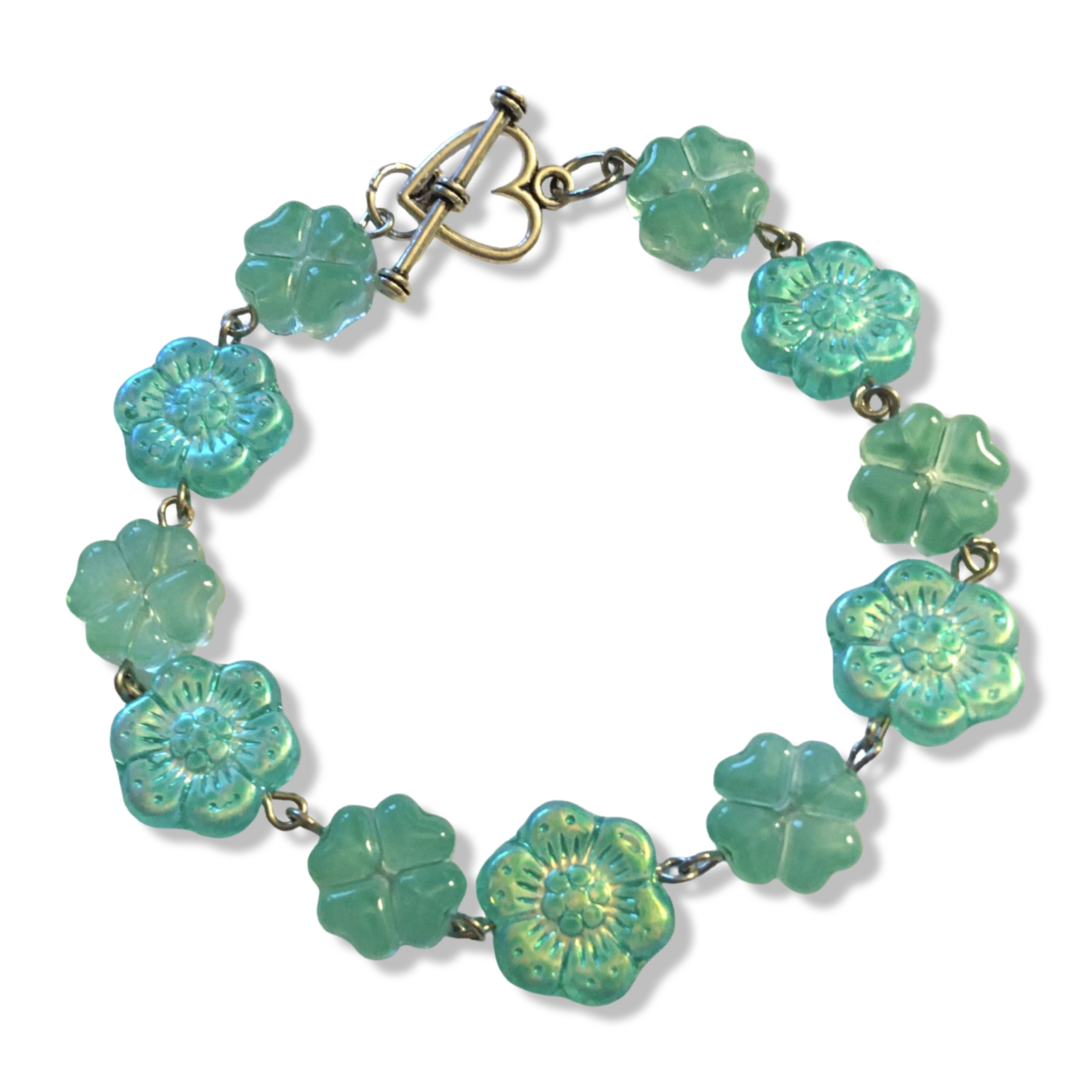 A cute and simple handmade bracelet featuring iridescent Czech glass flowers and mint blue clovers.