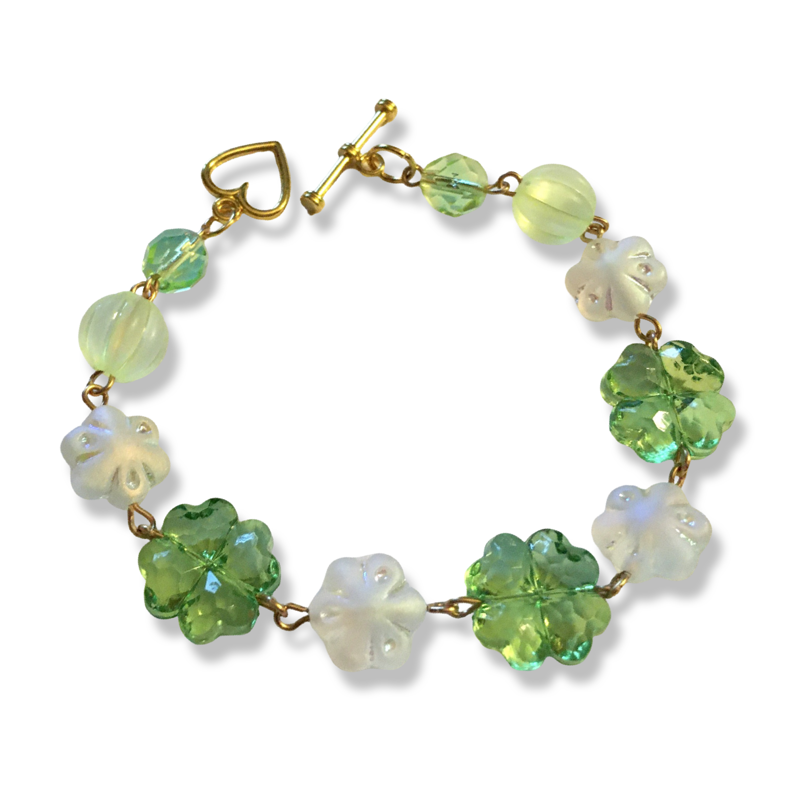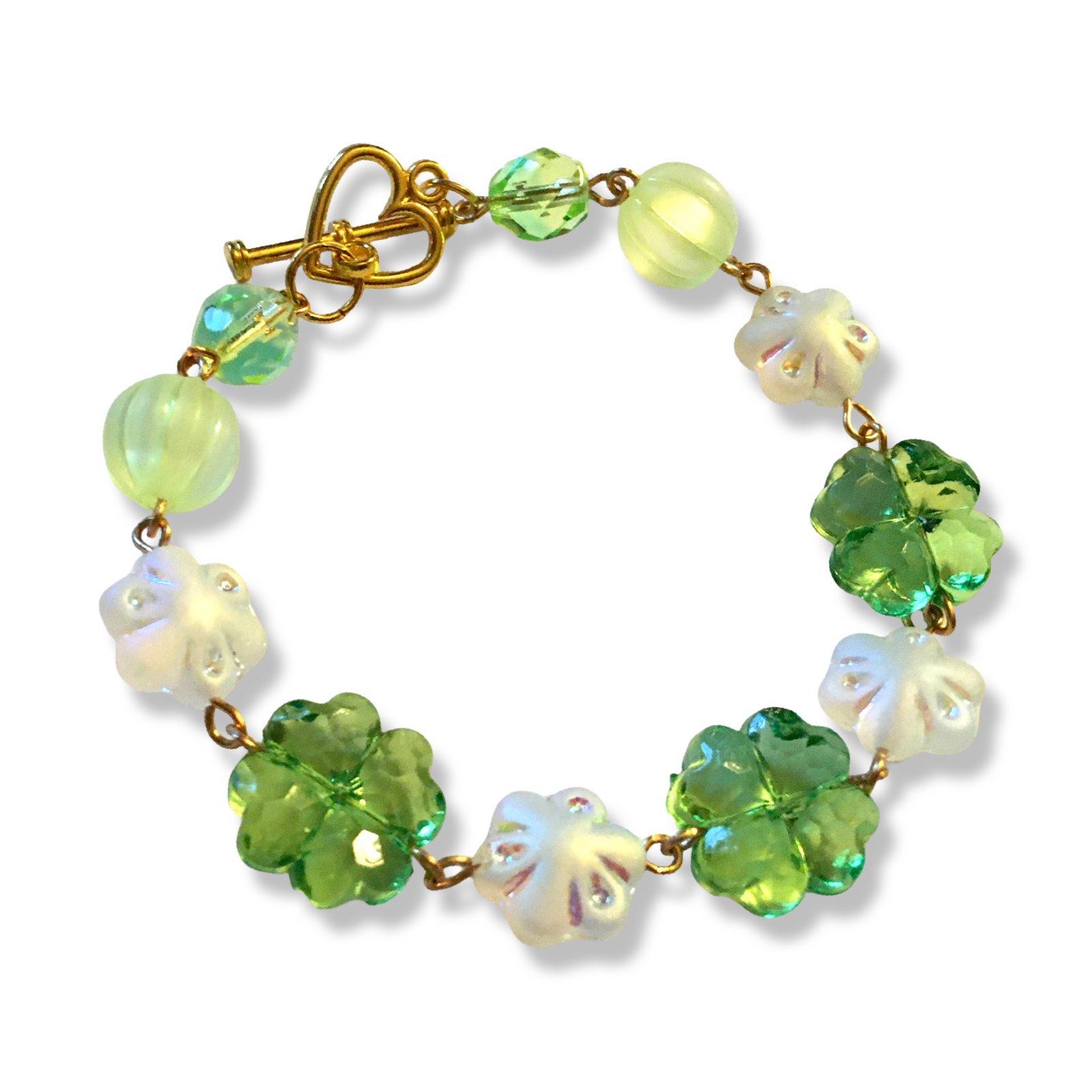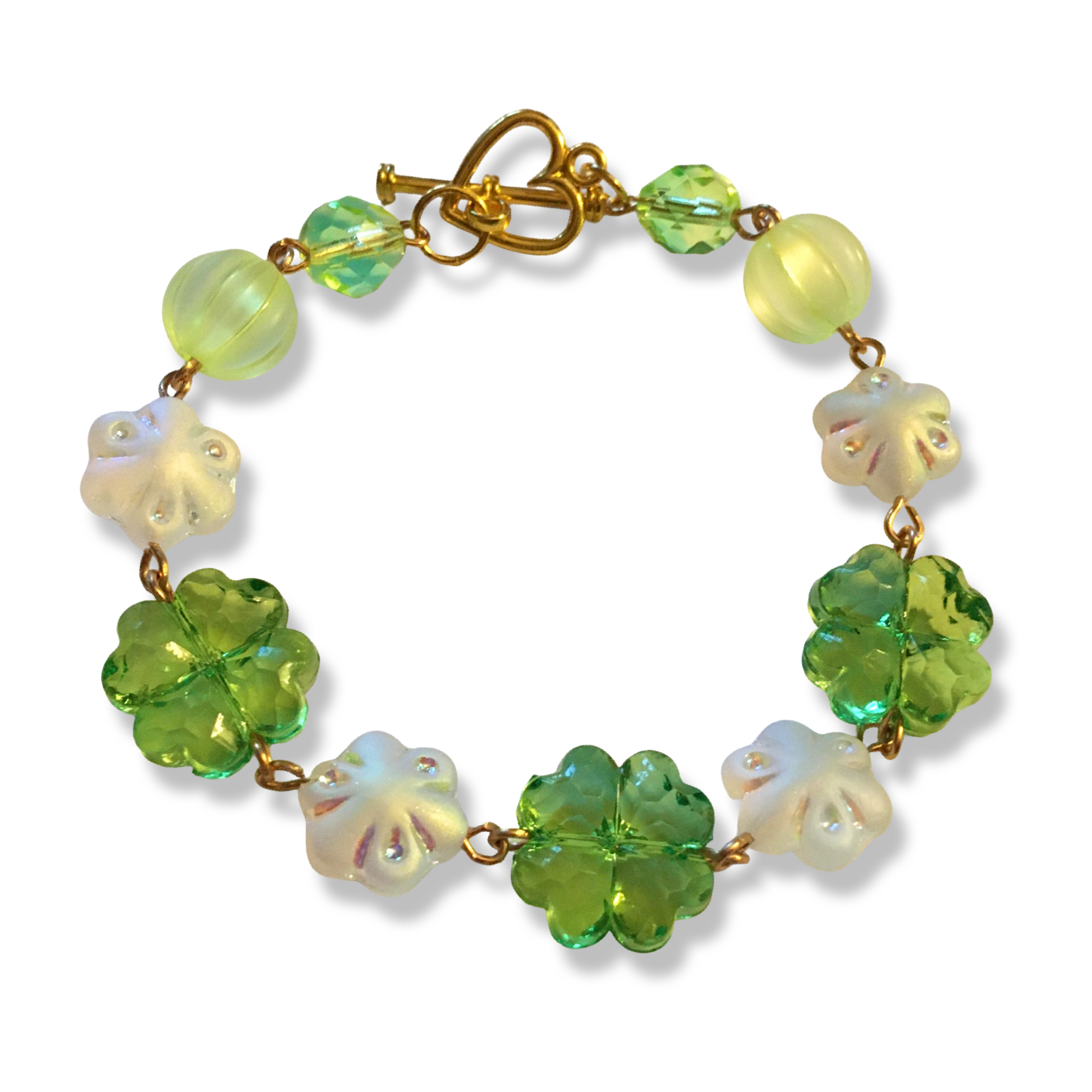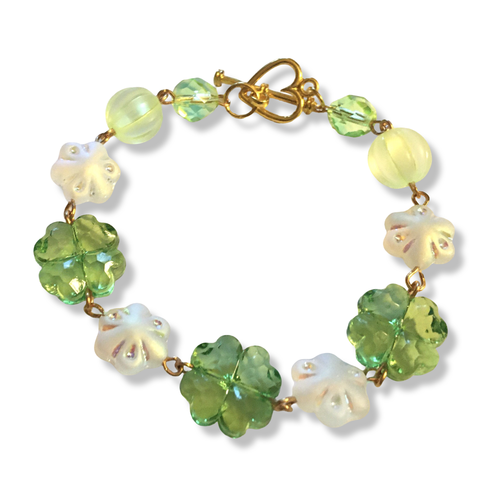 A handmade bracelet in bright green, featuring frosted Czech glass flowers and cute plastic clovers.