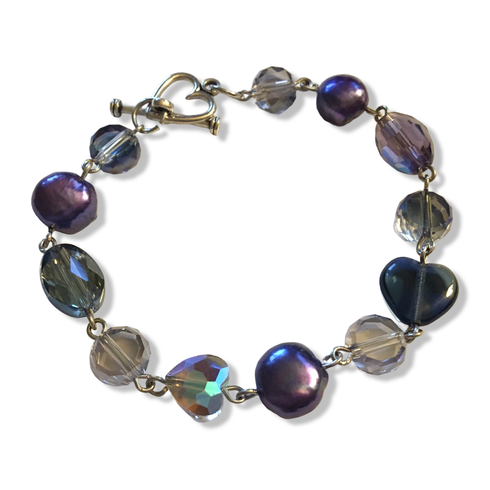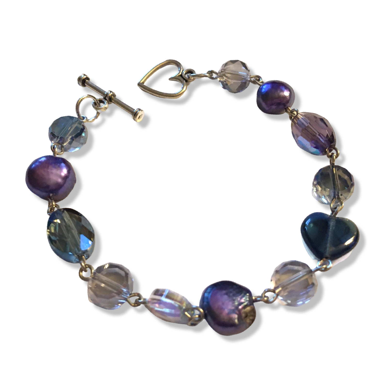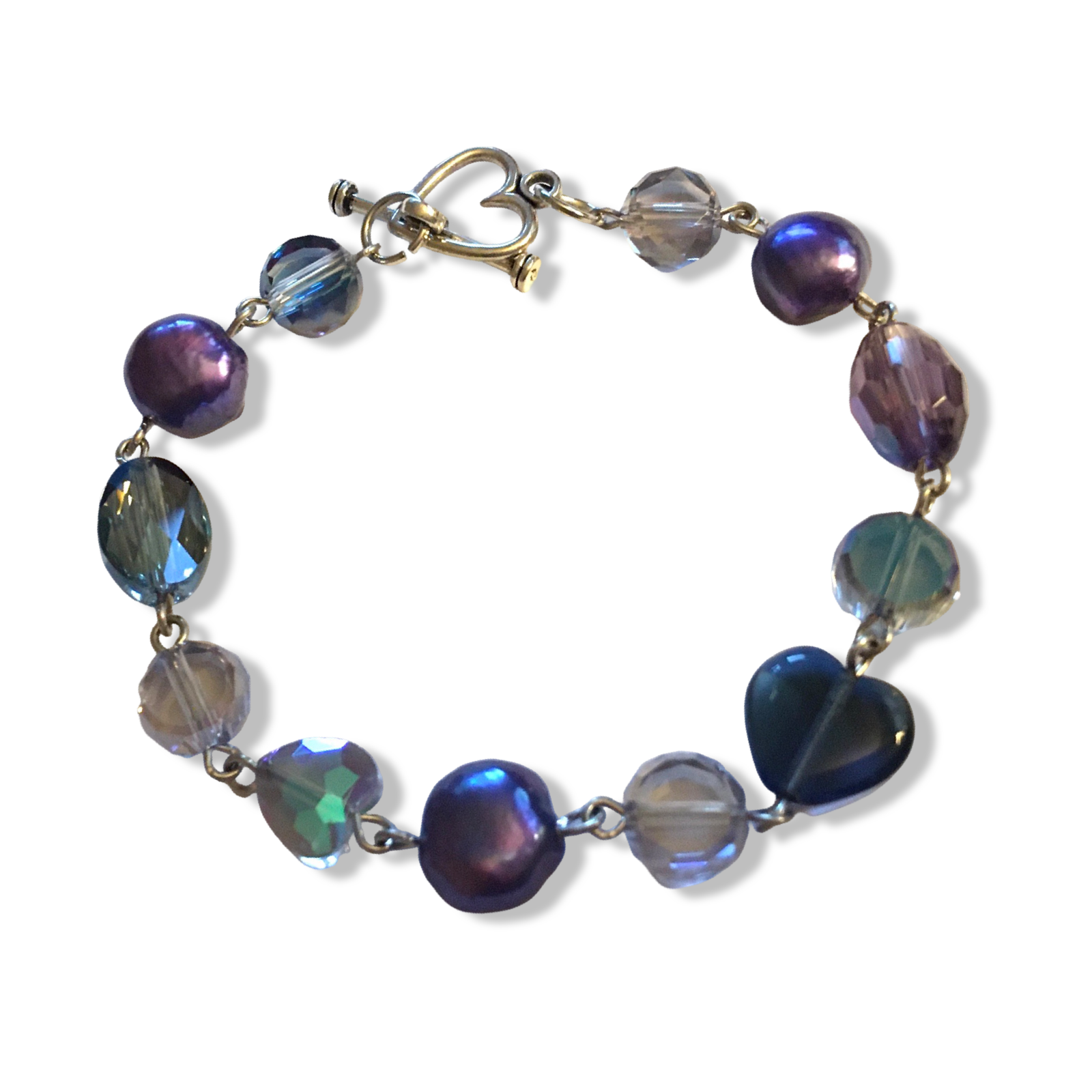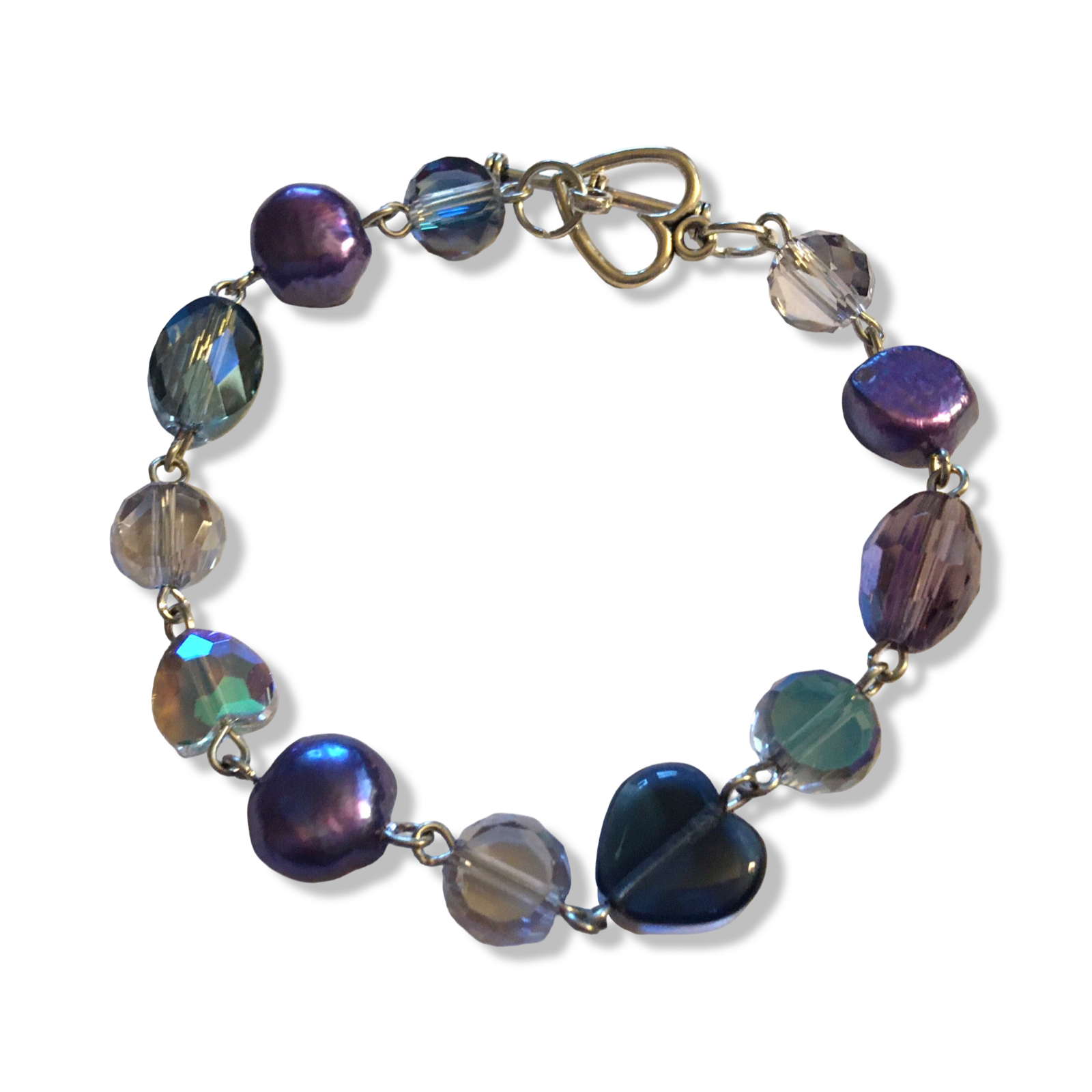A handmade bracelet in deep blues and purples, featuring prismatic Czech glass beads and iris-luster freshwater pearls.