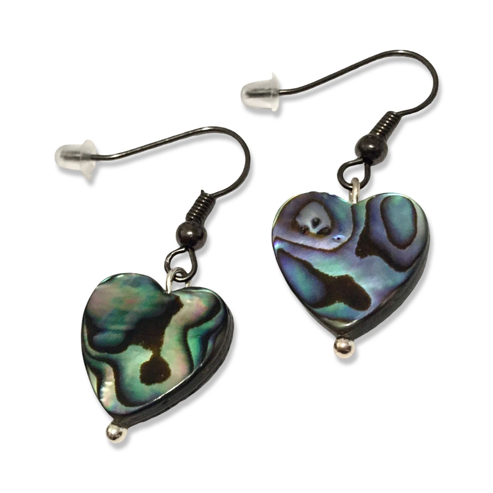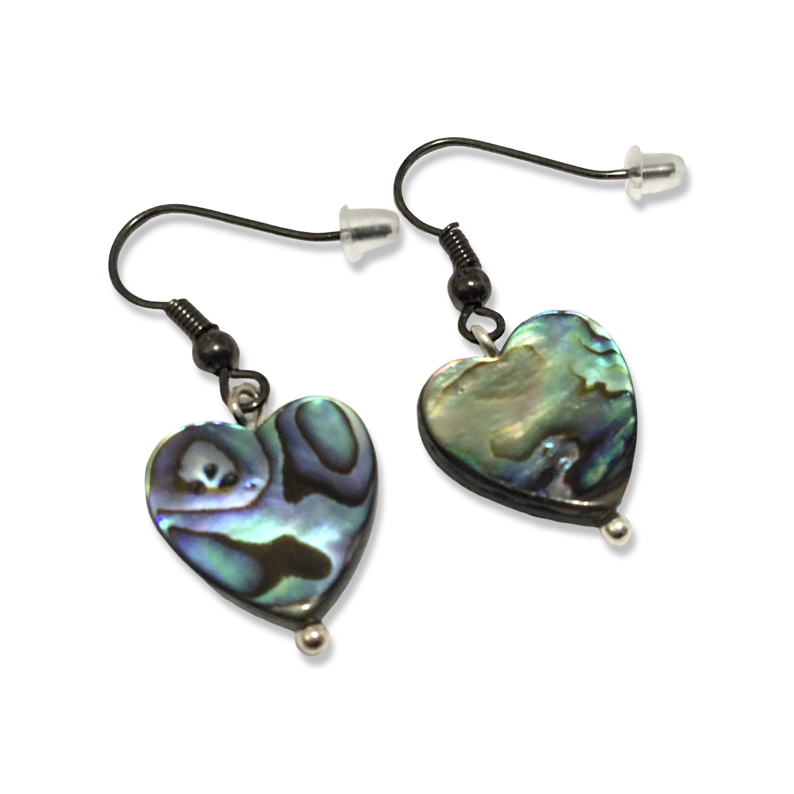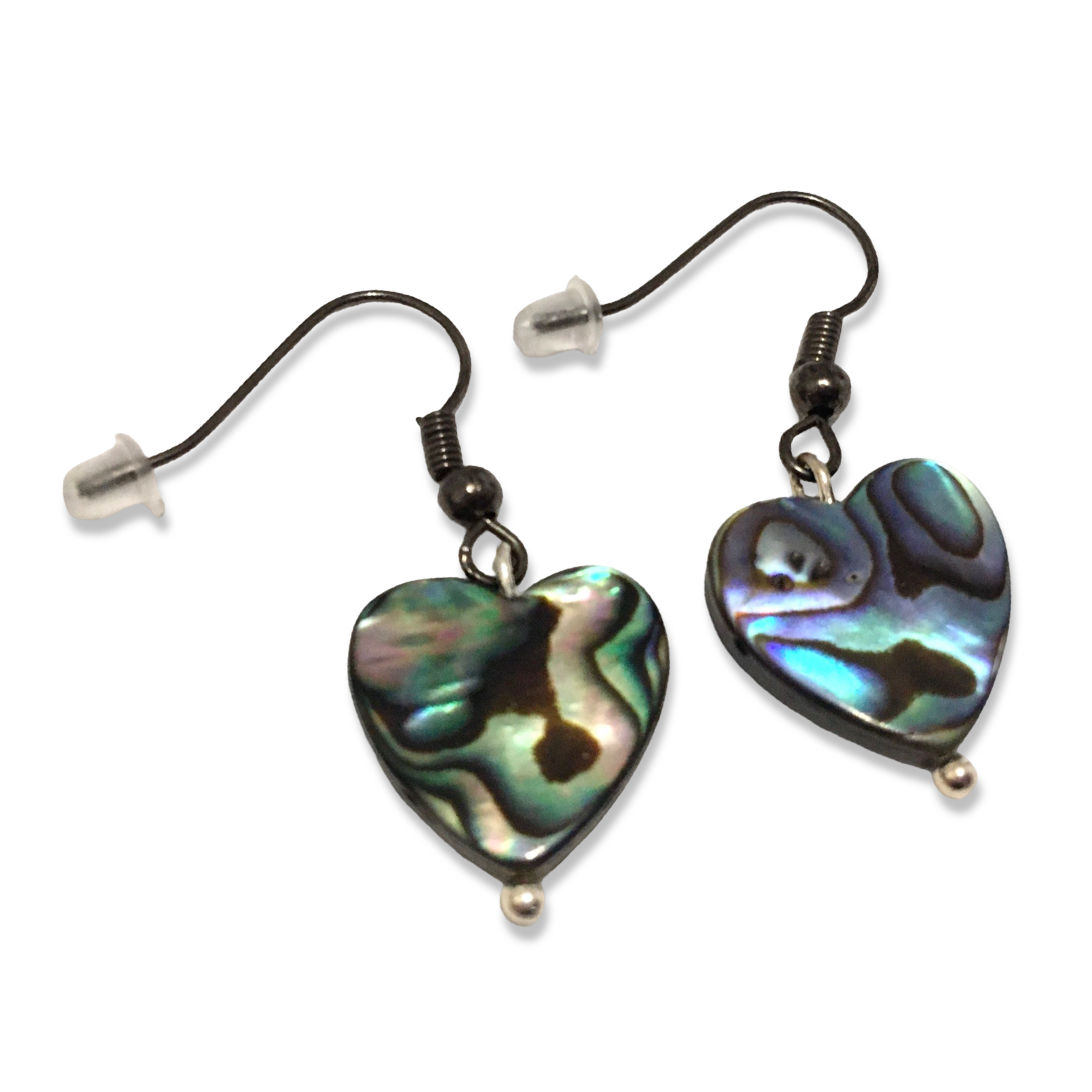 A simple pair of earrings made with abalone shell hearts and gunmetal hooks. Abalone mother of pearl has a beautiful, dreamy iridescence to it.