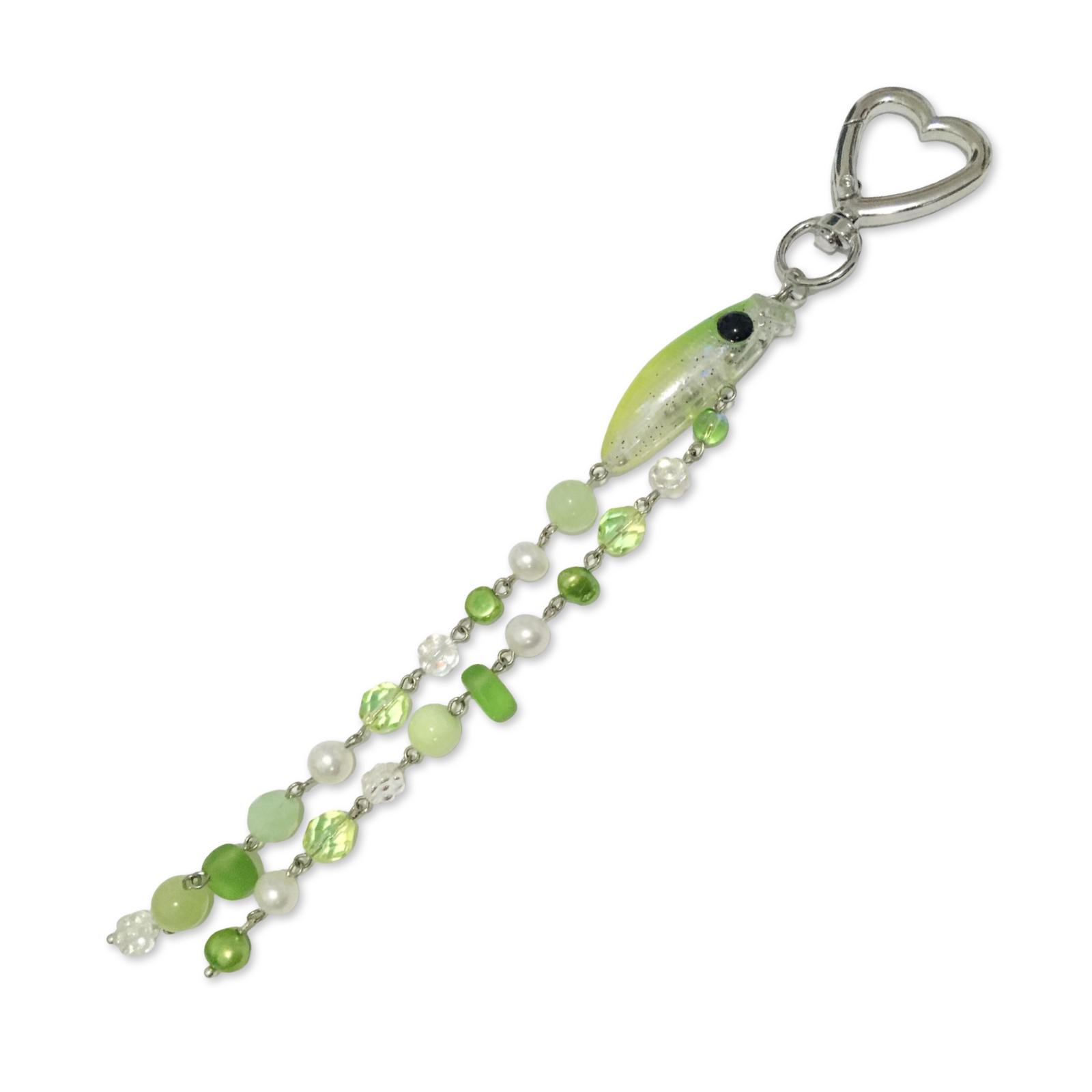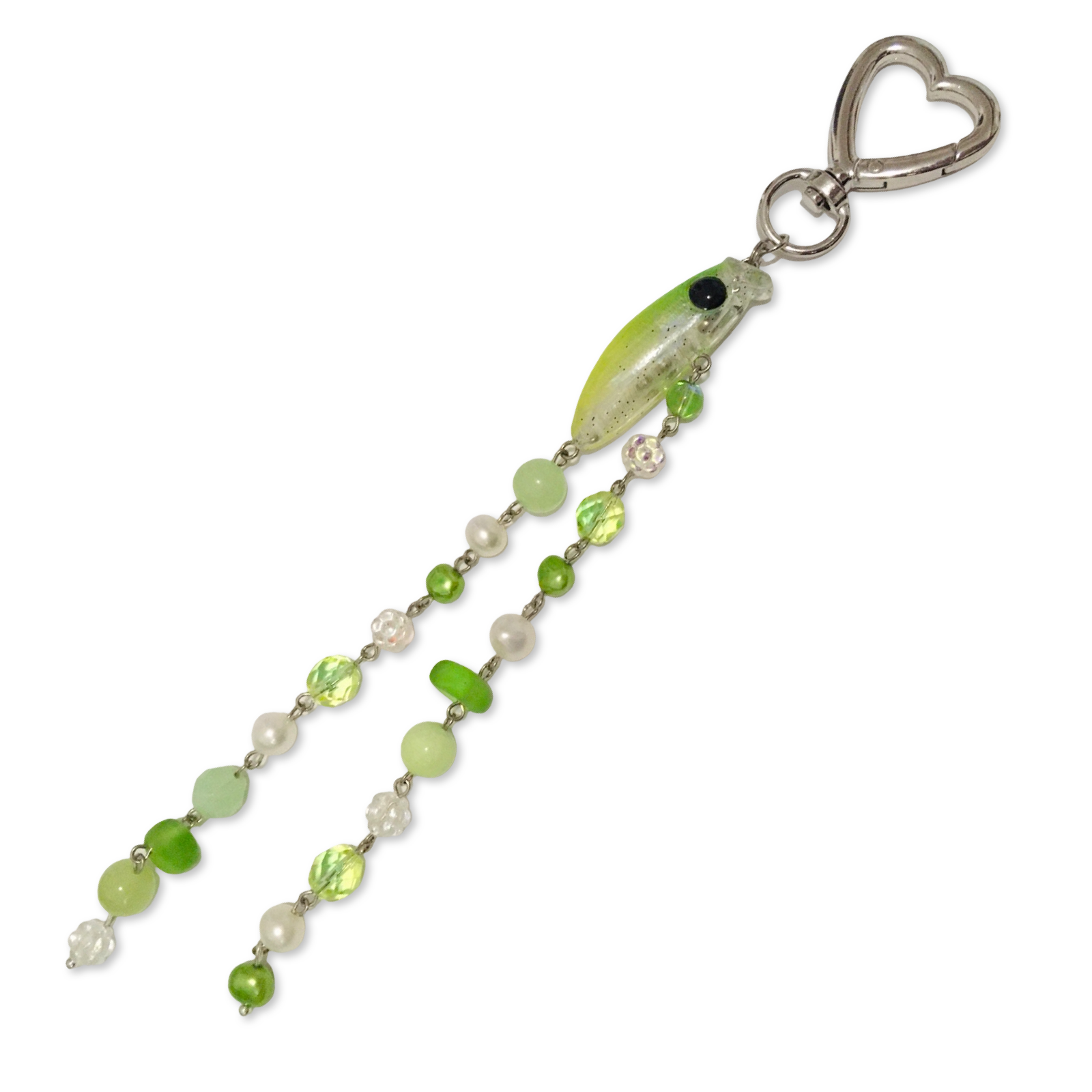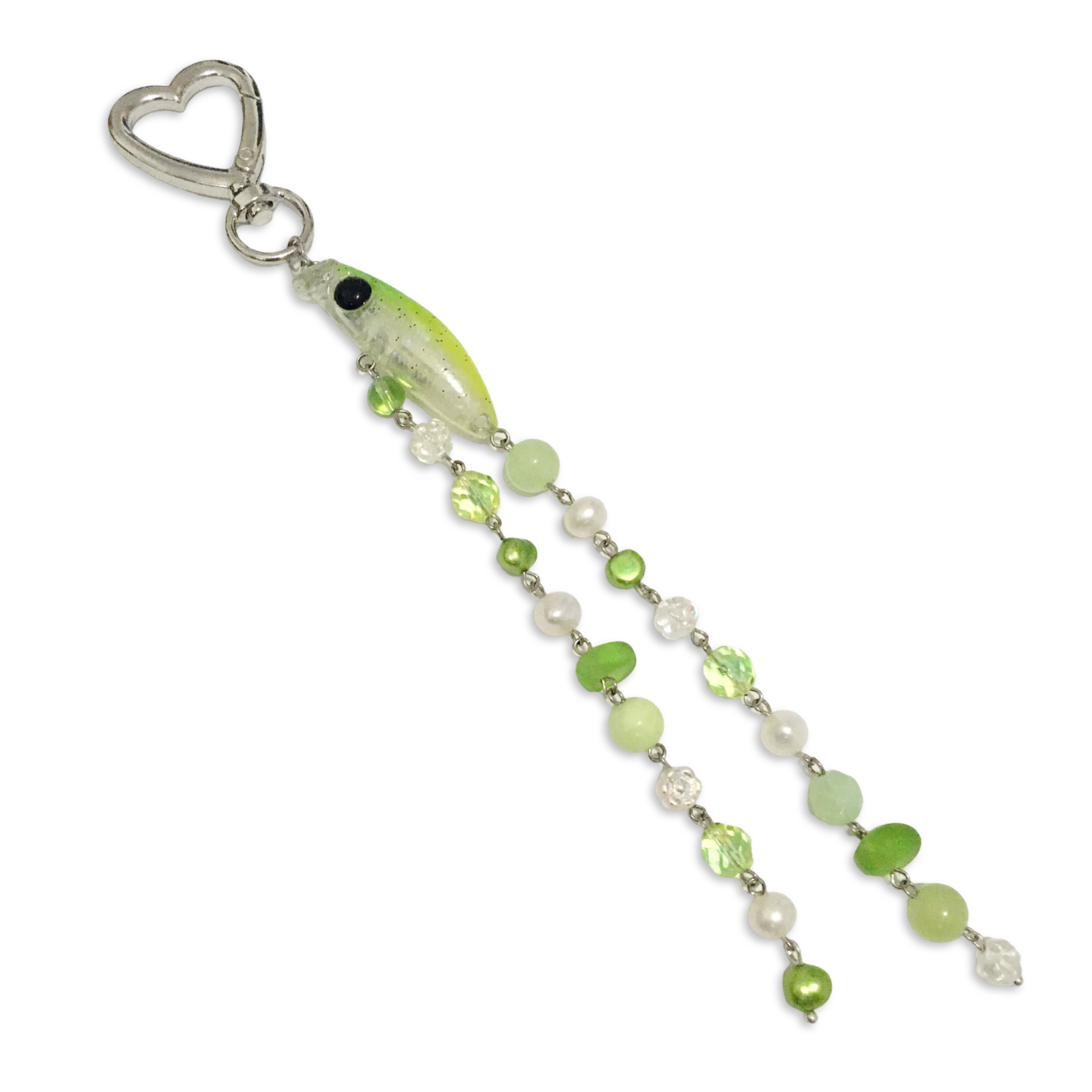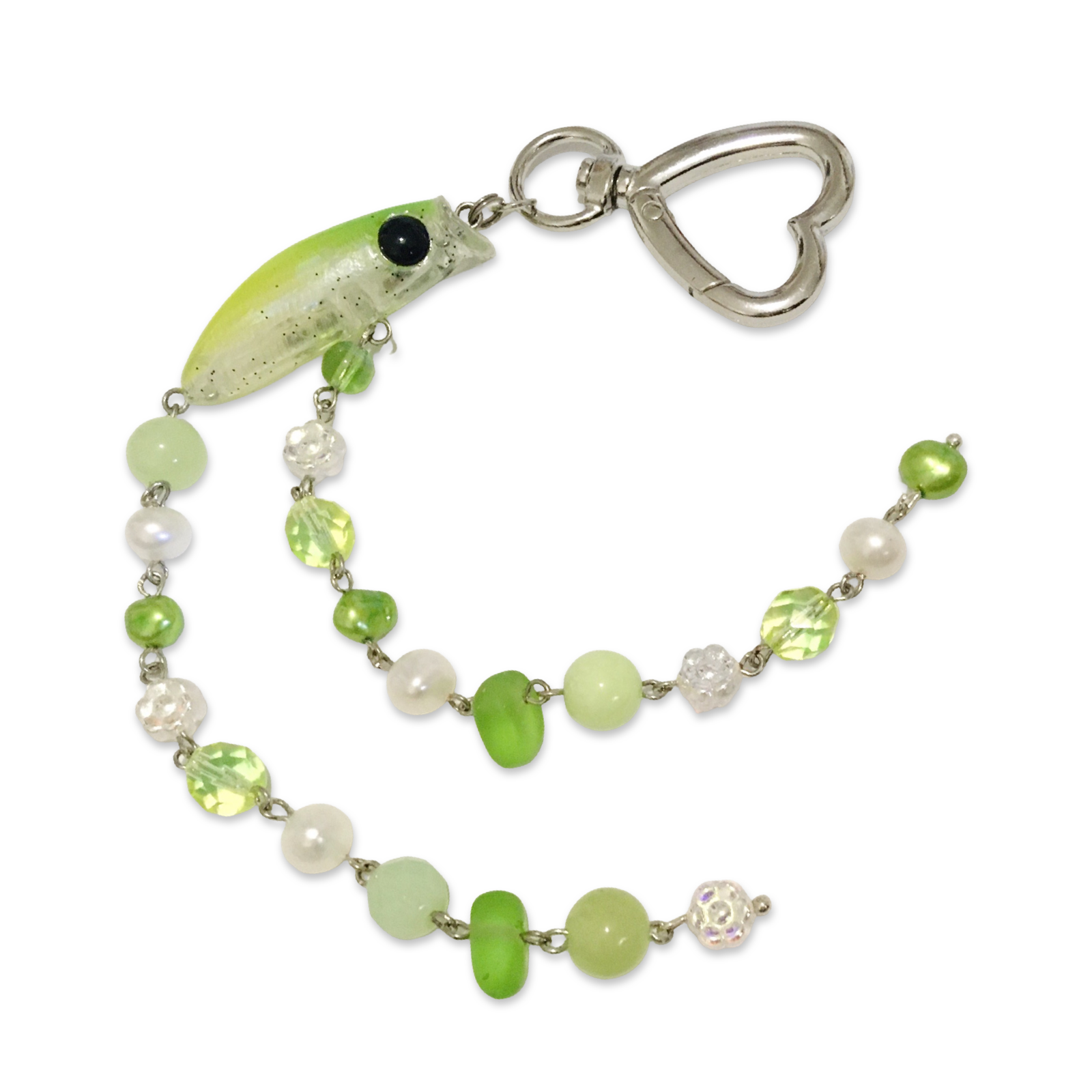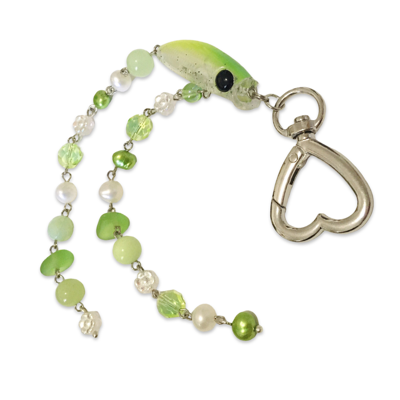 A handmade heart-carabiner charm featuring a lime green guppy fishing lure, freshwater pearls, sea glass, flower jade, and prismatic Czech glass beads.