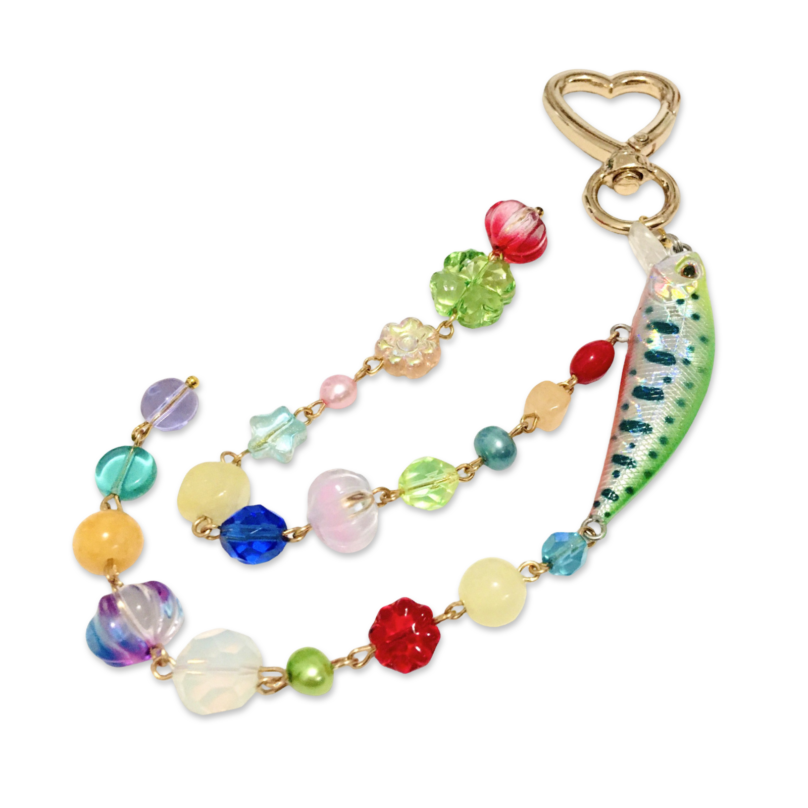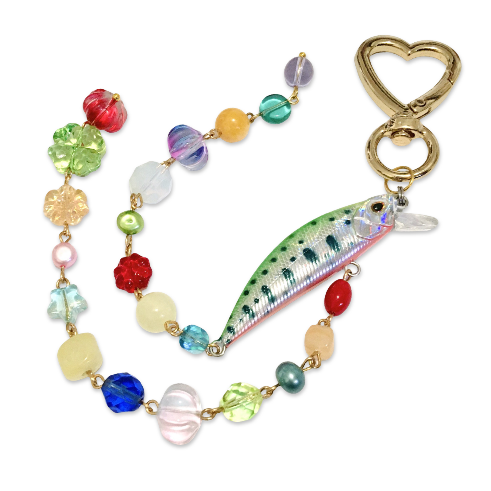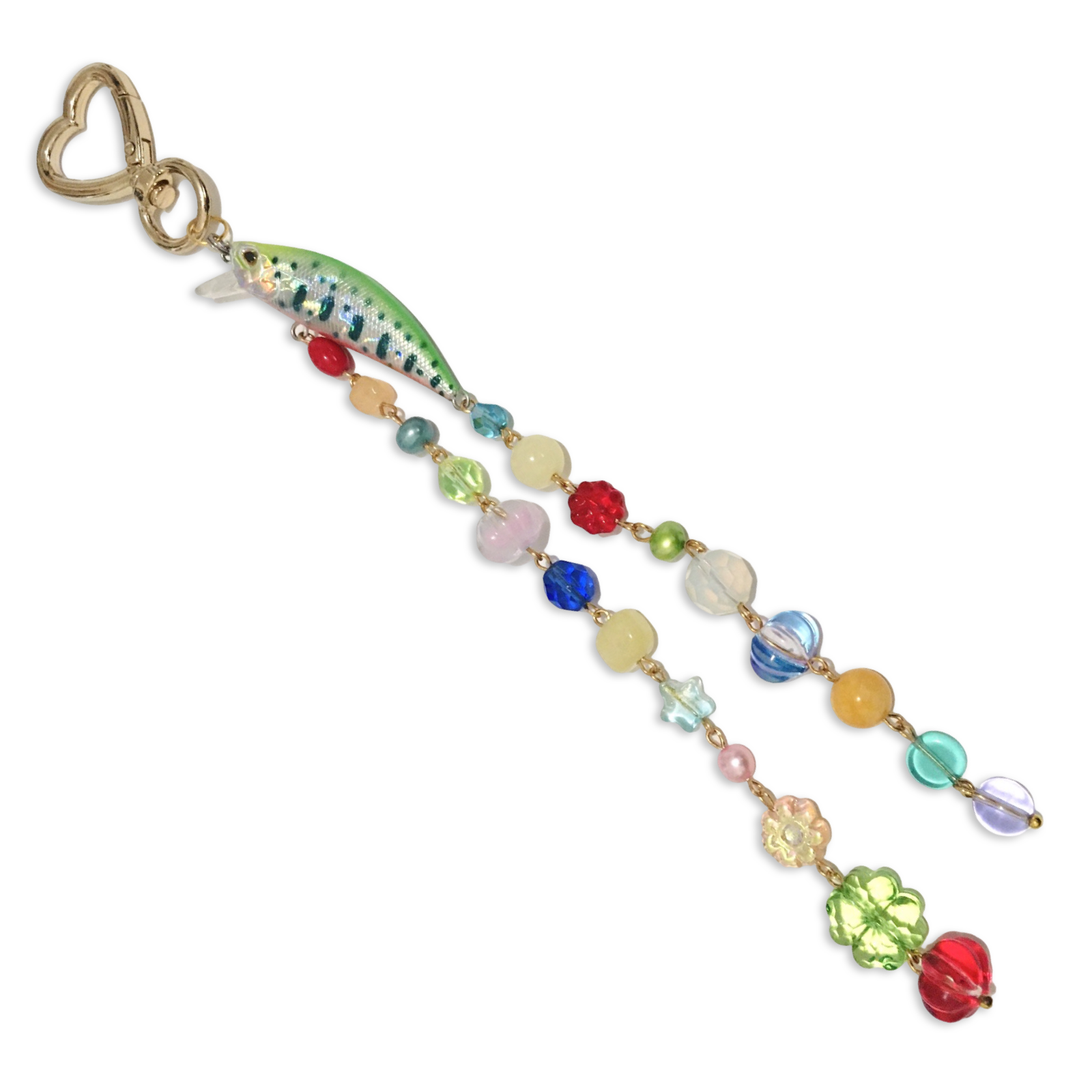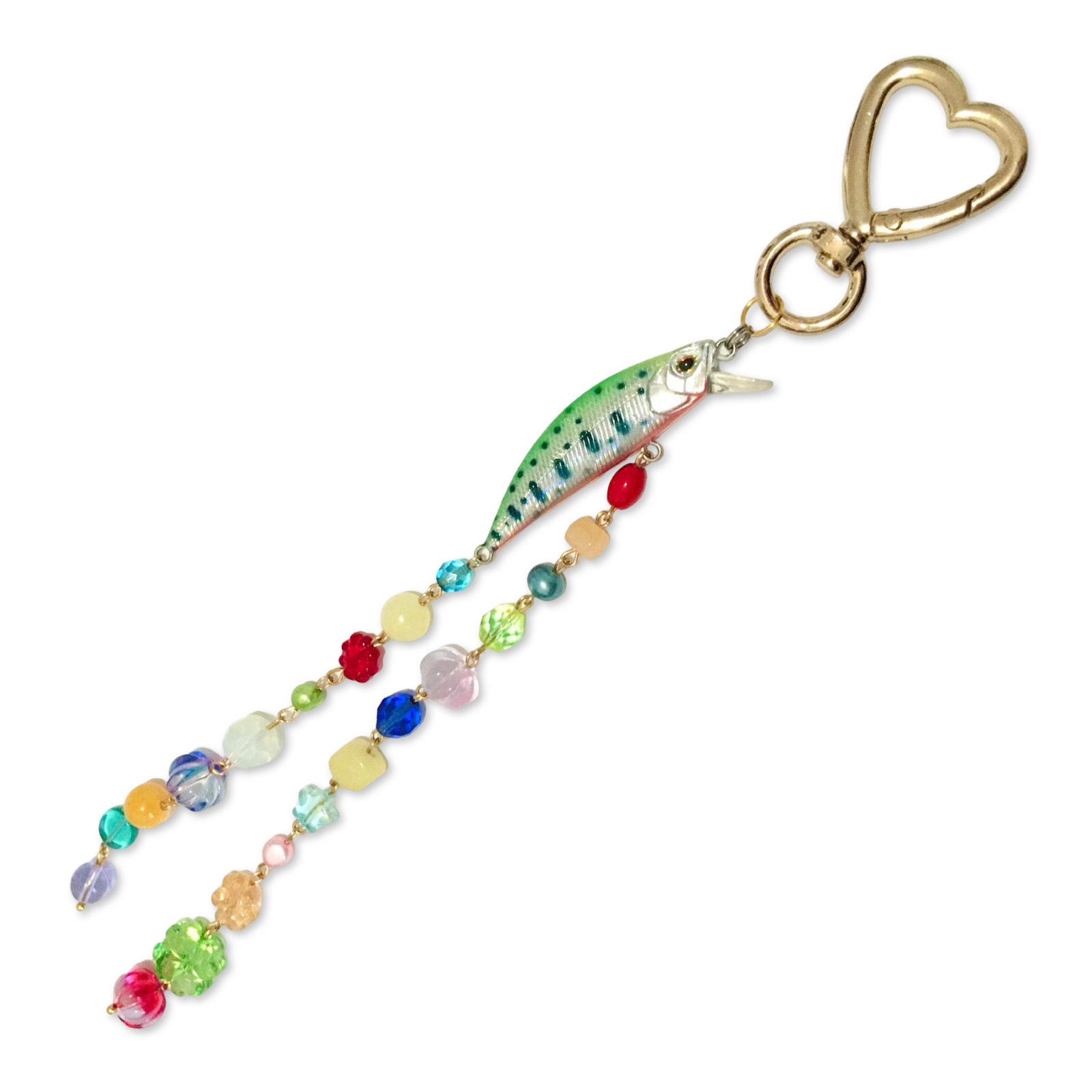 A handmade heart-carabiner charm featuring a holographic fishing lure and a rainbow mix of freshwater pearls, Czech glass, stone, and plastic beads.