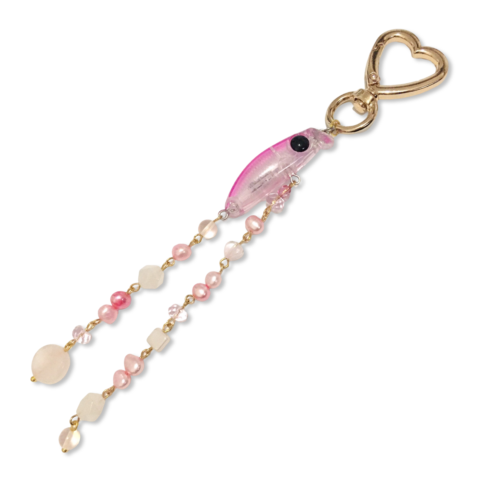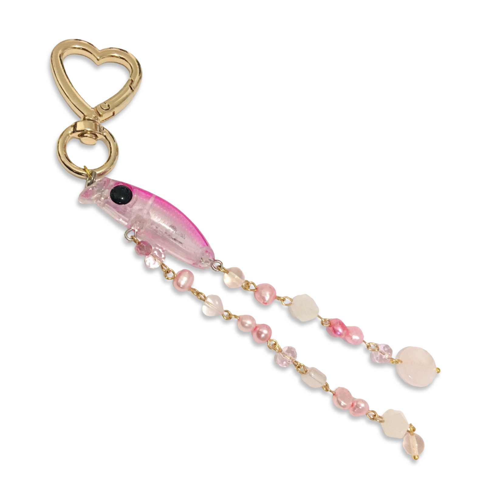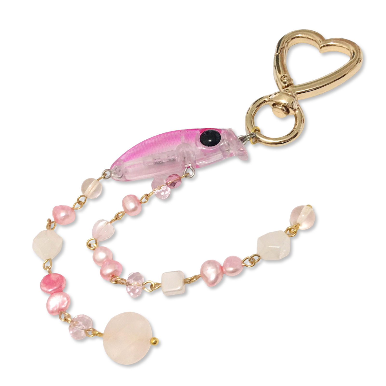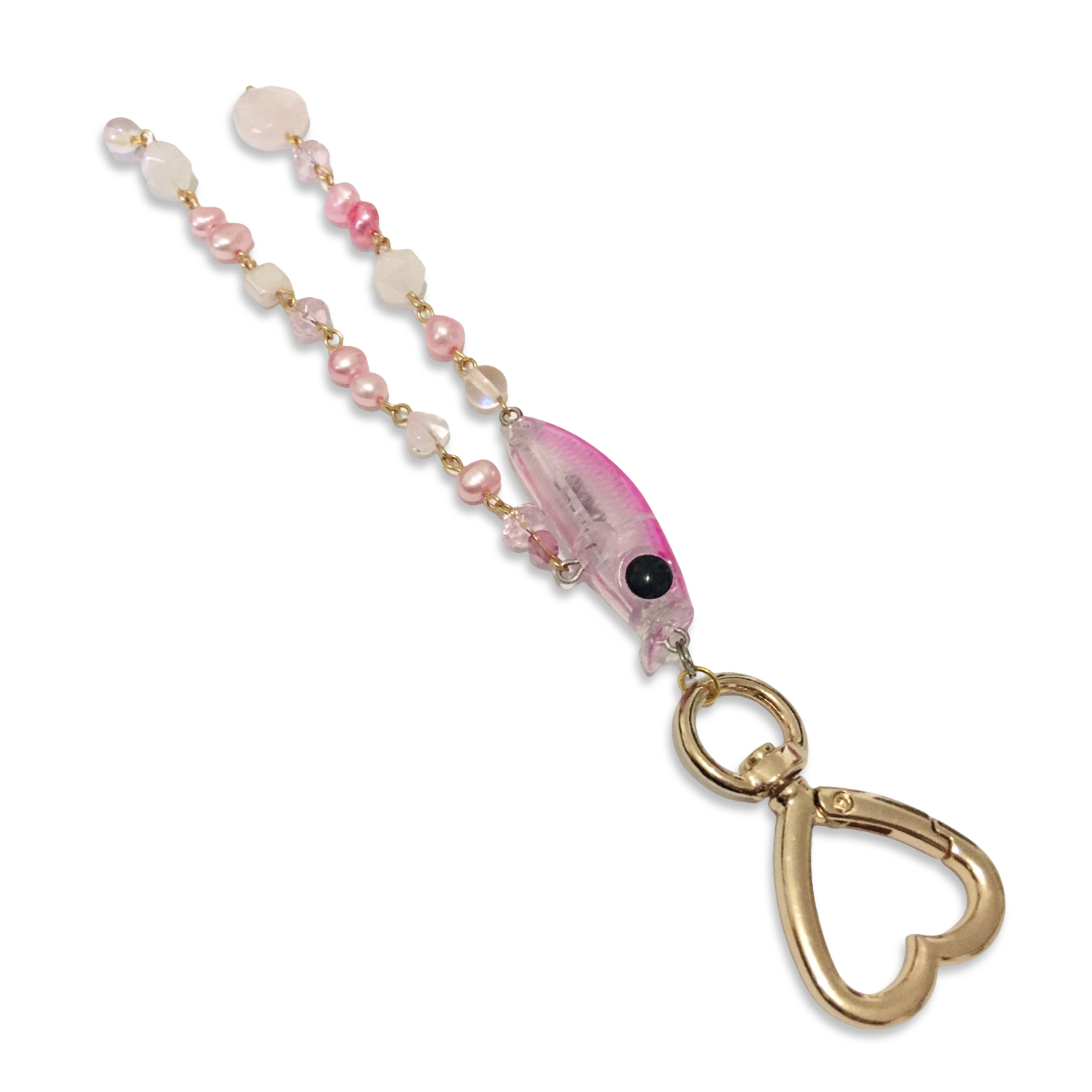 A handmade heart-carabiner charm featuring a pink guppy fishing lure, pink freshwater pearls, and assorted Czech glass and rose quartz beads.