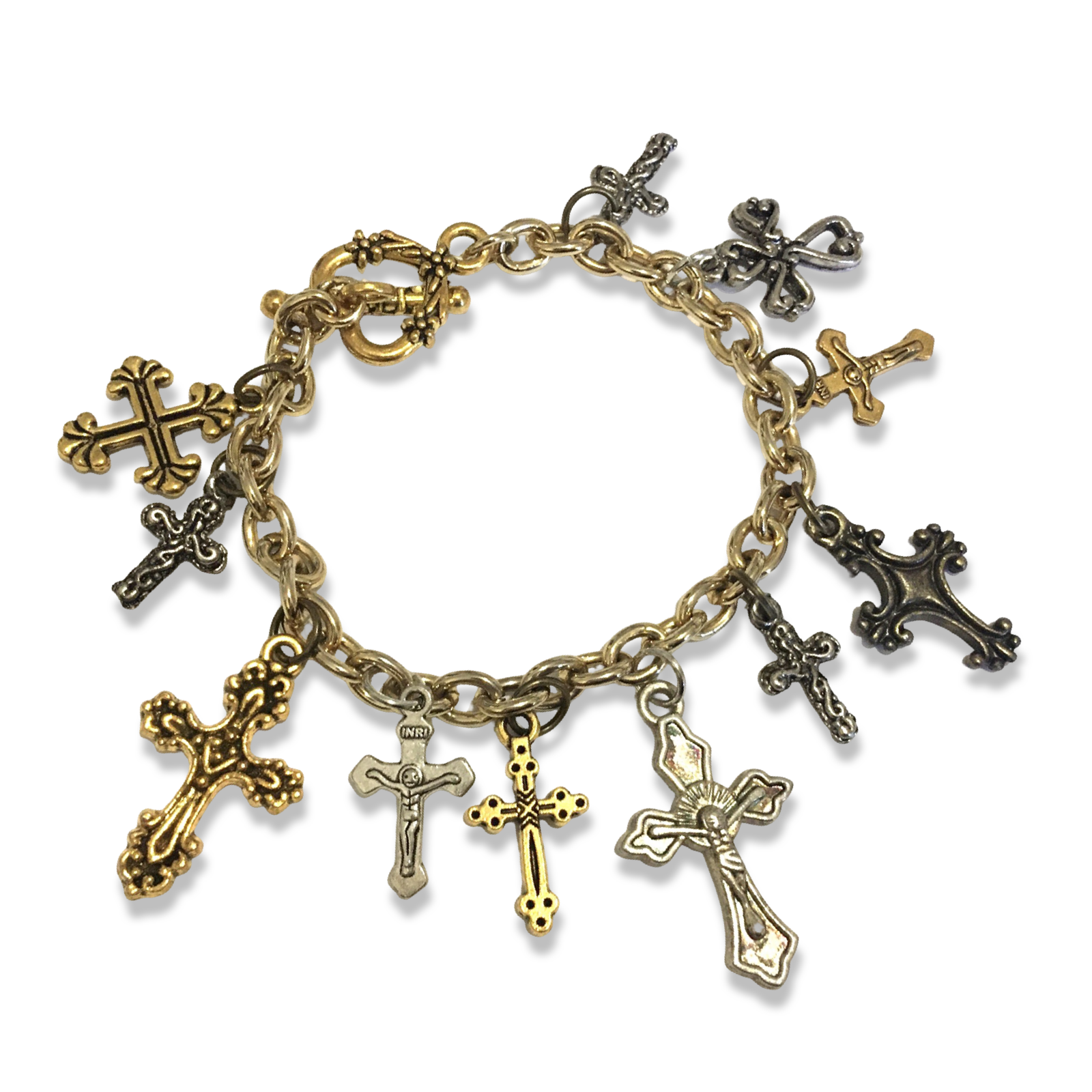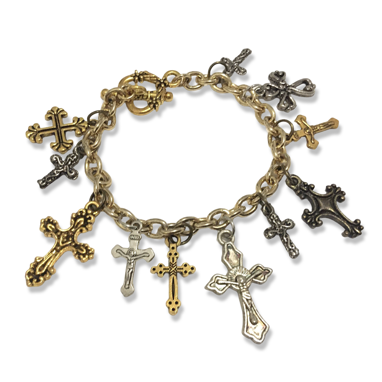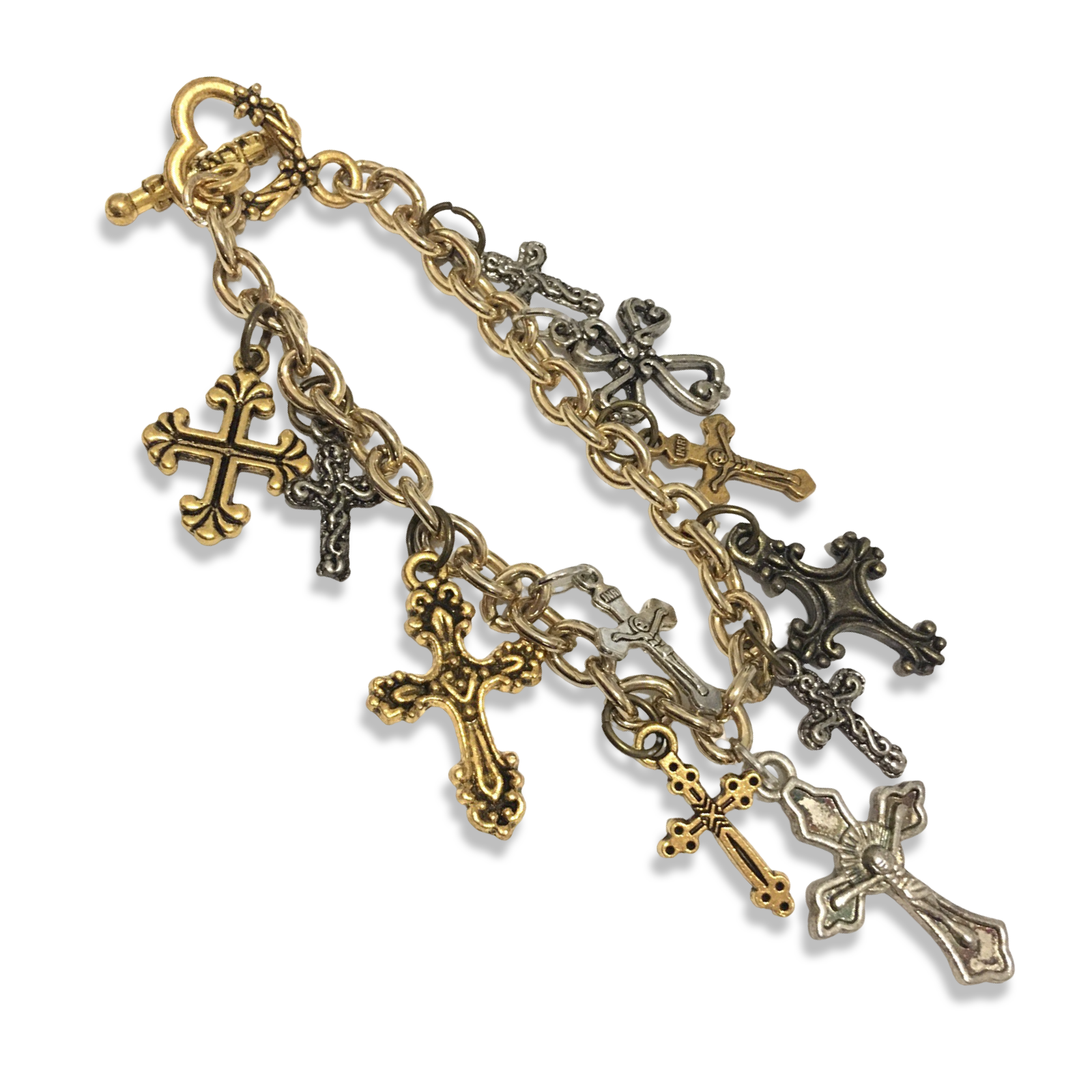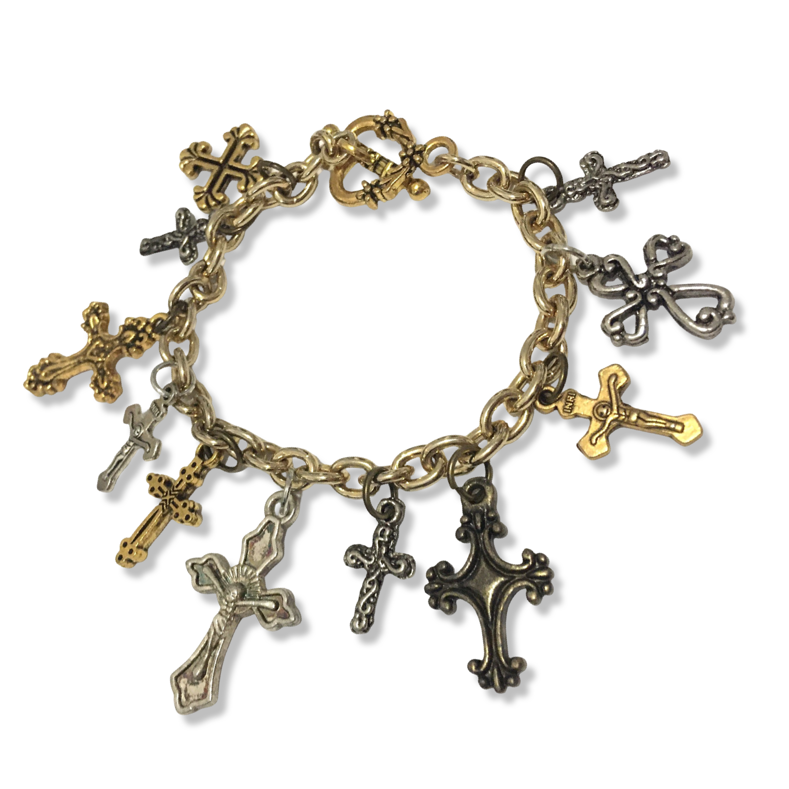 A handmade charm bracelet made from a broken bracelet chain and an assortment of salvaged metal crosses.