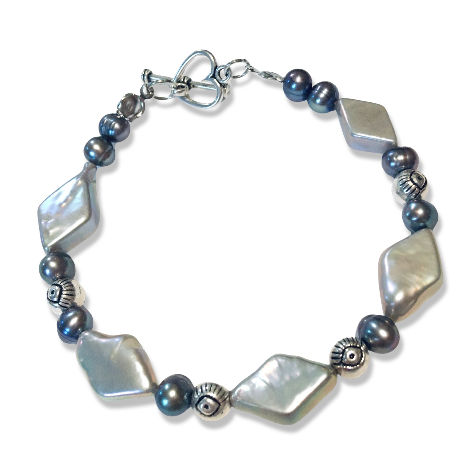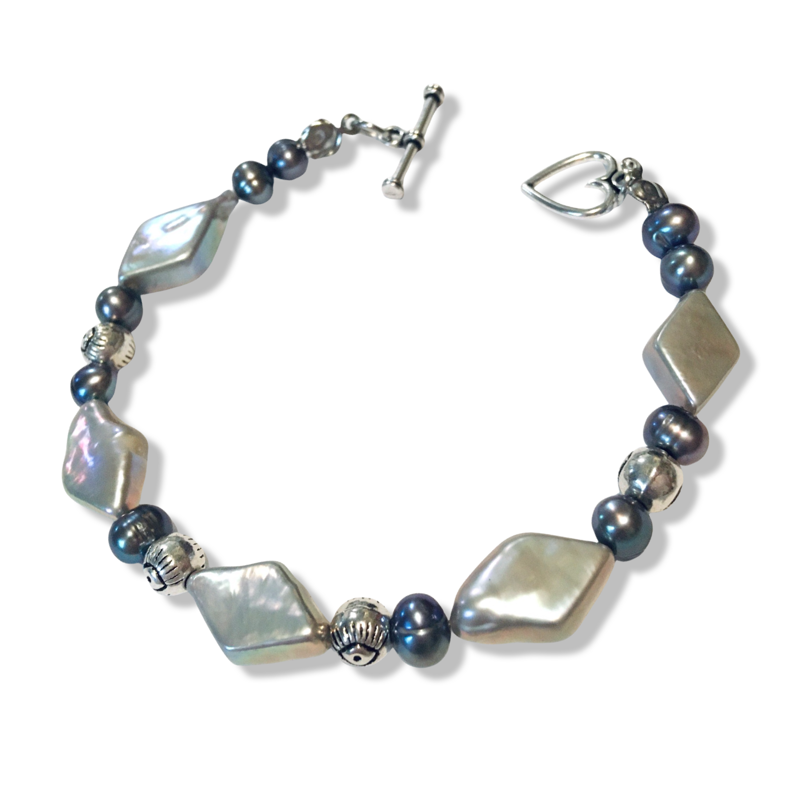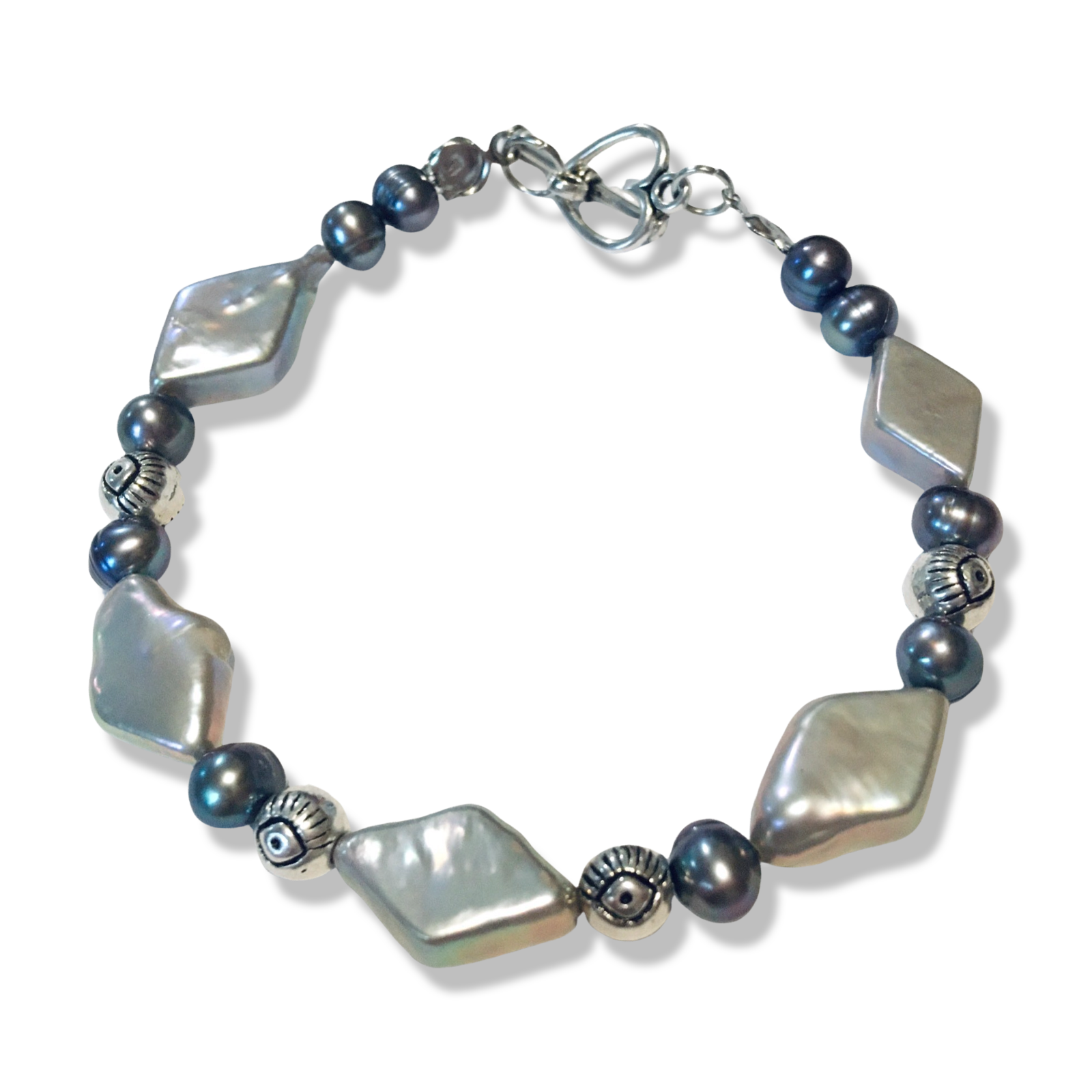 A handmade 7" bracelet made from baroque diamond freshwater pearls, iris-luster black pearls, and deadstock metal eyes. Free US shipping!